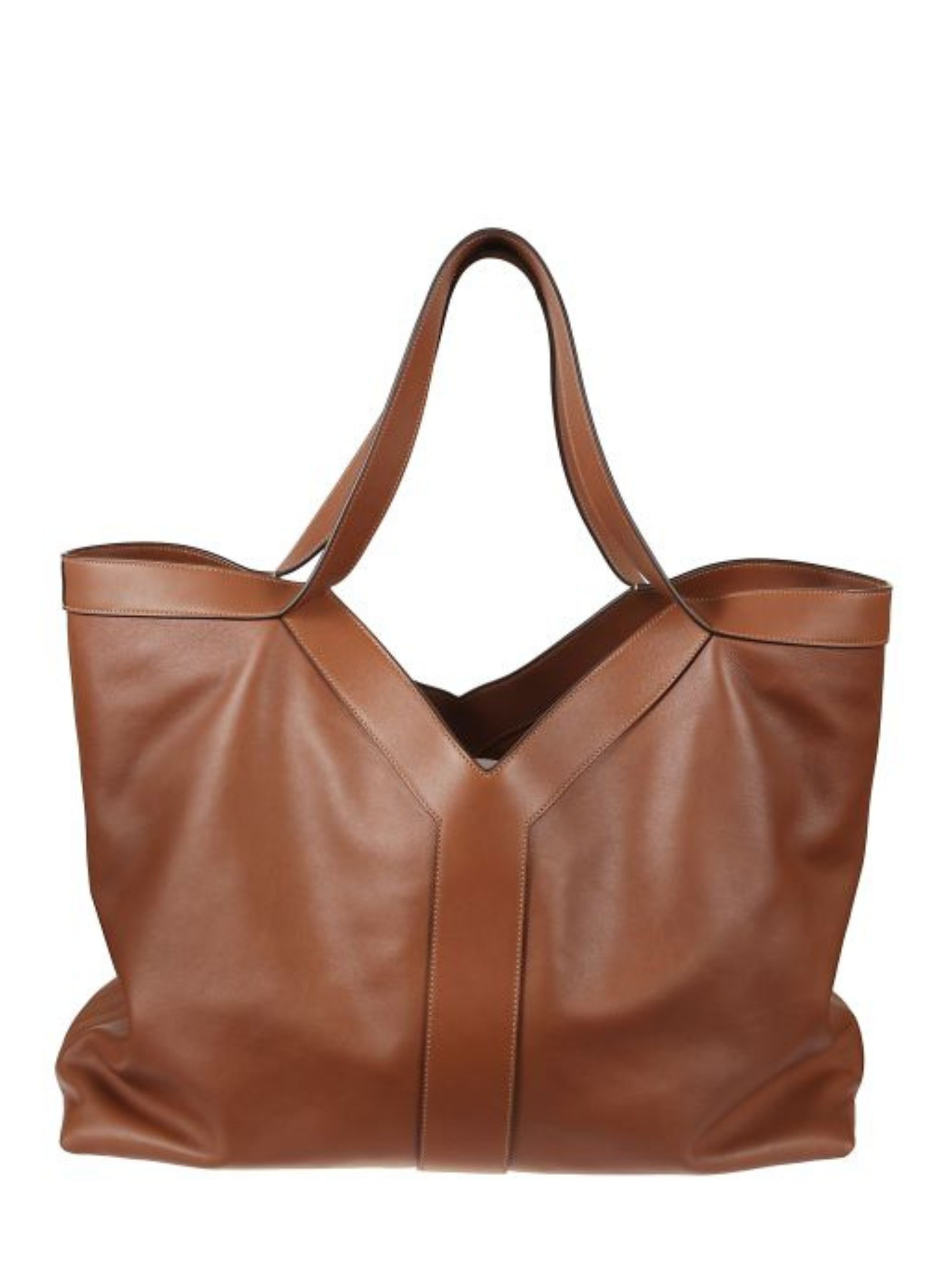 SAINT LAURENT large brown leather Y tote bag featuring an archive-inspired Y signature, suede lining, an internal zip pocket, and a hook closure. Dimensions: 46 x 38 x 18 cm.