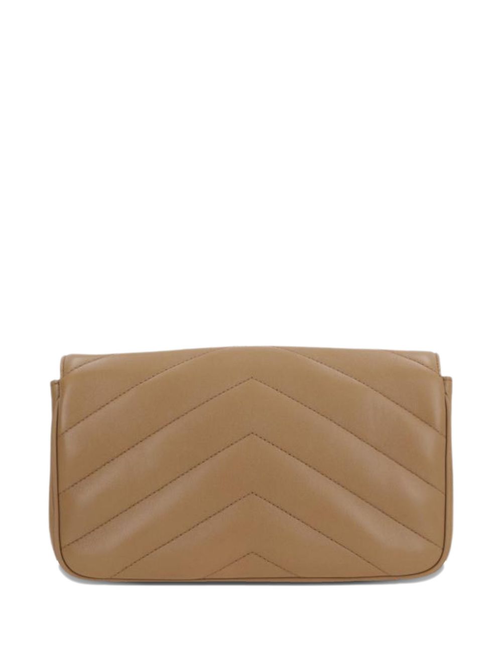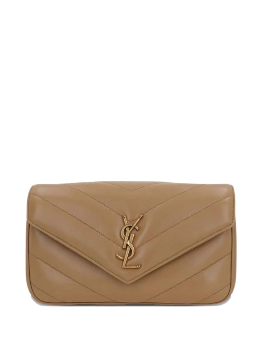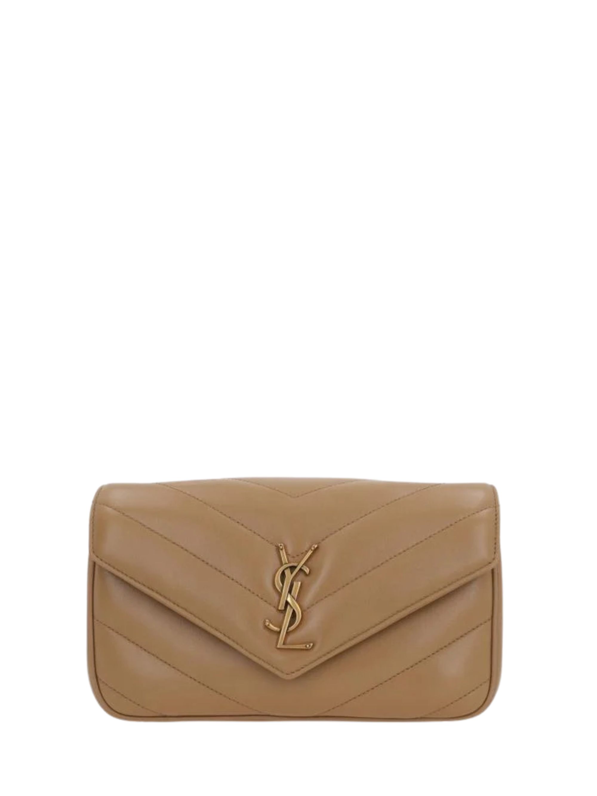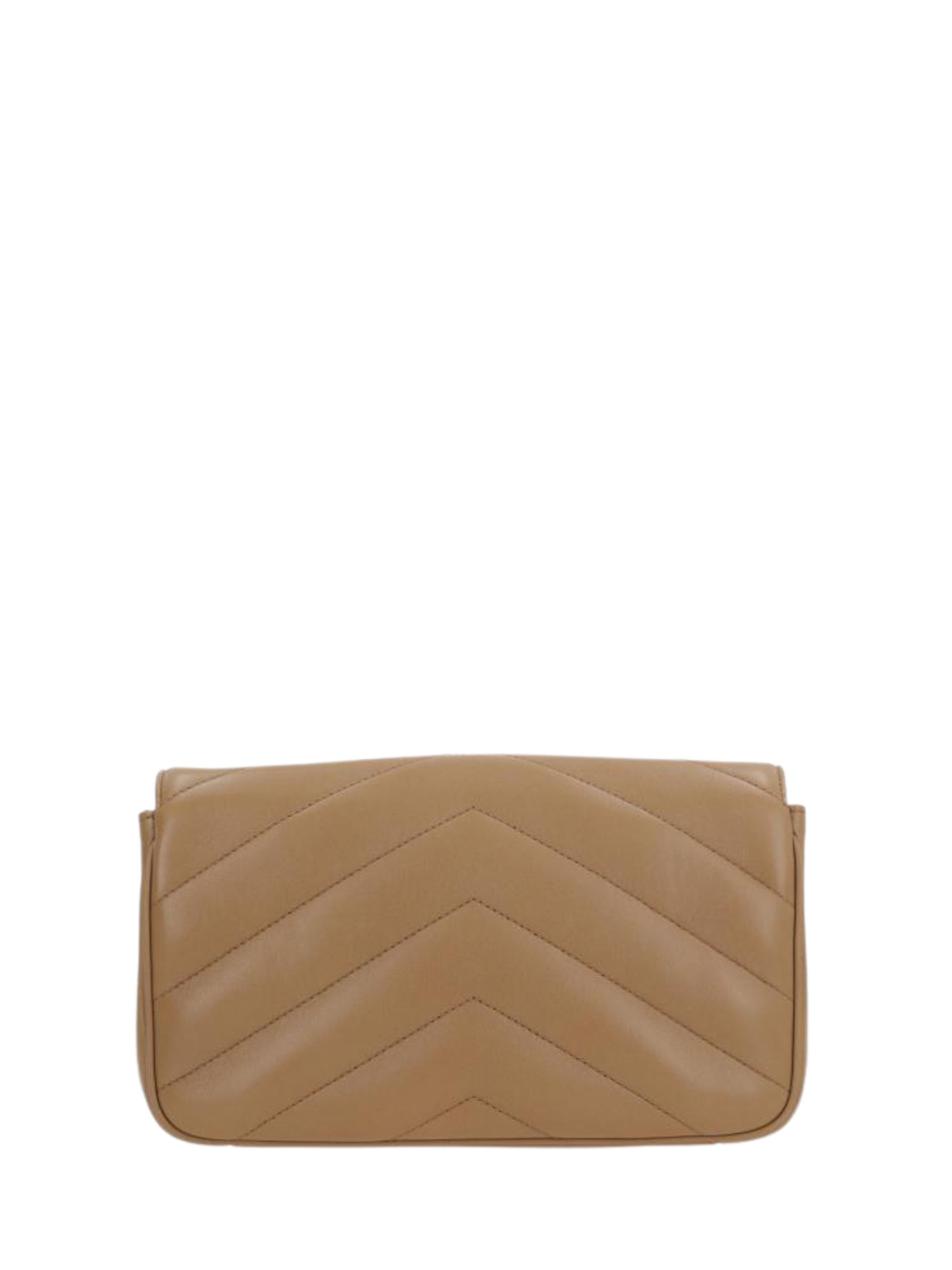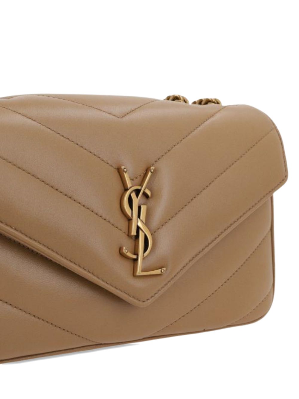 SAINT LAURENT small LouLou bag in brown quilted leather, featuring cronzo-colored hardware, a sliding chain shoulder strap, YSL signature, and a magnetic closure. Dimensions: 24 x 14 x 6 cm.