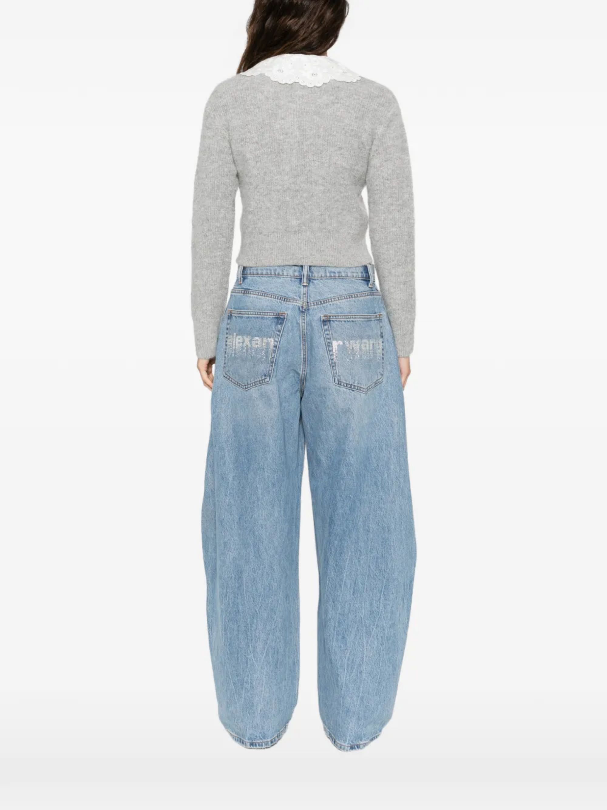 SELF PORTRAIT light gray wool button cardigan with a white collar, patch pockets, and a jeweled button closure.