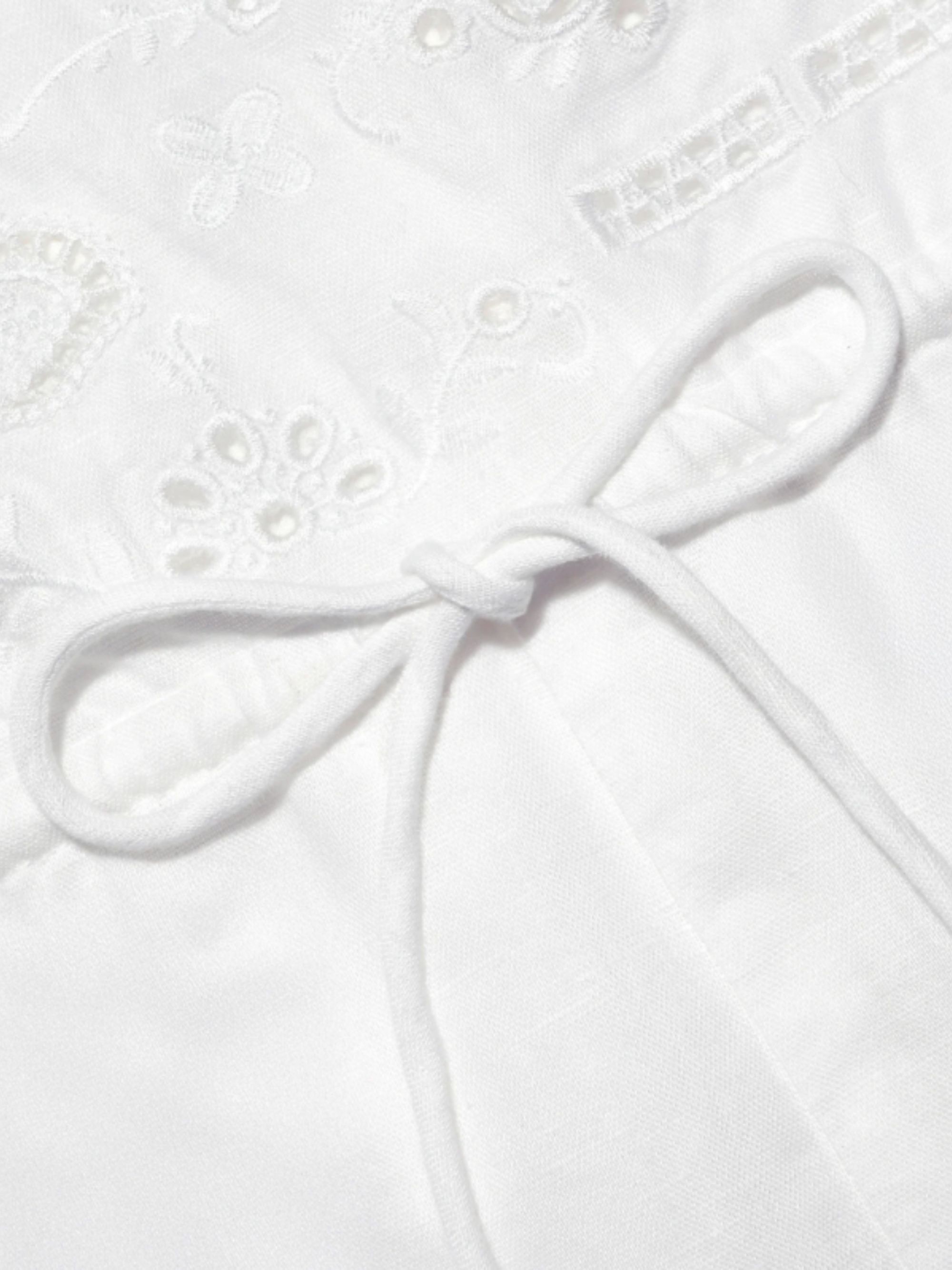 White cotton bodysuit by SELF PORTRAIT featuring elasticated waist with drawstring, detailed straps and back button closure.