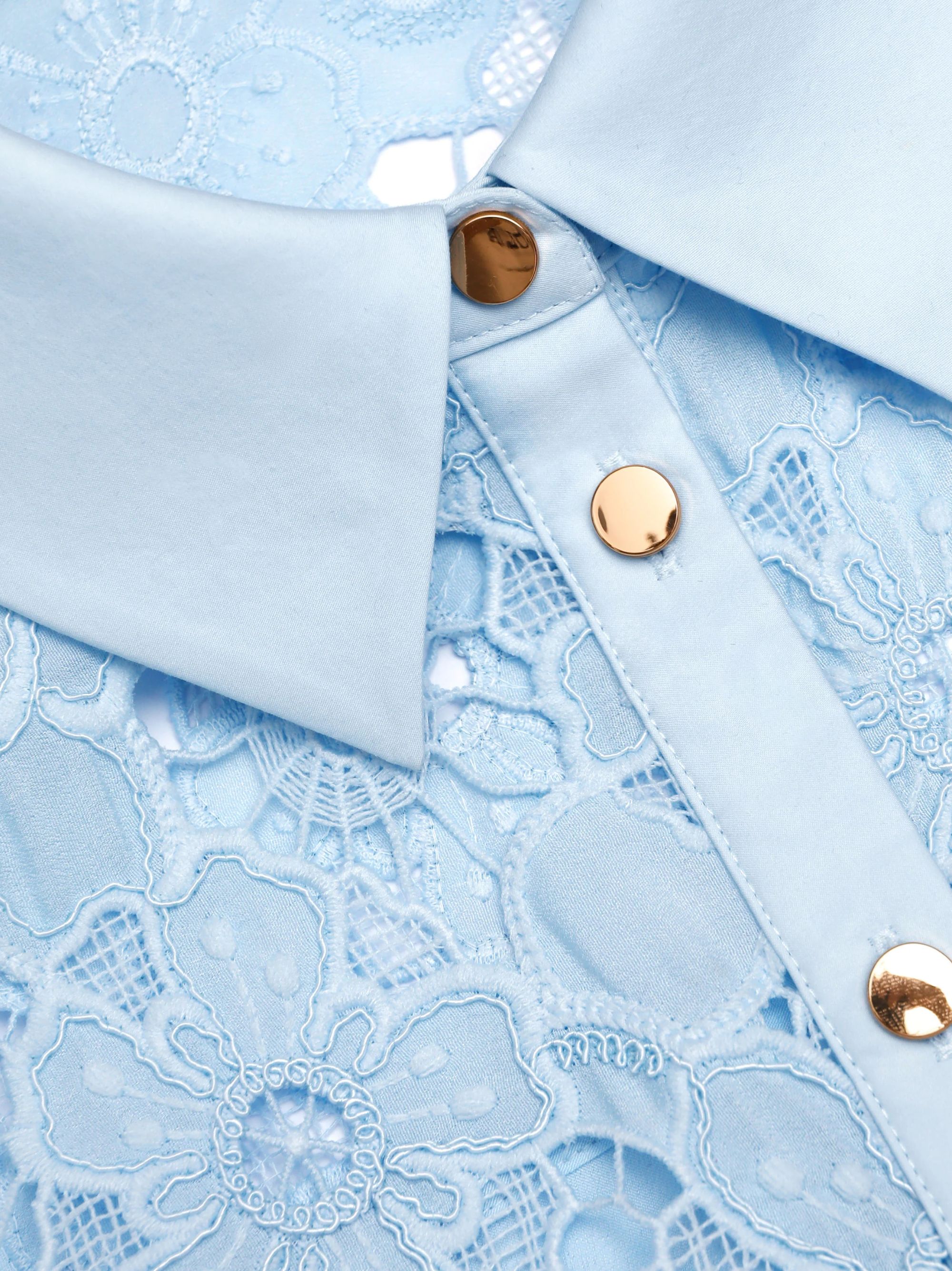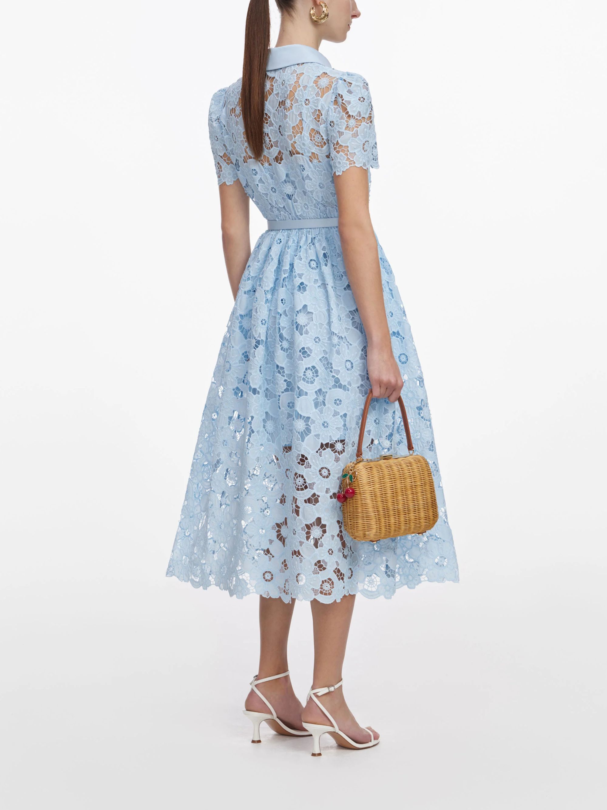 Light blue midi dress by SELF PORTRAIT featuring fixed belt, floral pattern and gold button closure.