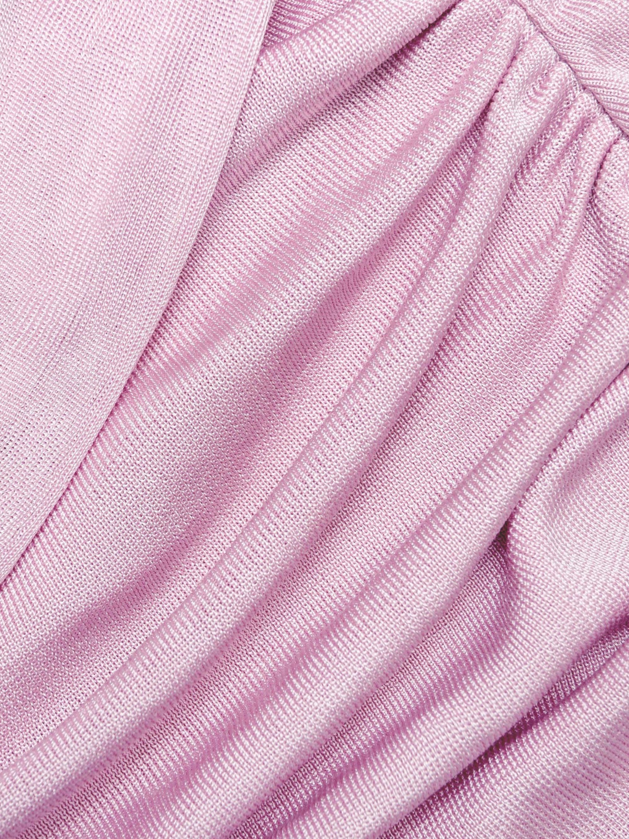 SELF PORTRAIT pink knit midi dress with rhinestone embellishments, short sleeves, chest pockets, removable shoulder pads, and jeweled buttons.