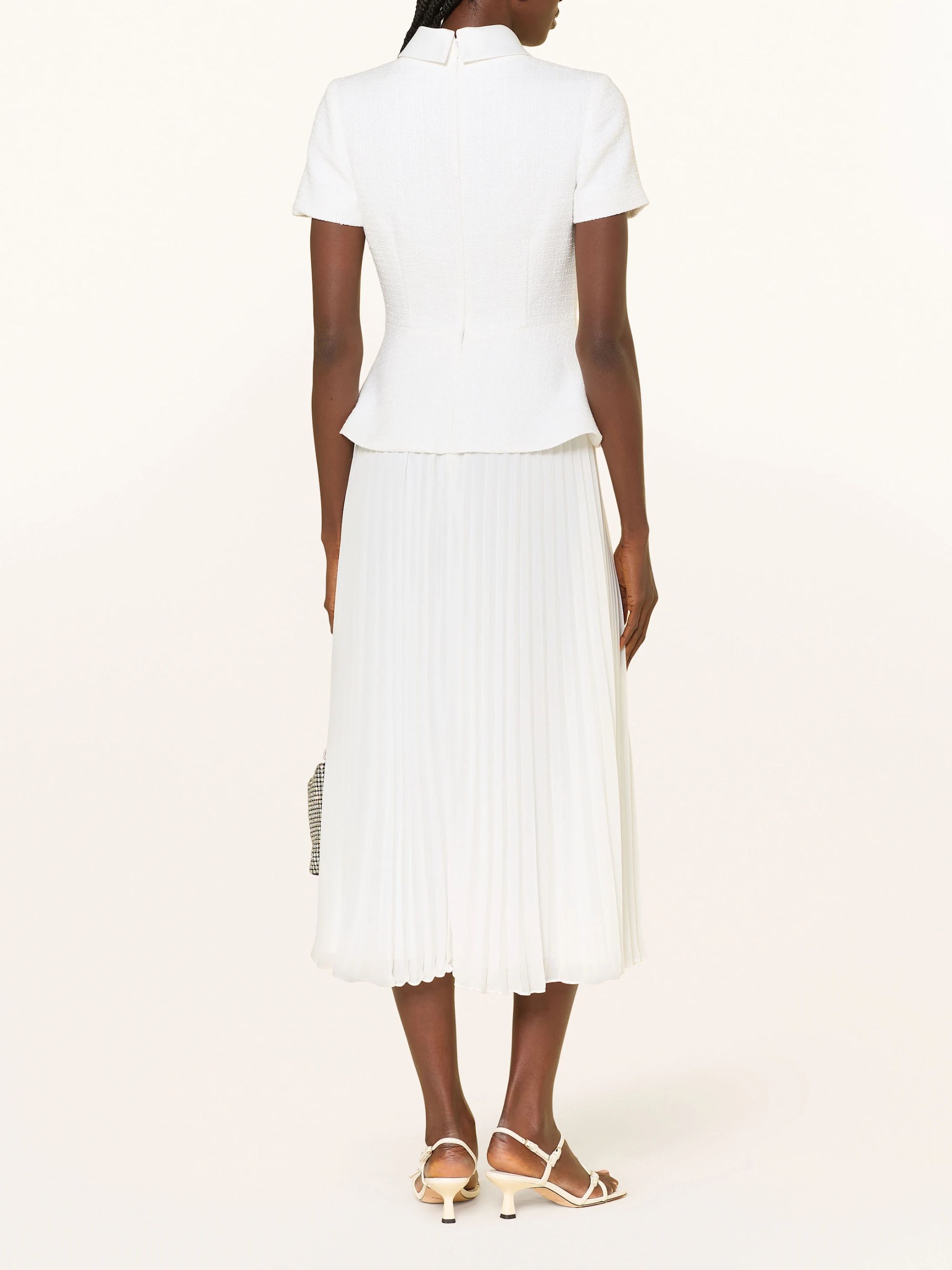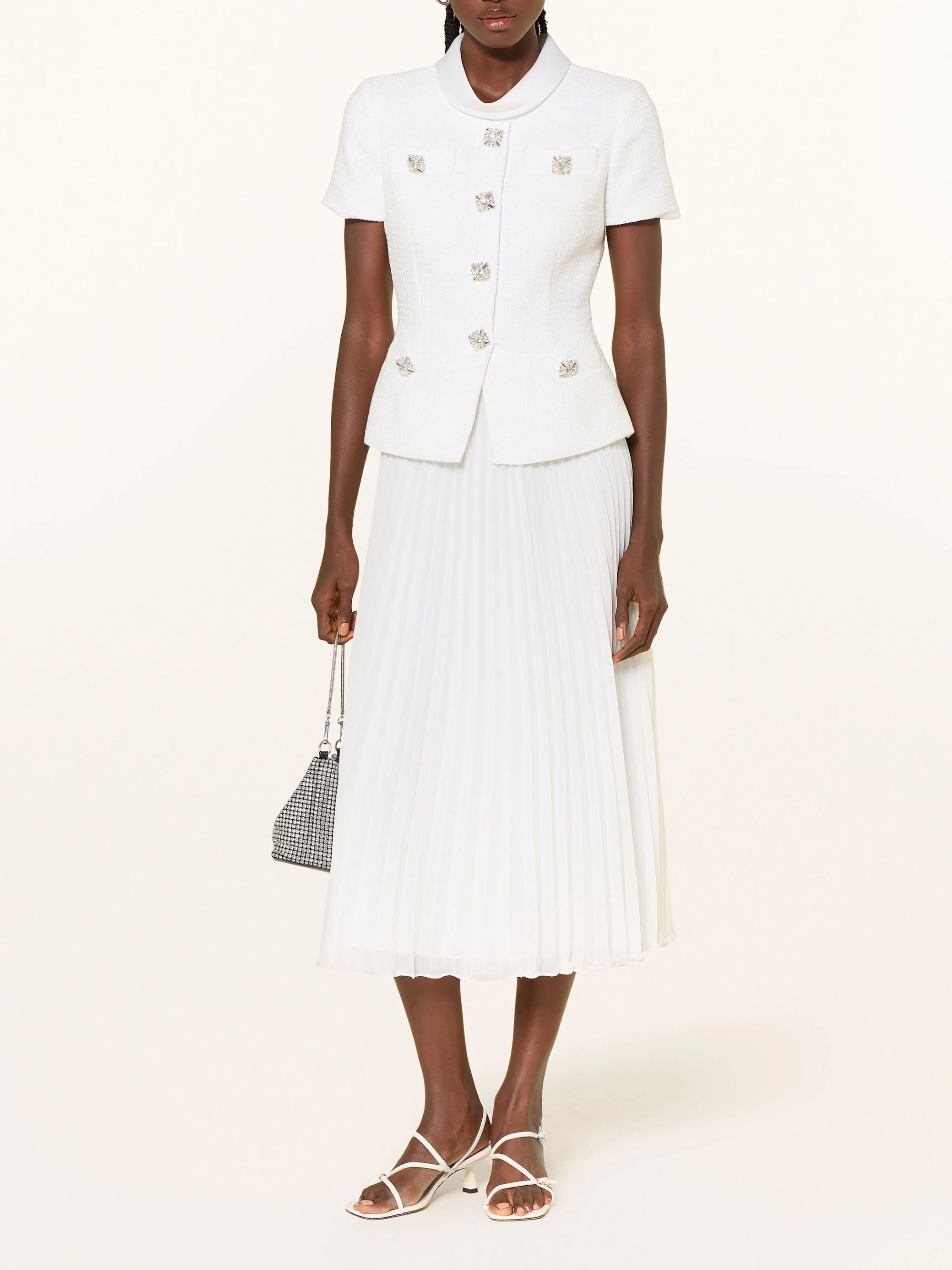 SELF PORTRAIT white midi dress with short sleeves, a pleated midi skirt, patch pockets, and a jeweled button closure.