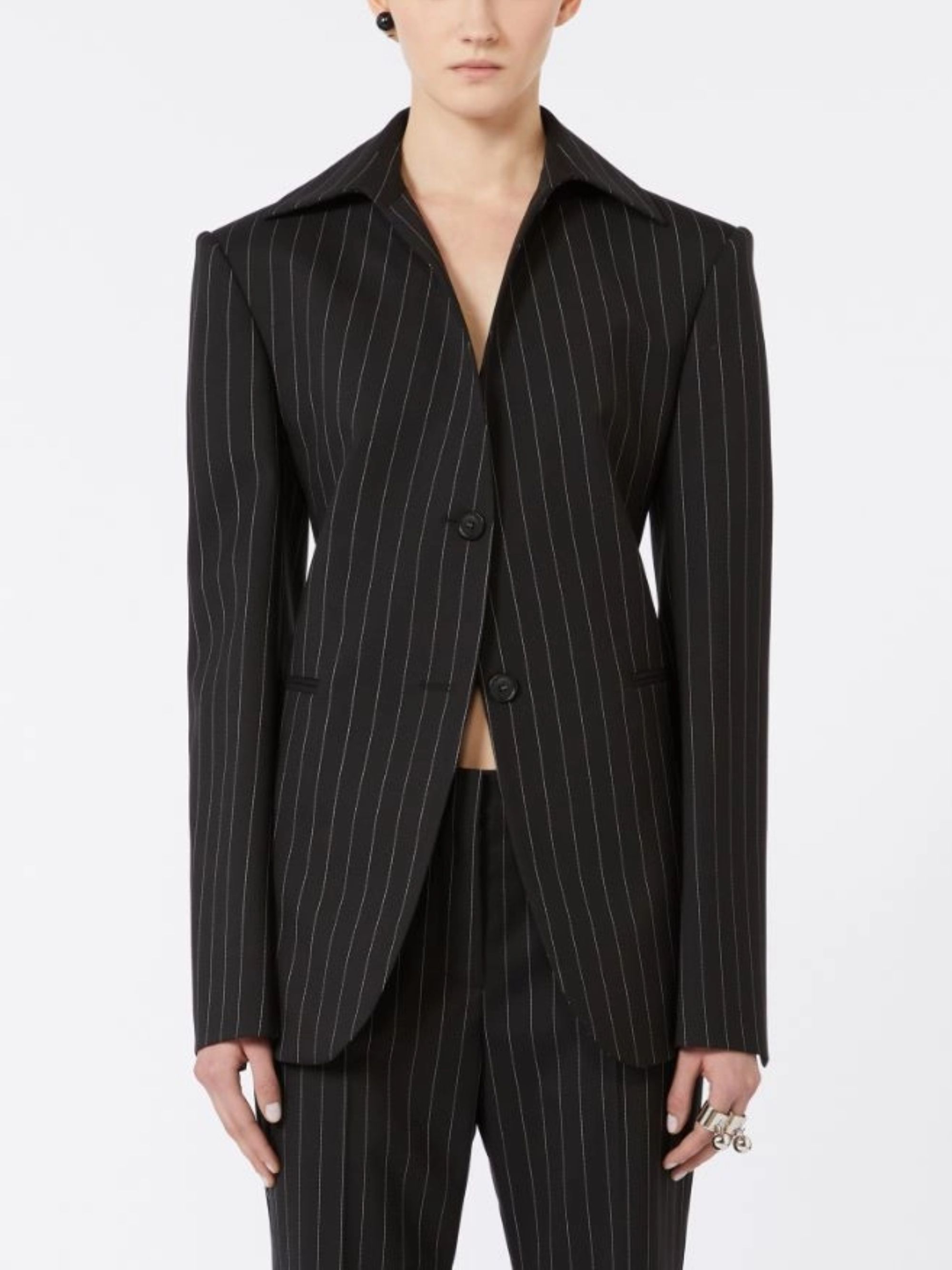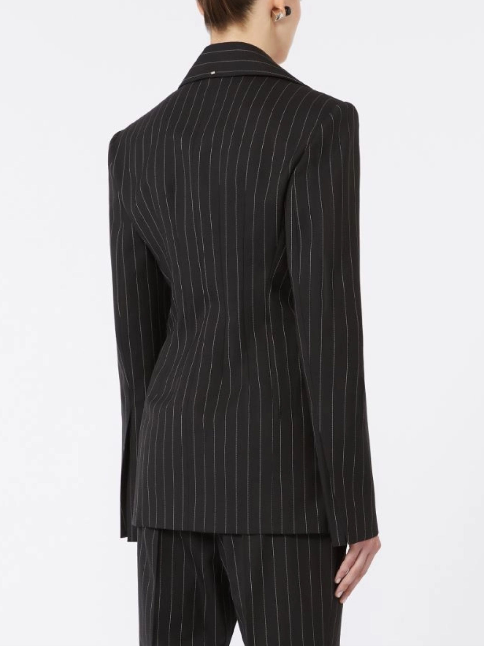 Black SPORTMAX jacket featuring pinstripe pattern, single waist button, shirt collar and back darts.