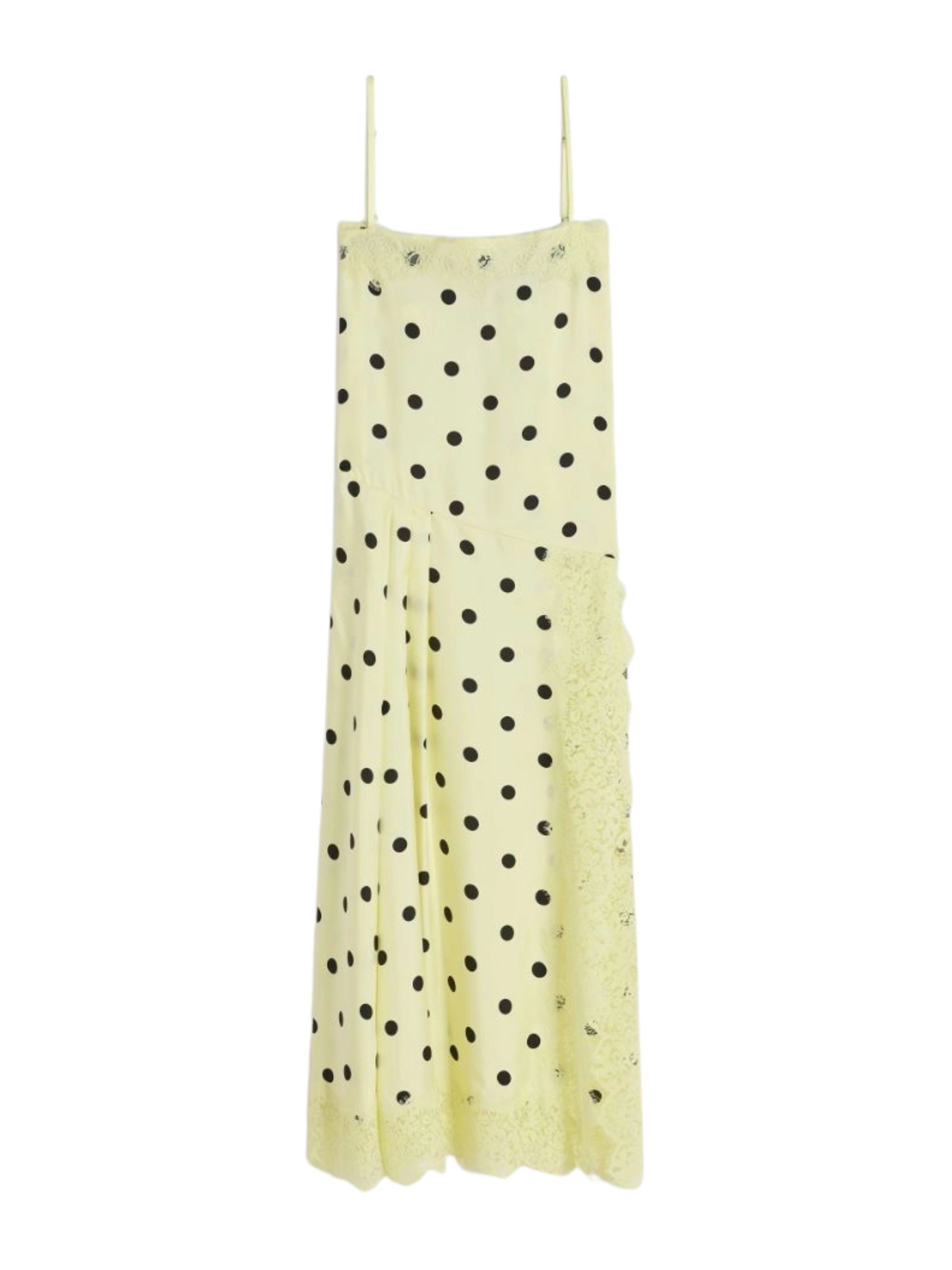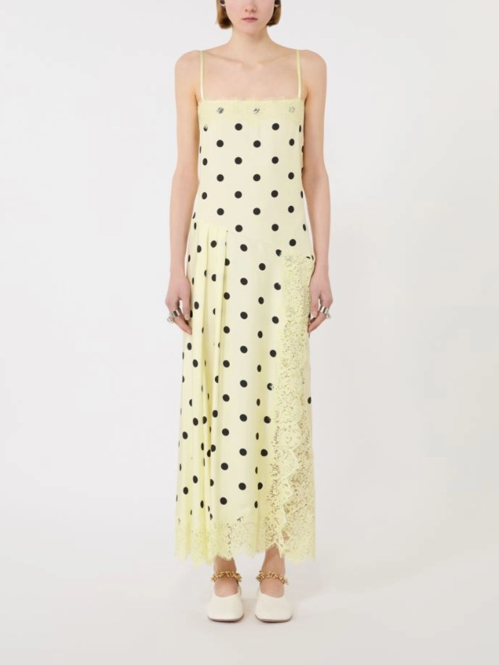 Yellow SPORTMAX silk twill dress featuring black polka dot print, straight neckline, thin elastic straps, bias-cut skirt with pleated motif and lace details.