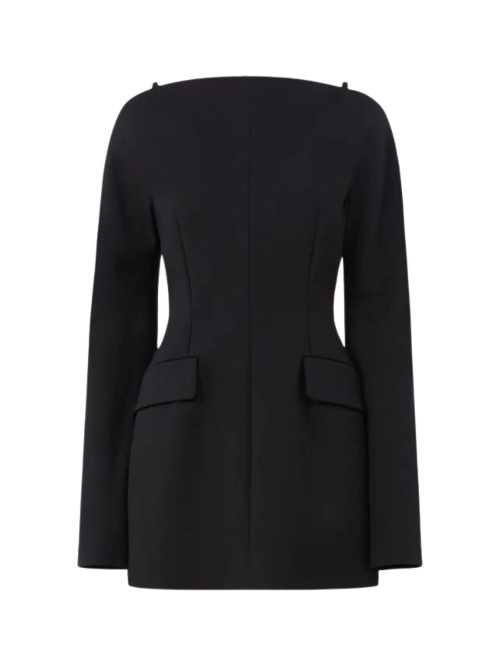 Black SPORTMAX dress featuring hourglass silhouette, long kimono-cut sleeves, flap pockets and deep front and back darts.