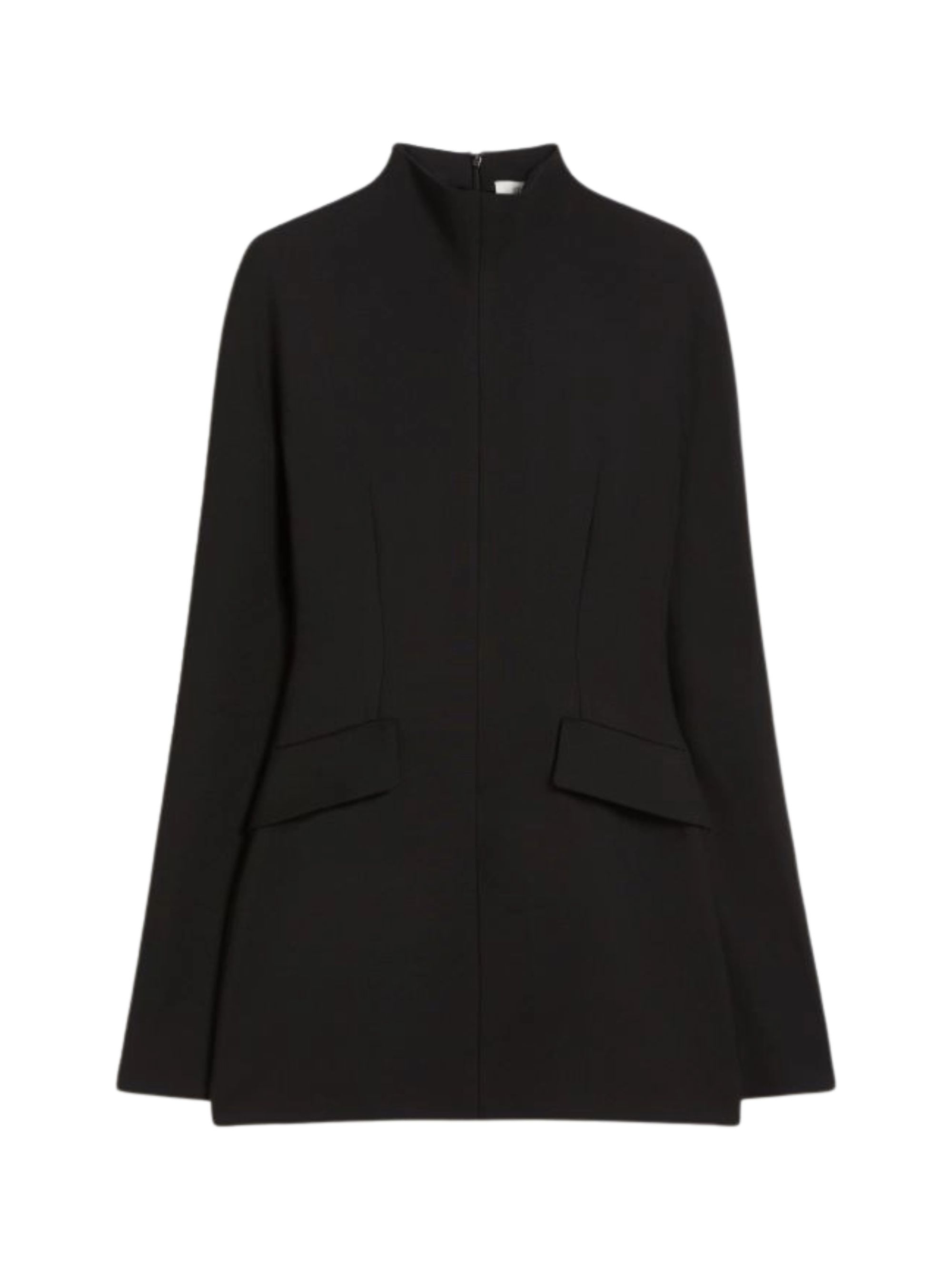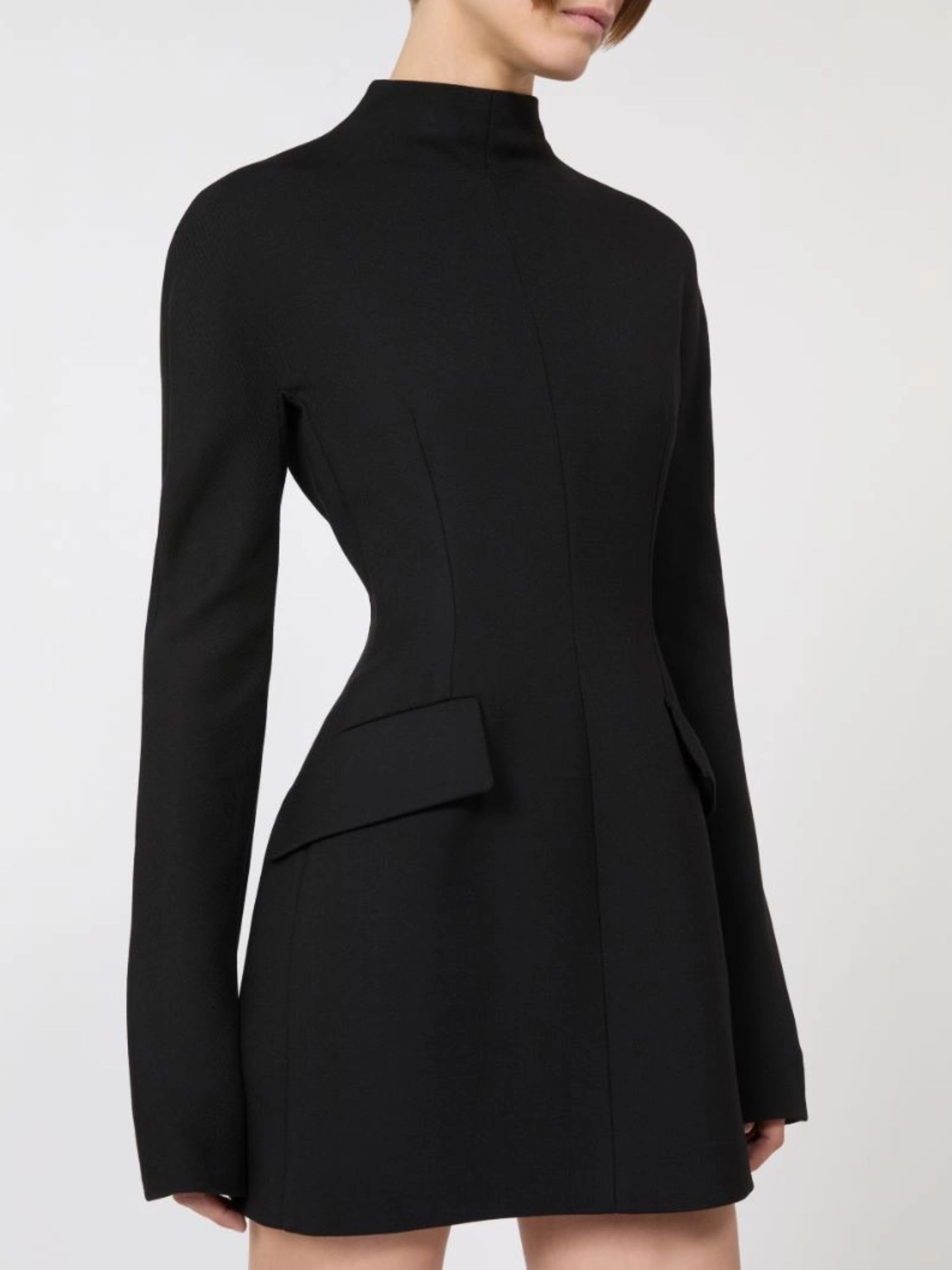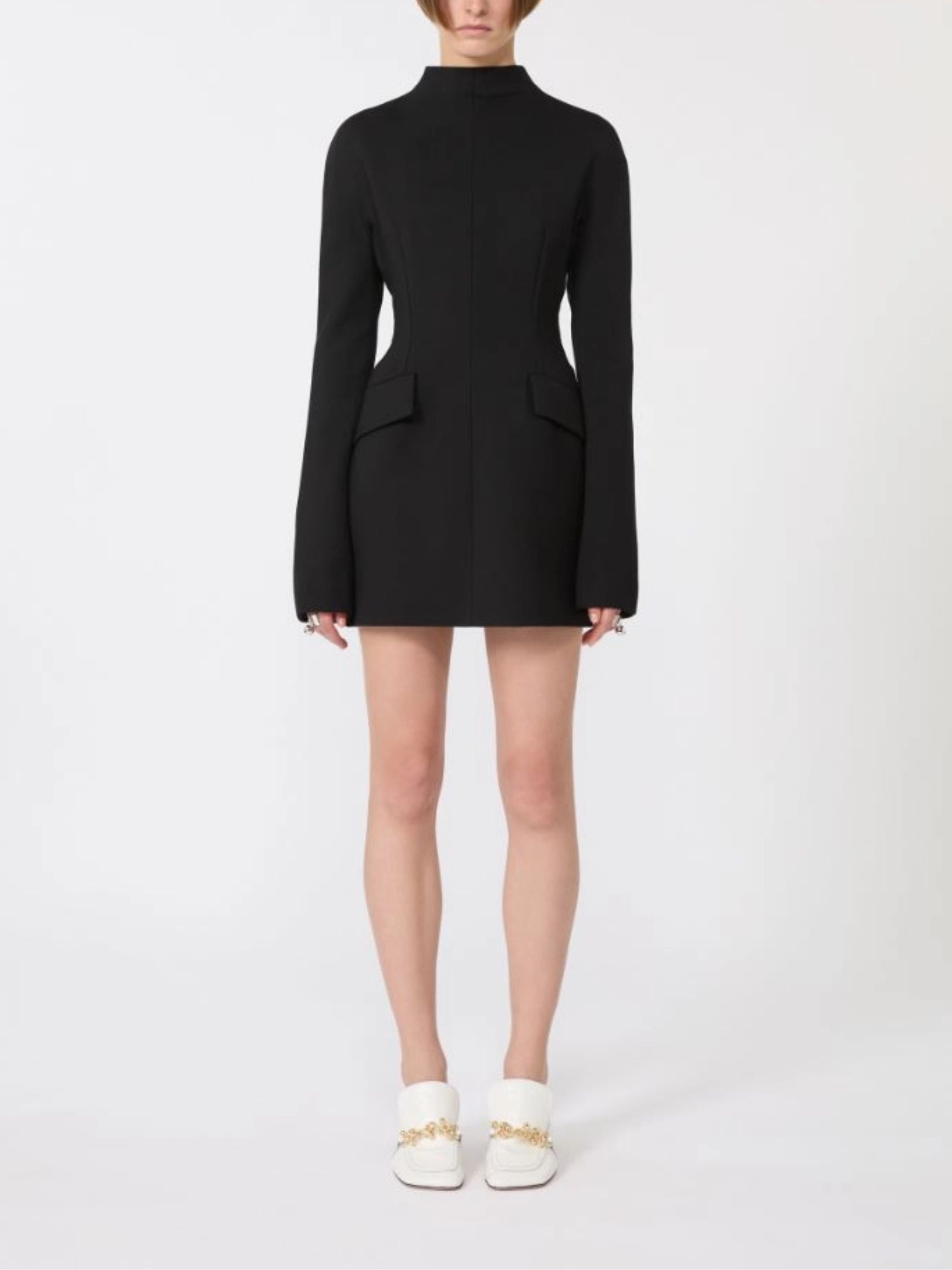 Black SPORTMAX dress featuring hourglass silhouette, raised collar, fitted waist, flap pockets and long kimono-cut sleeves.