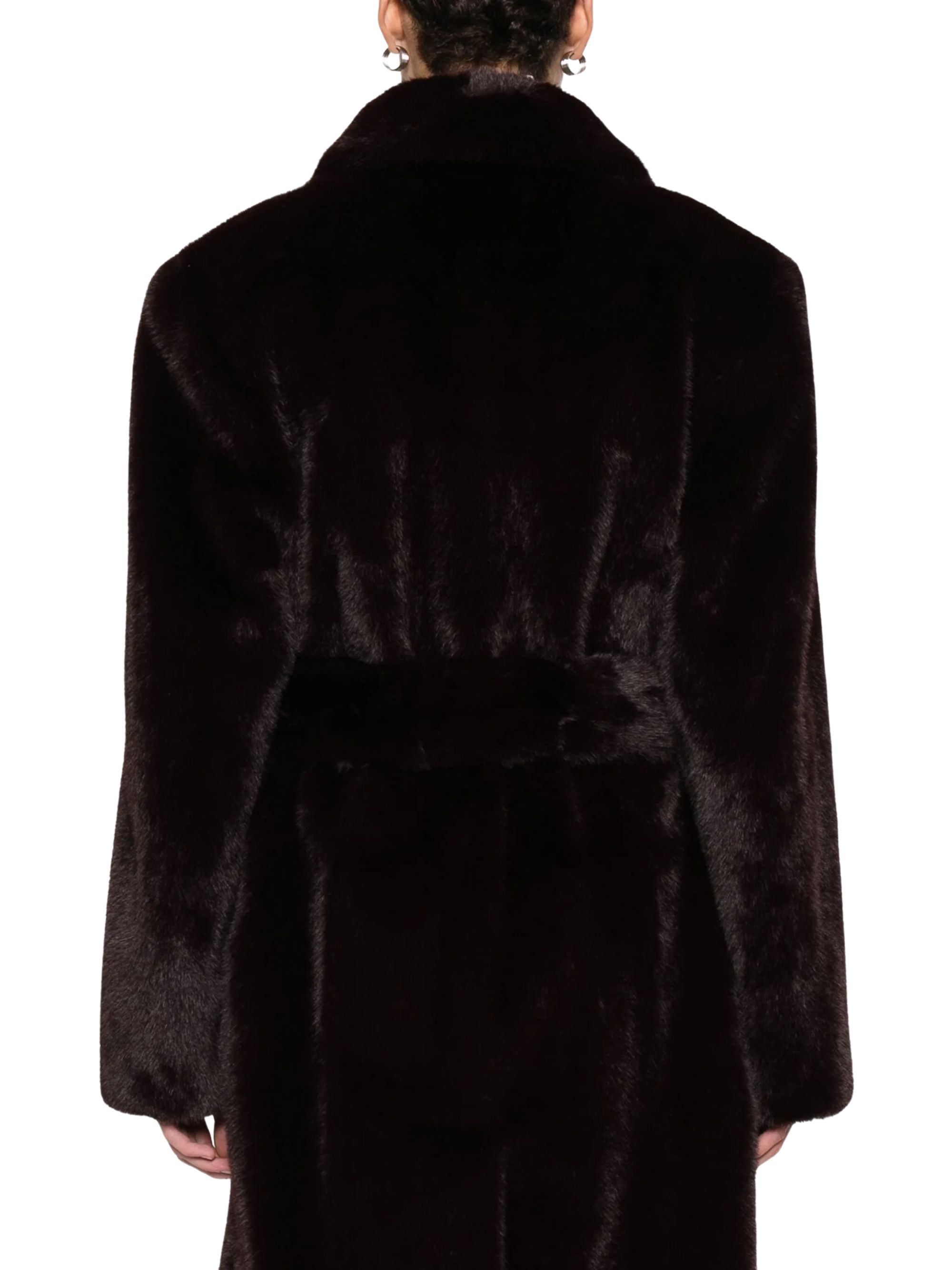 STAND STUDIO Jasmine coat in burgundy faux fur, featuring double-breasted button fastening, peak lapels, belted waist and front pockets.