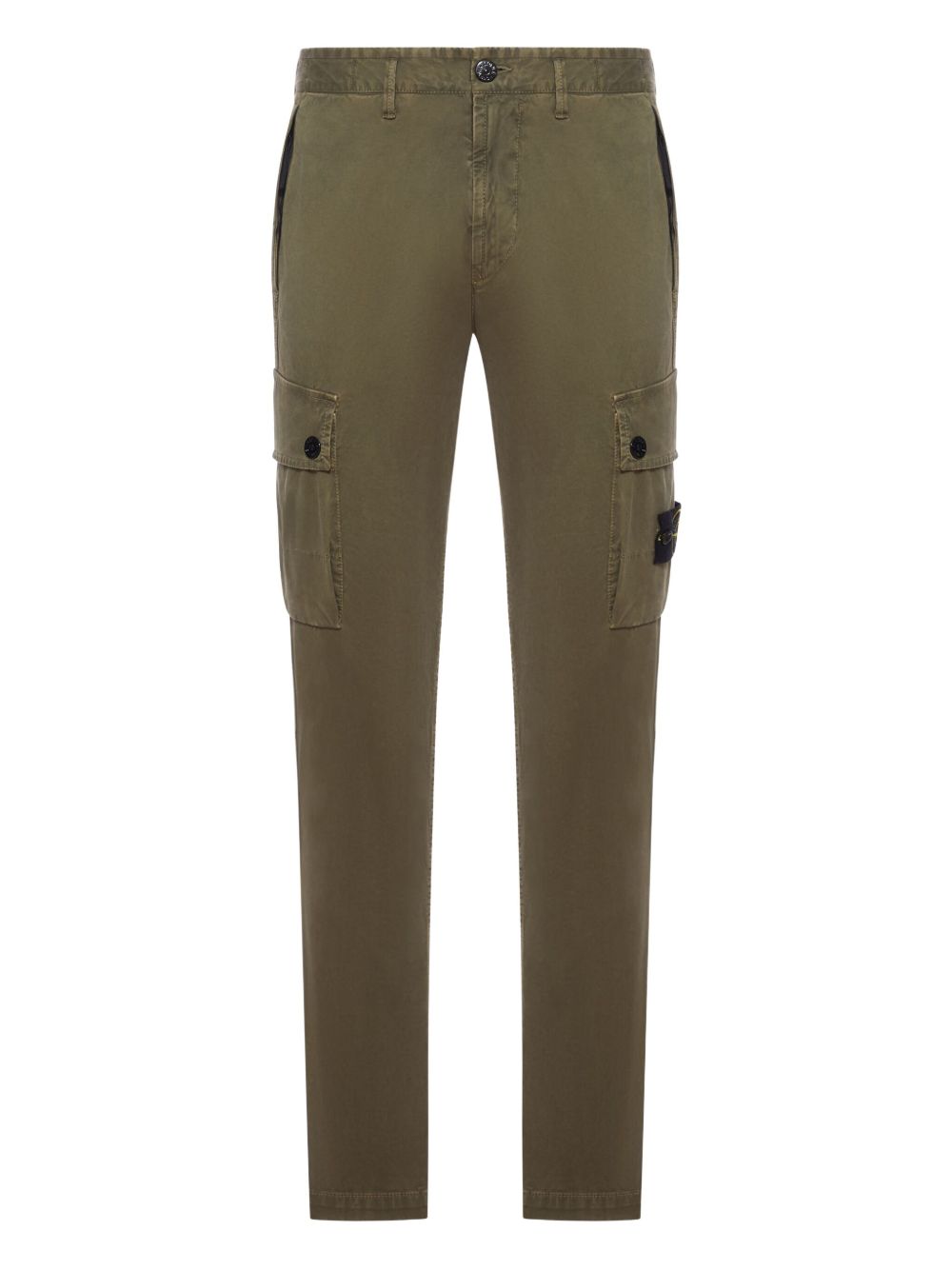 STONE ISLAND military green cargo trousers in cotton twill, logo applique, side zip pockets, regular waist with belt loops and logo button and zip fastening.