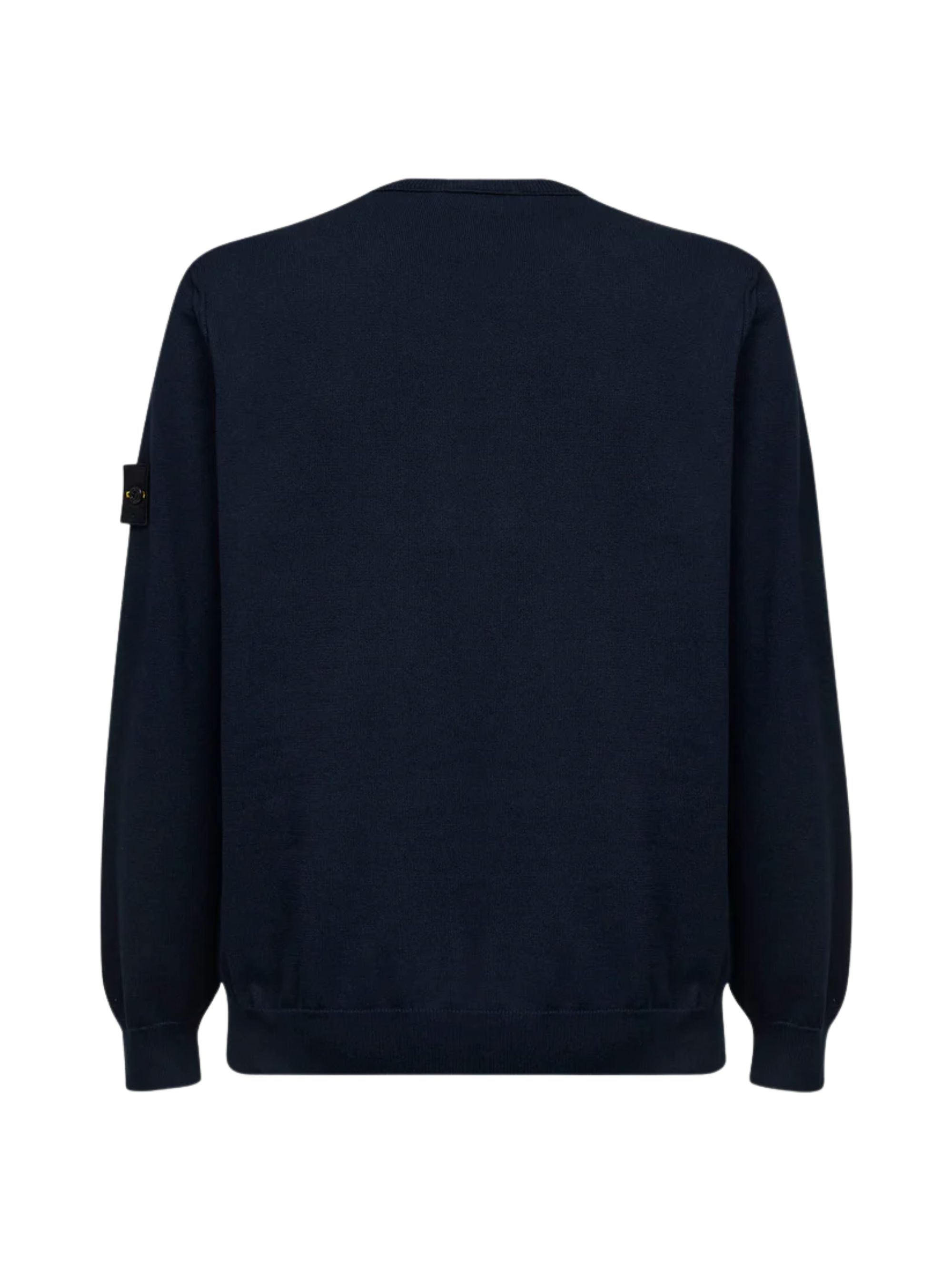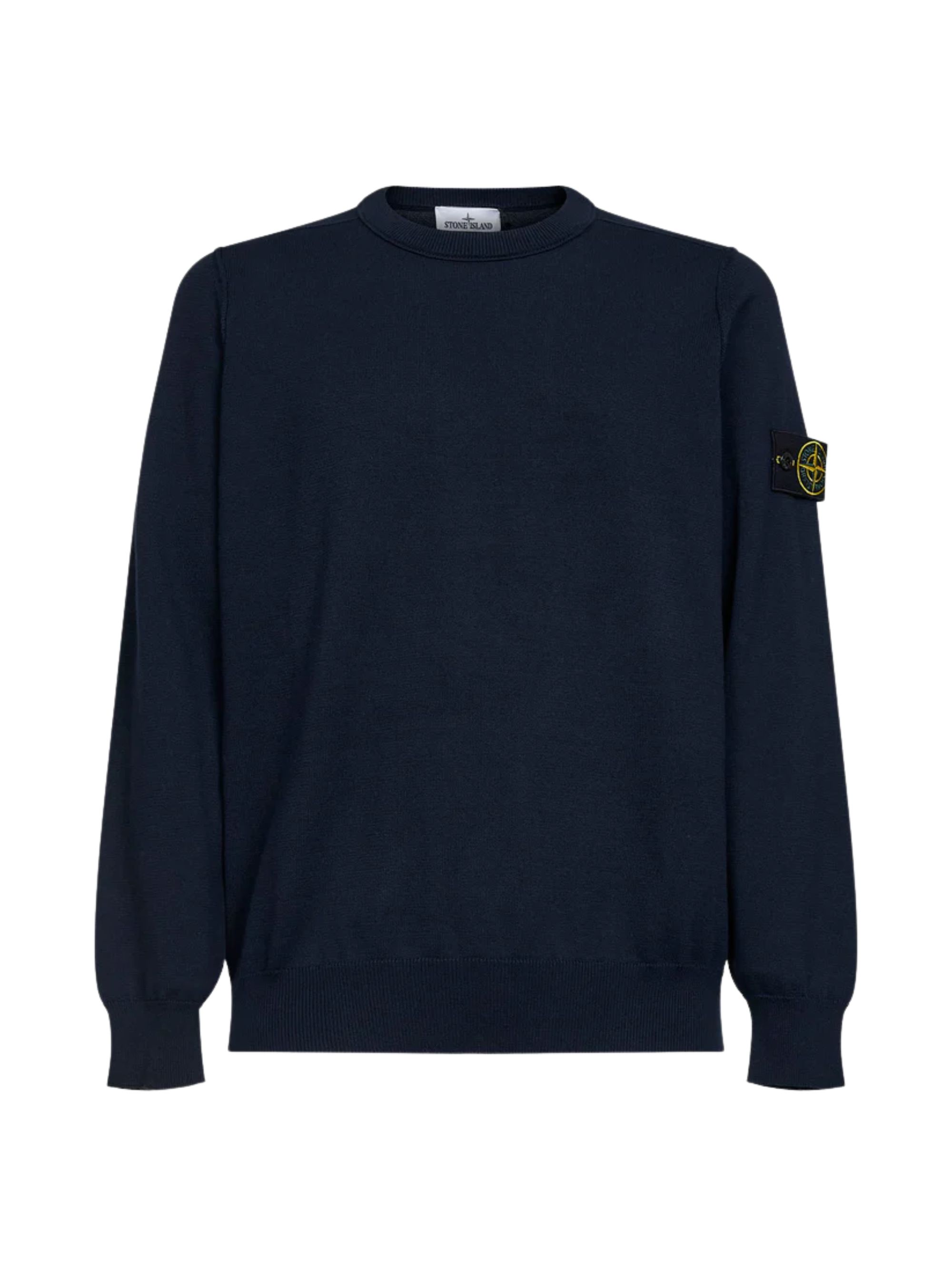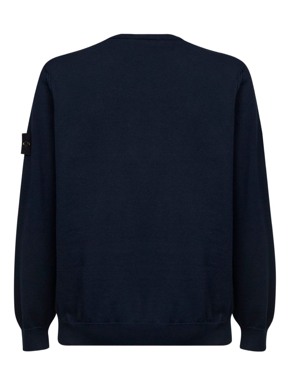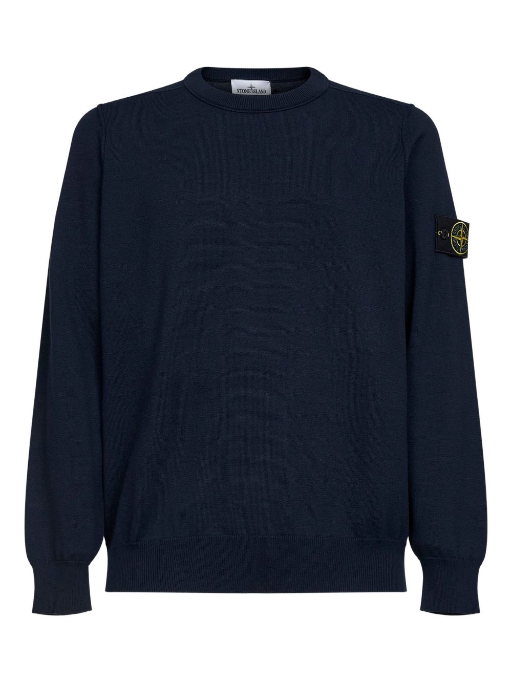 STONE ISLAND crew-neck sweater with logo in blue, featuring a crew neck, ribbed trims, and a logo patch on the sleeve.