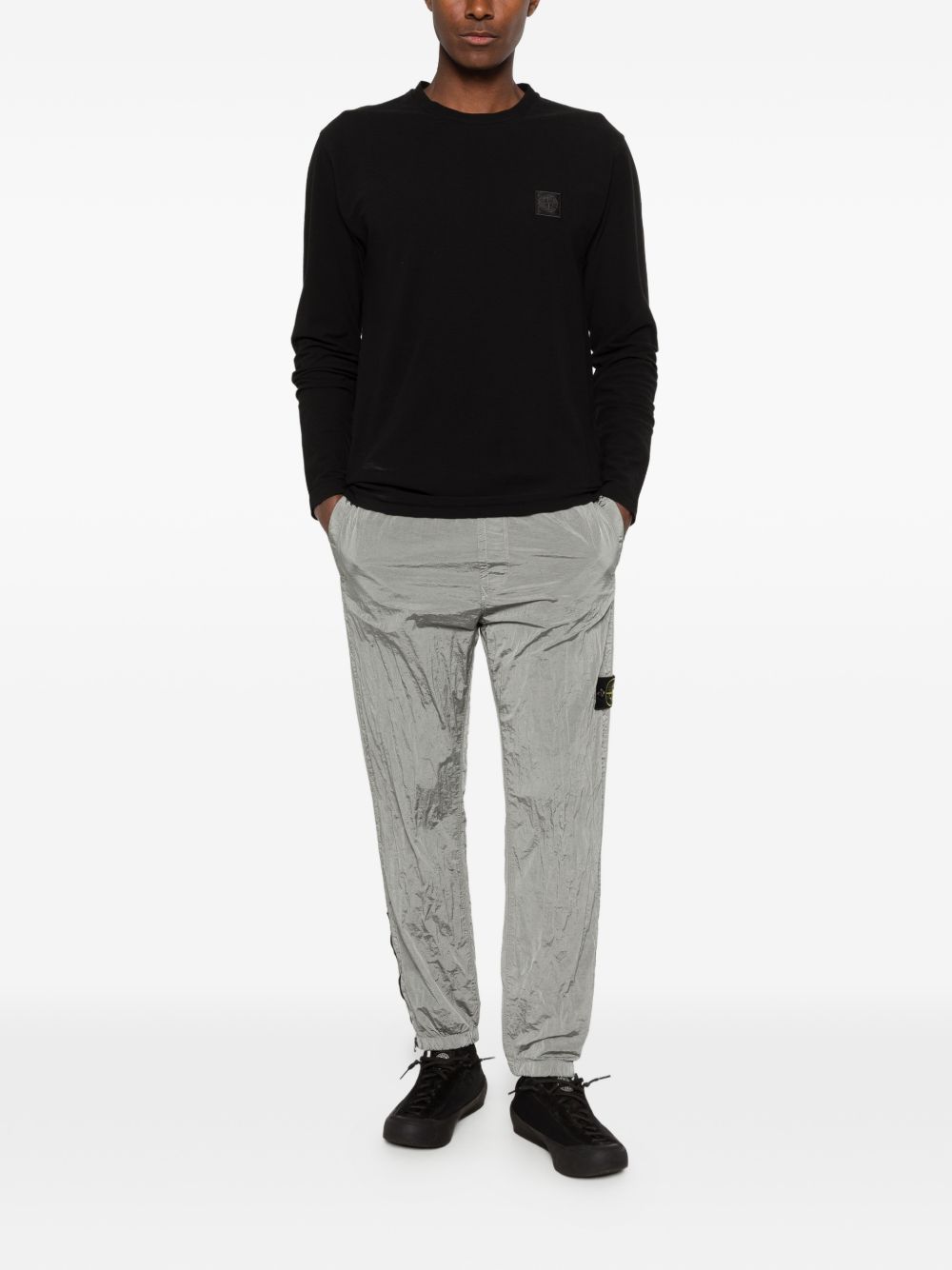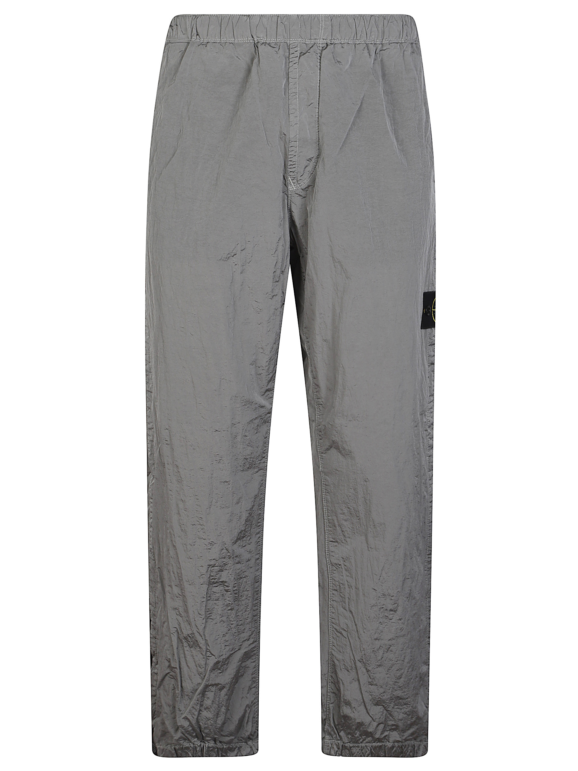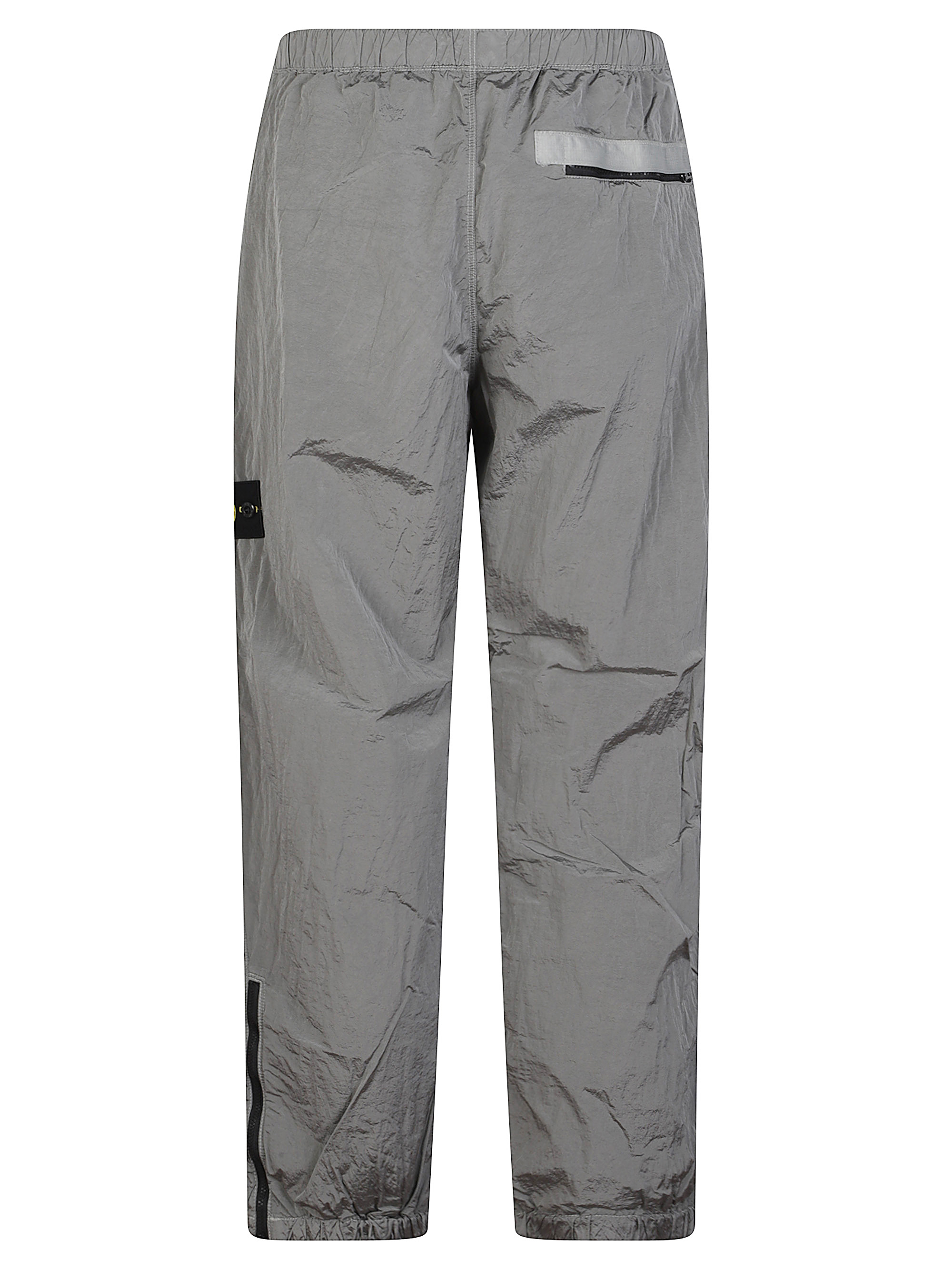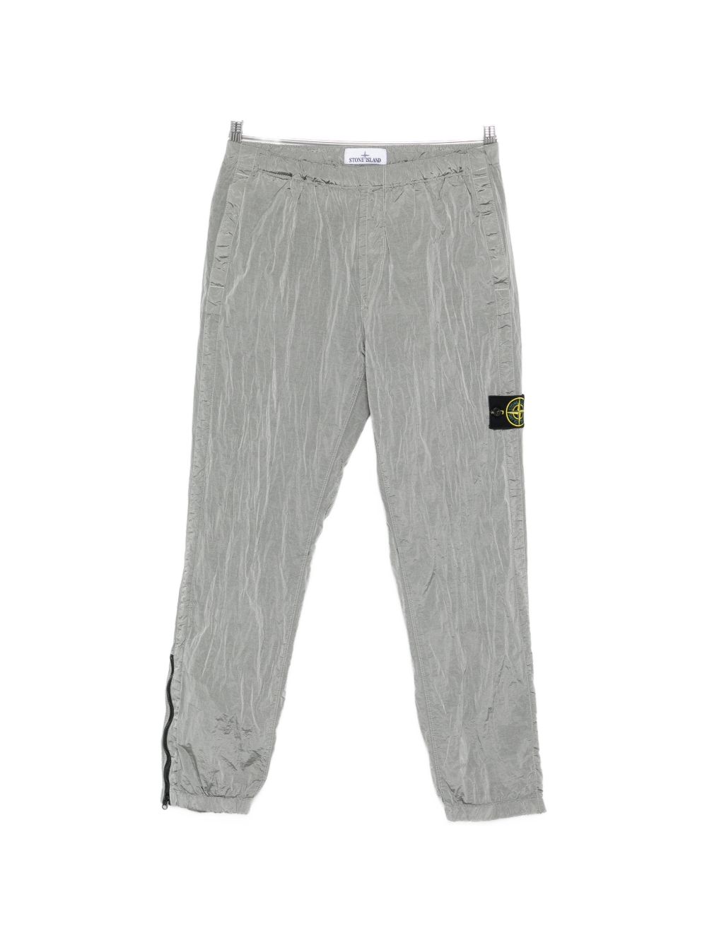 Grey STONE ISLAND nylon jogger trousers featuring side logo, zip pocket and elasticated waistband.
