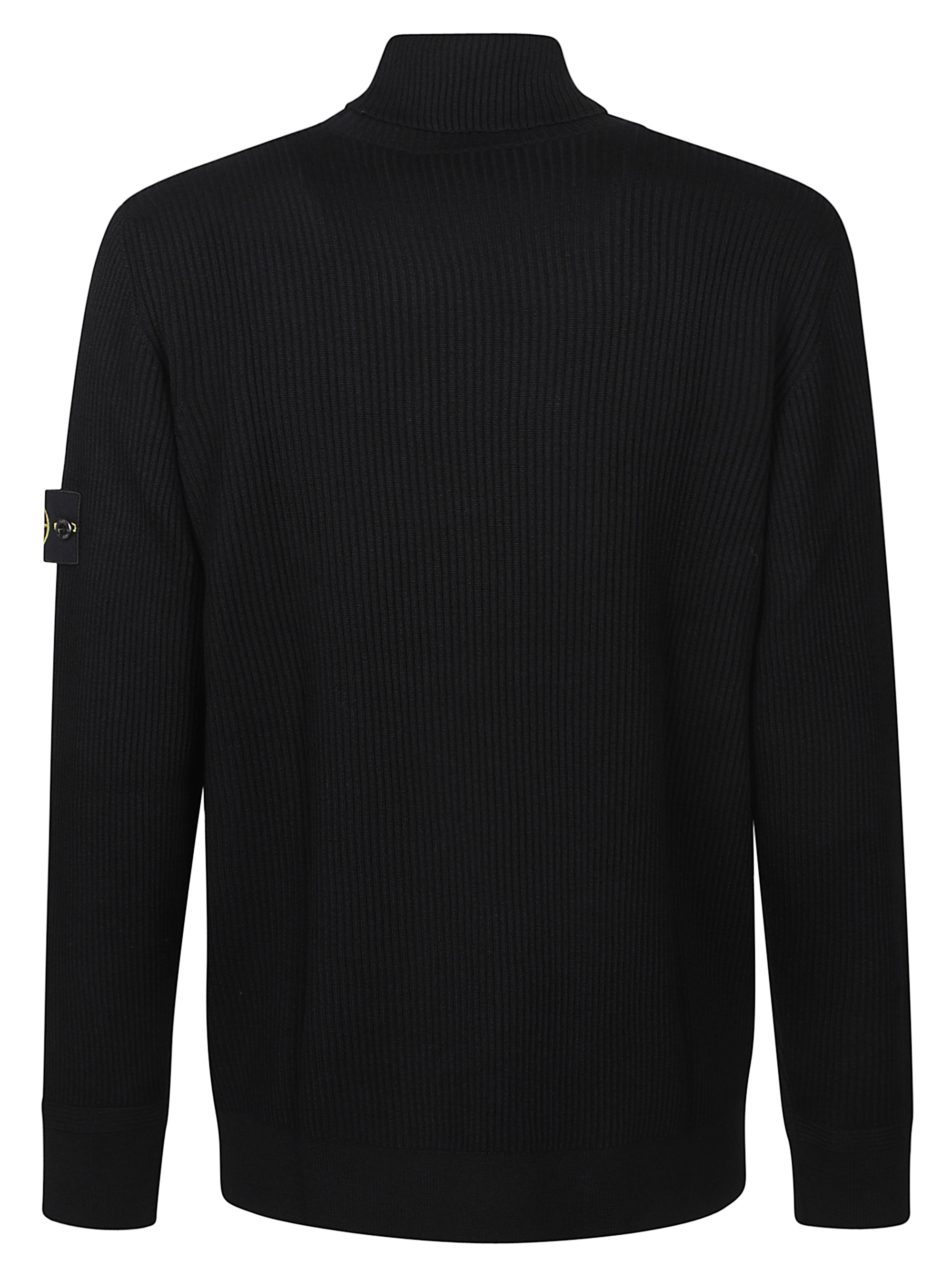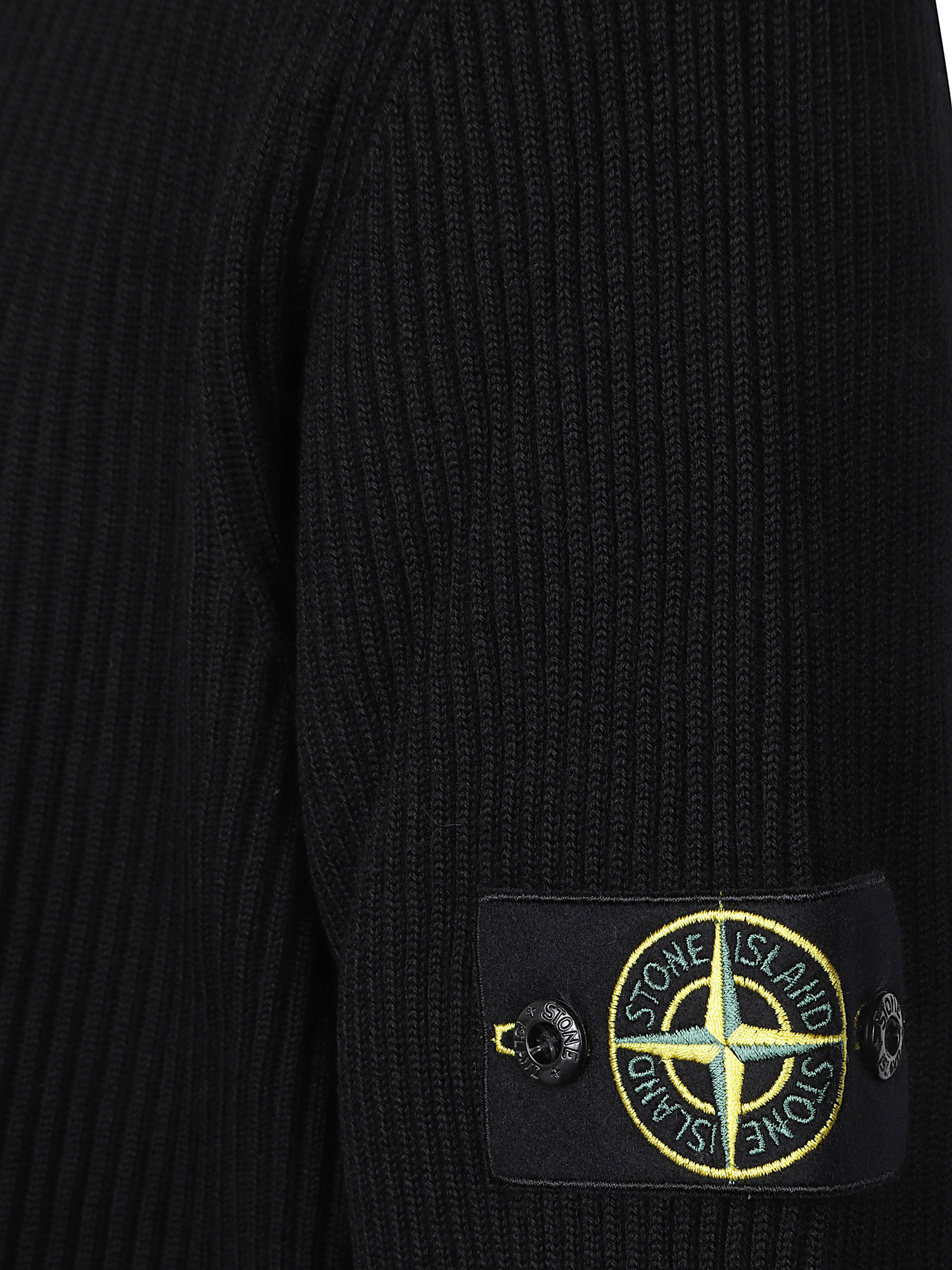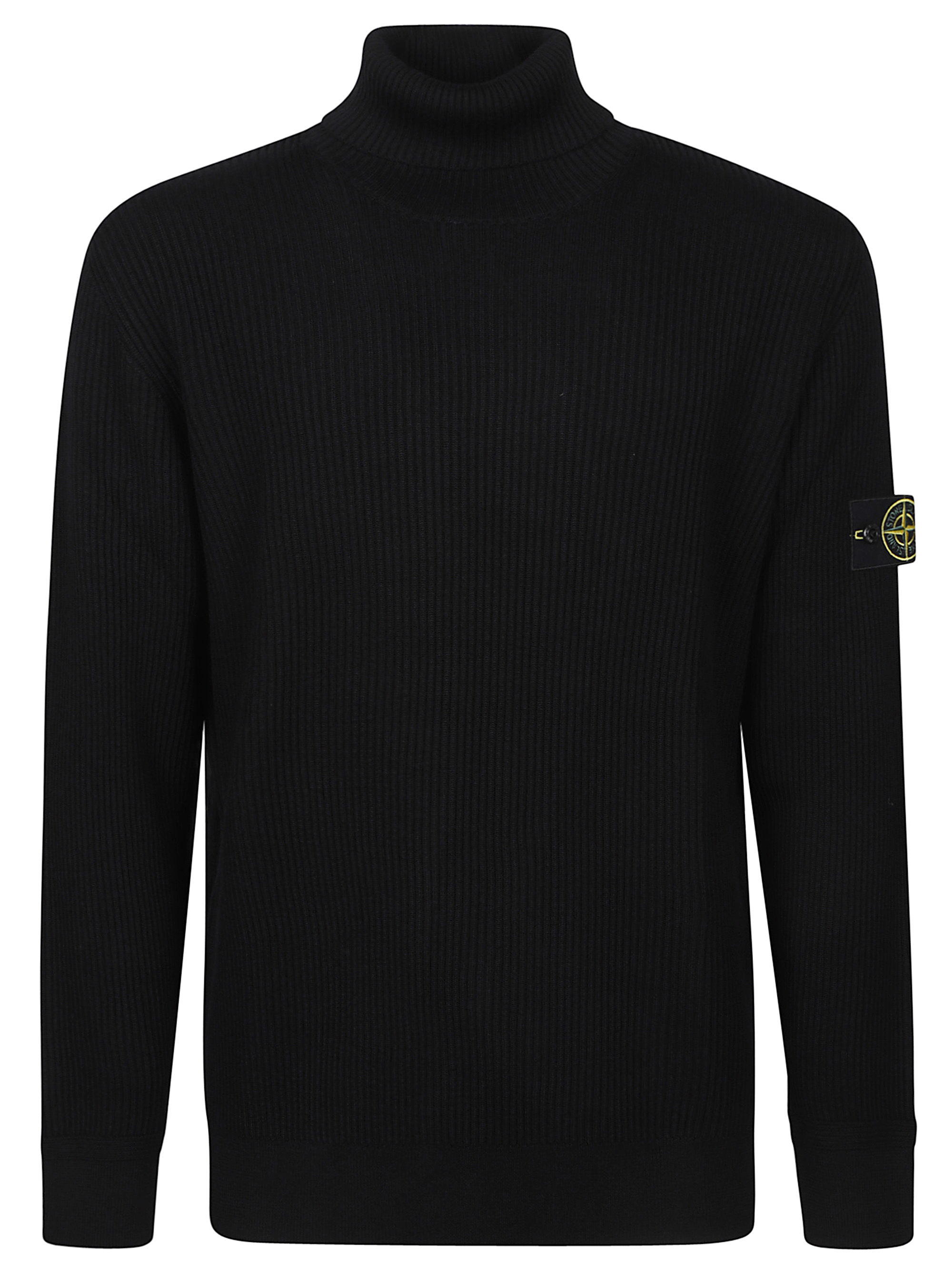 Black STONE ISLAND turtleneck featuring a logo on the arm, long sleeves, and a high neck.