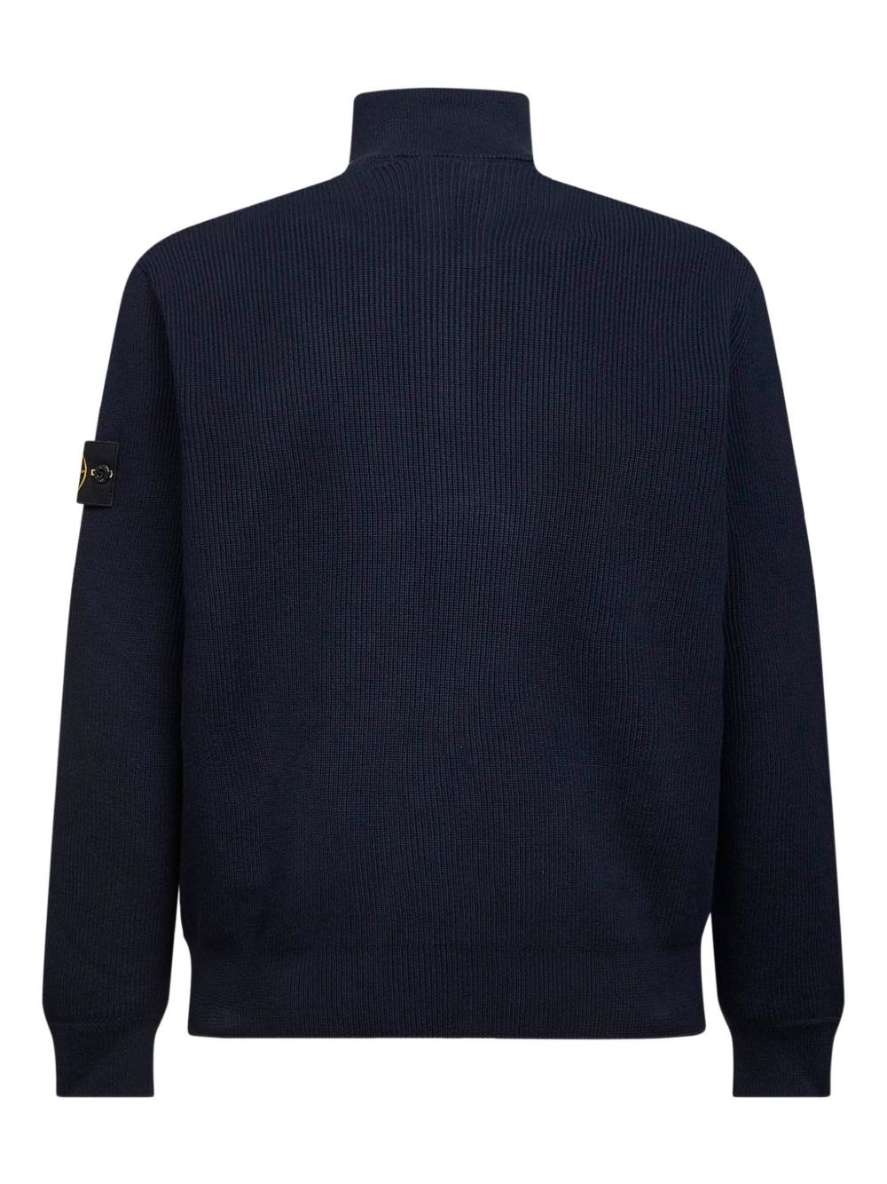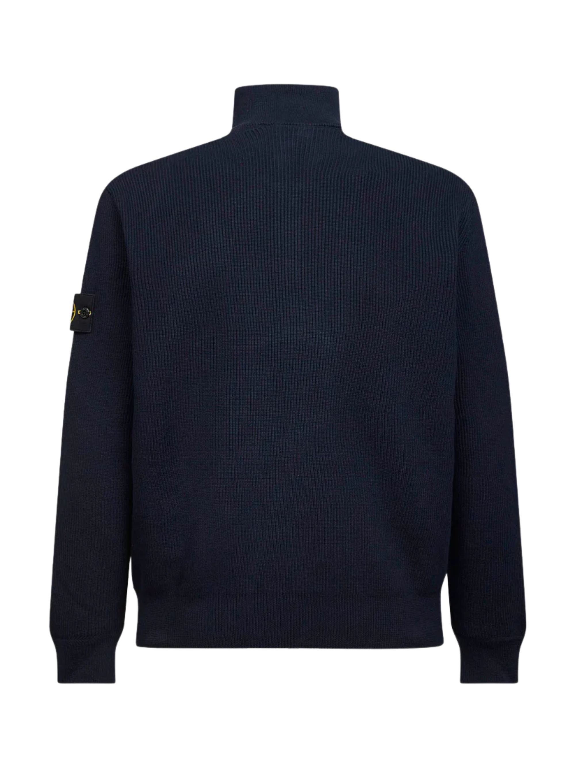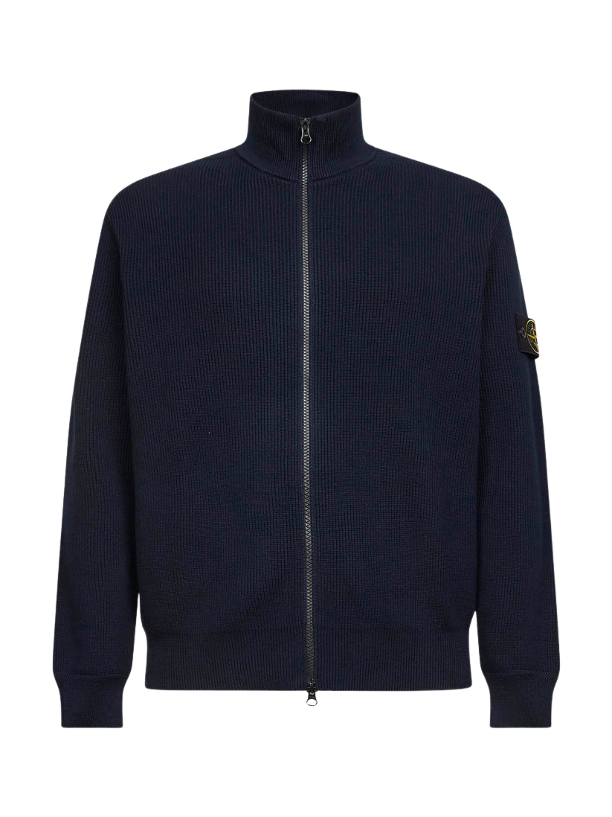 STONE ISLAND zip-up cardigan in blue, featuring a stand-up collar, a zip closure, purl-stitch inserts, ribbed trims, and a logo on the sleeve.