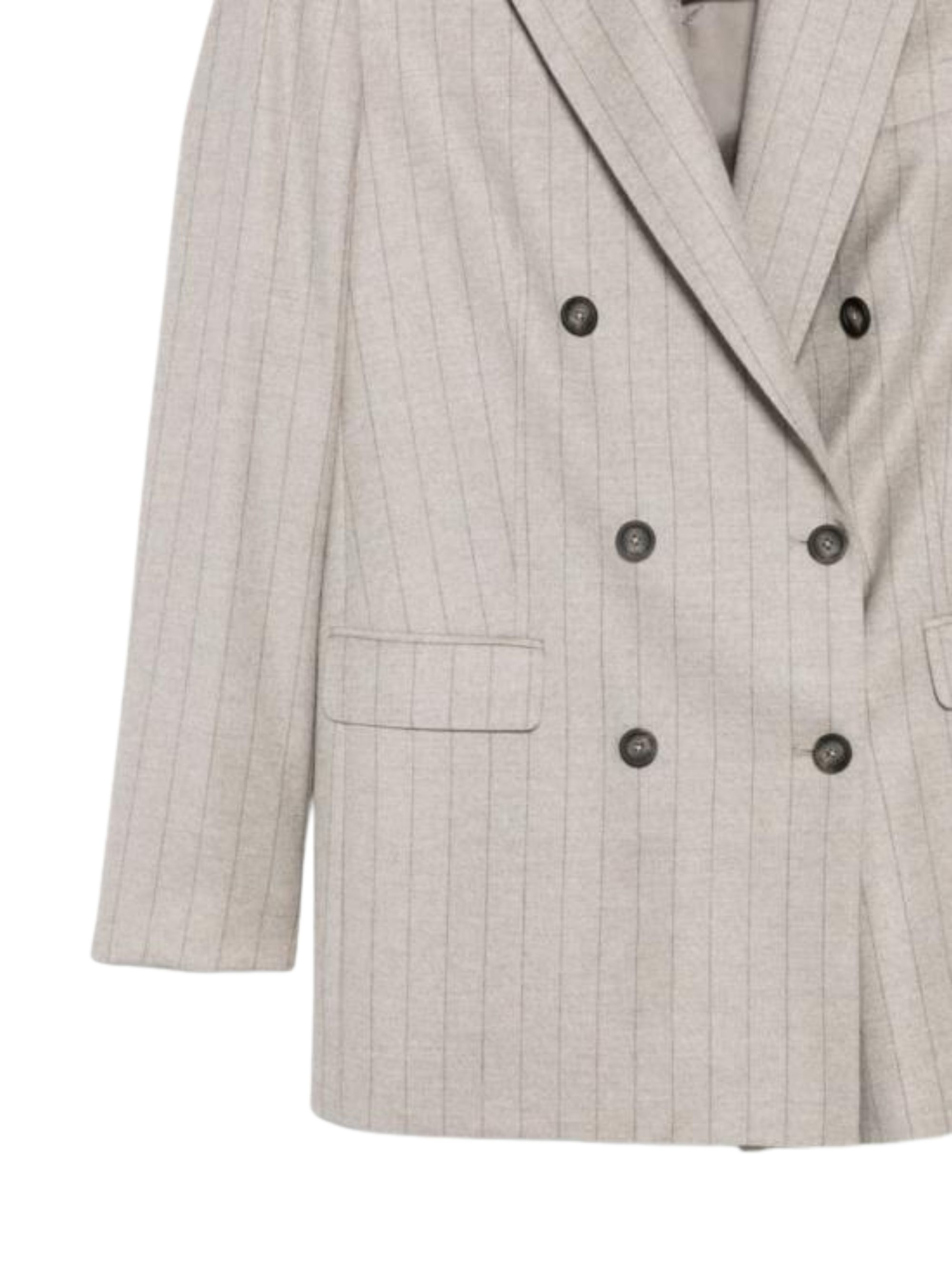 Double-breasted blazer by TAGLIATORE in grey pinstripe fabric, featuring flap pockets and buttoned cuffs.