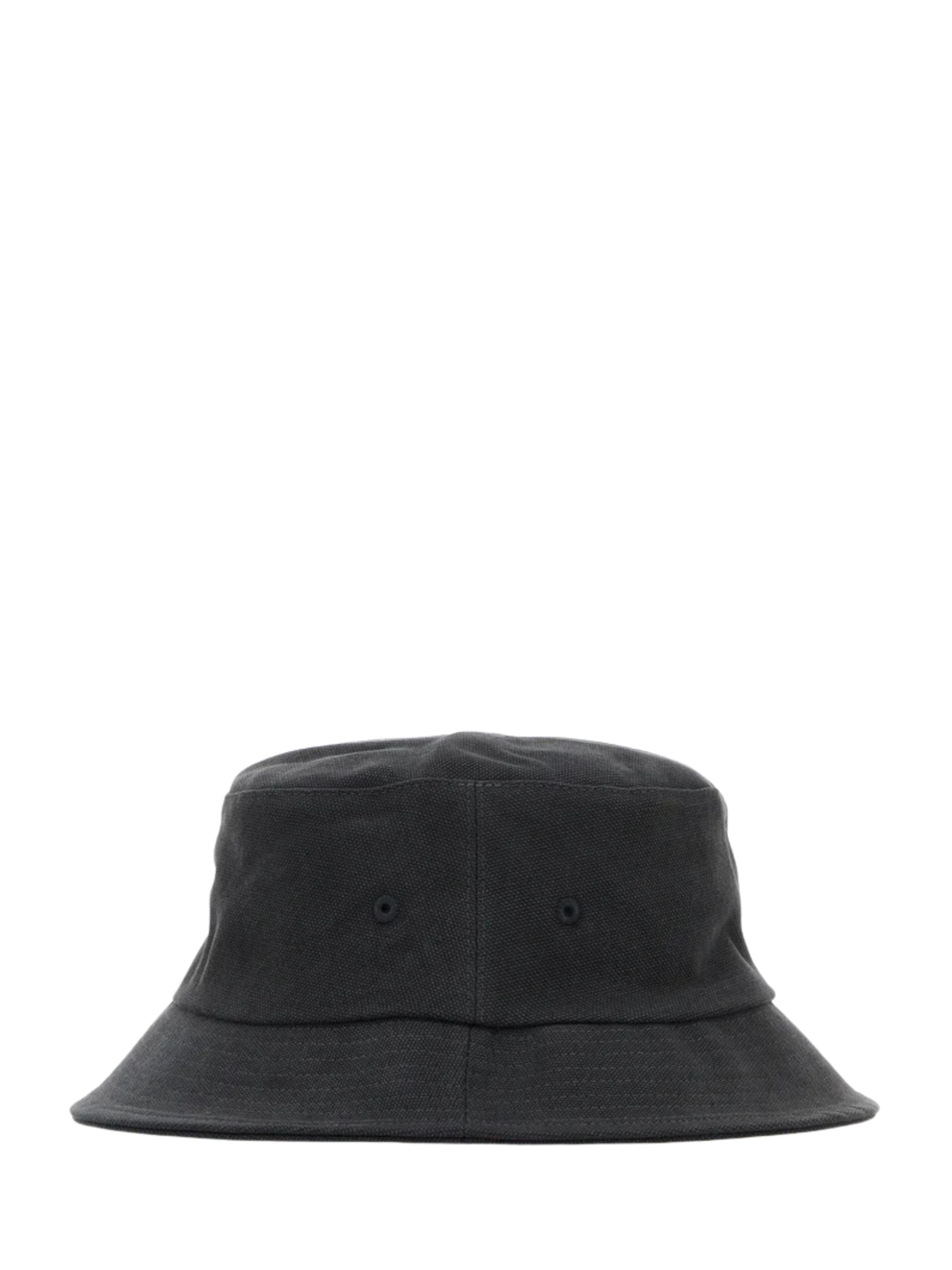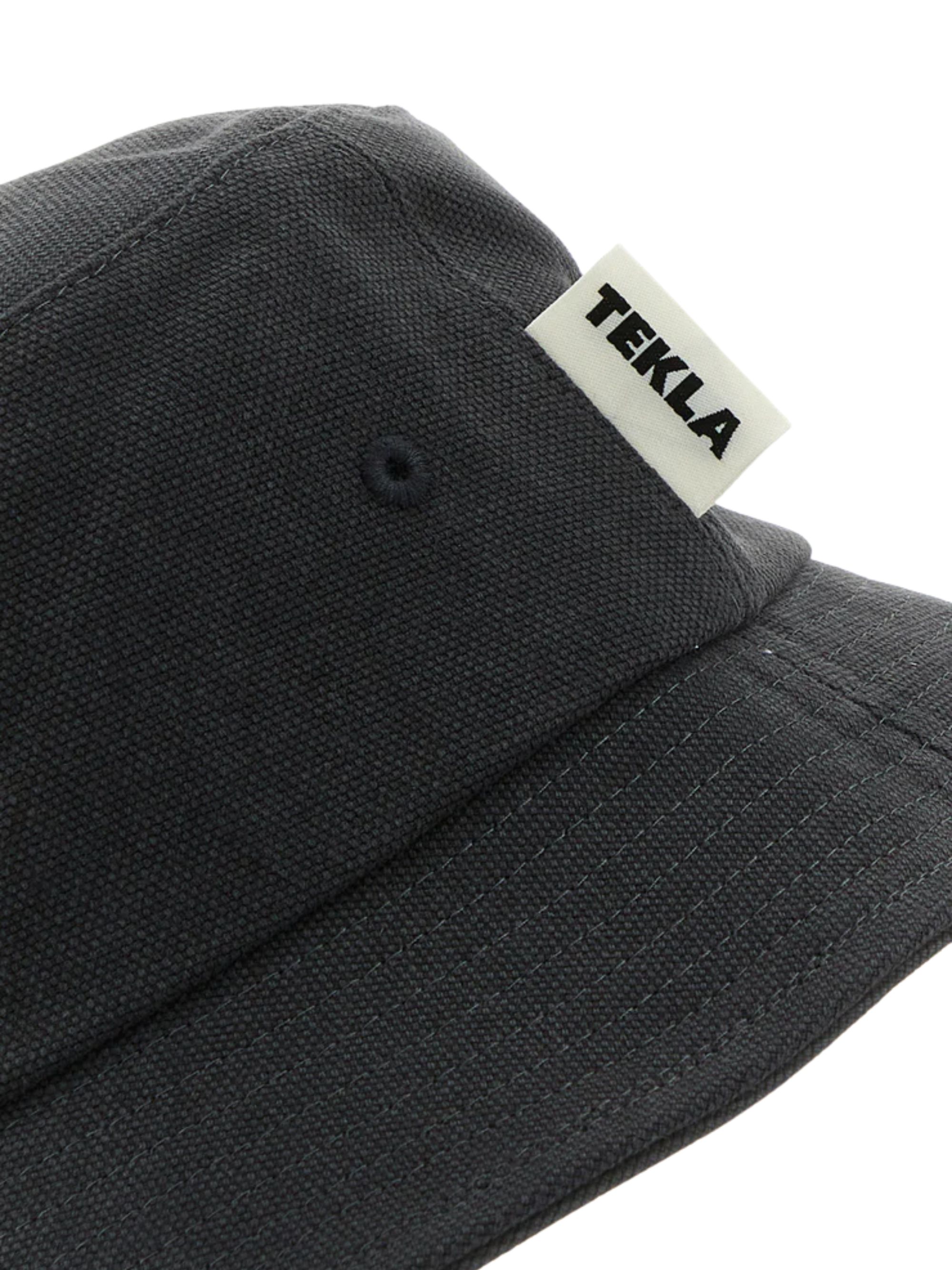 Black bucket hat by TEKLA featuring embroidered eyelets and logo label.