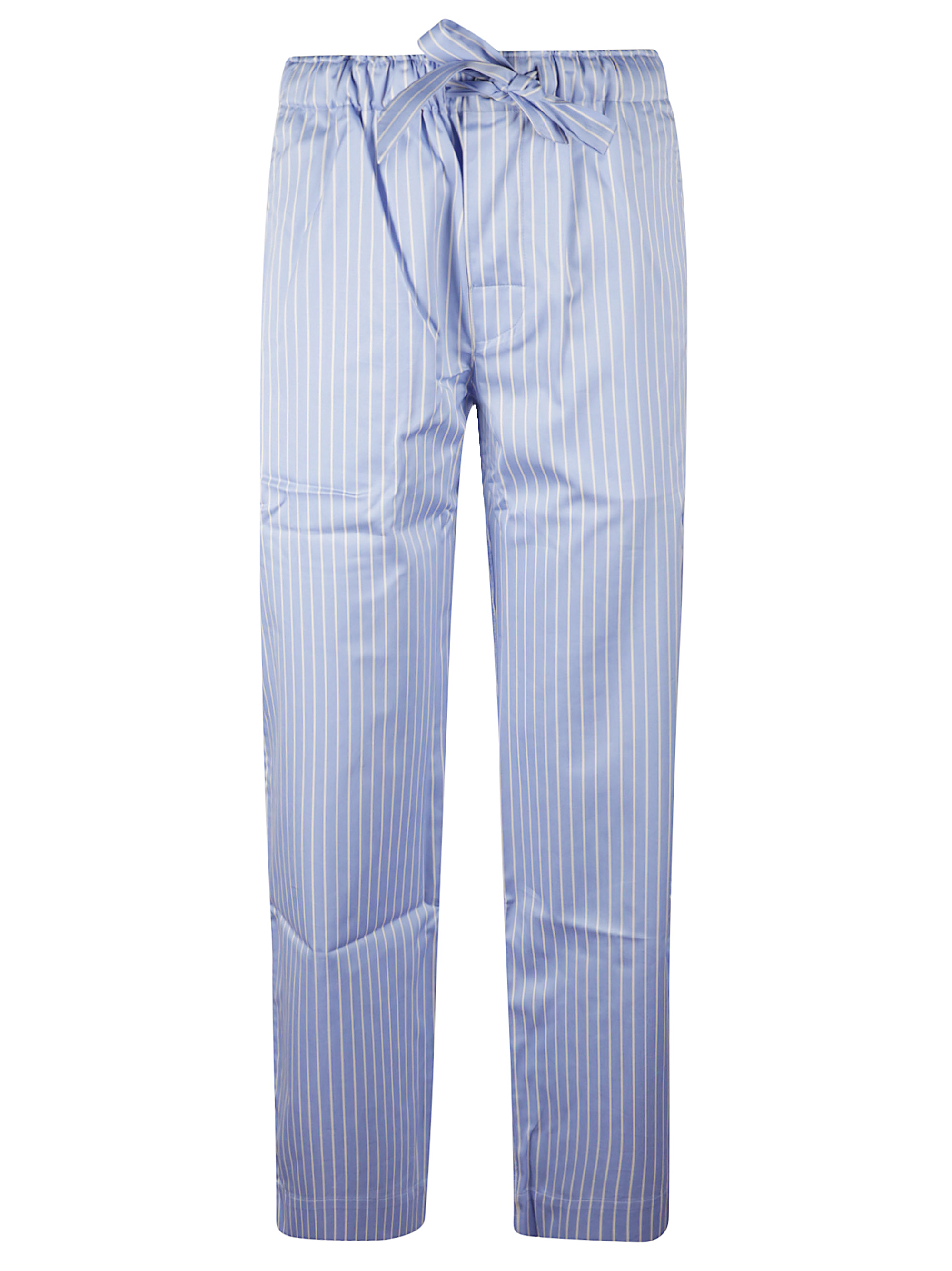 TEKLA striped pajama bottoms in blue organic cotton satin, featuring a gathered waist, a striped bow at the waist, a single back pocket and white trim at the sides.