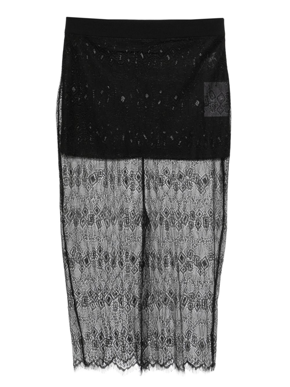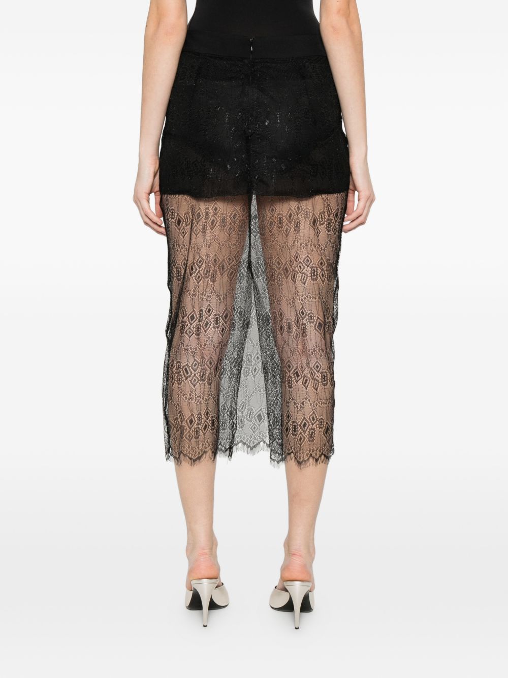 Alrose midi skirt by THE FRANKIE SHOP in black satin fabric, featuring a midi length, belt loops, a back slit and a hidden zip fastening at the back.