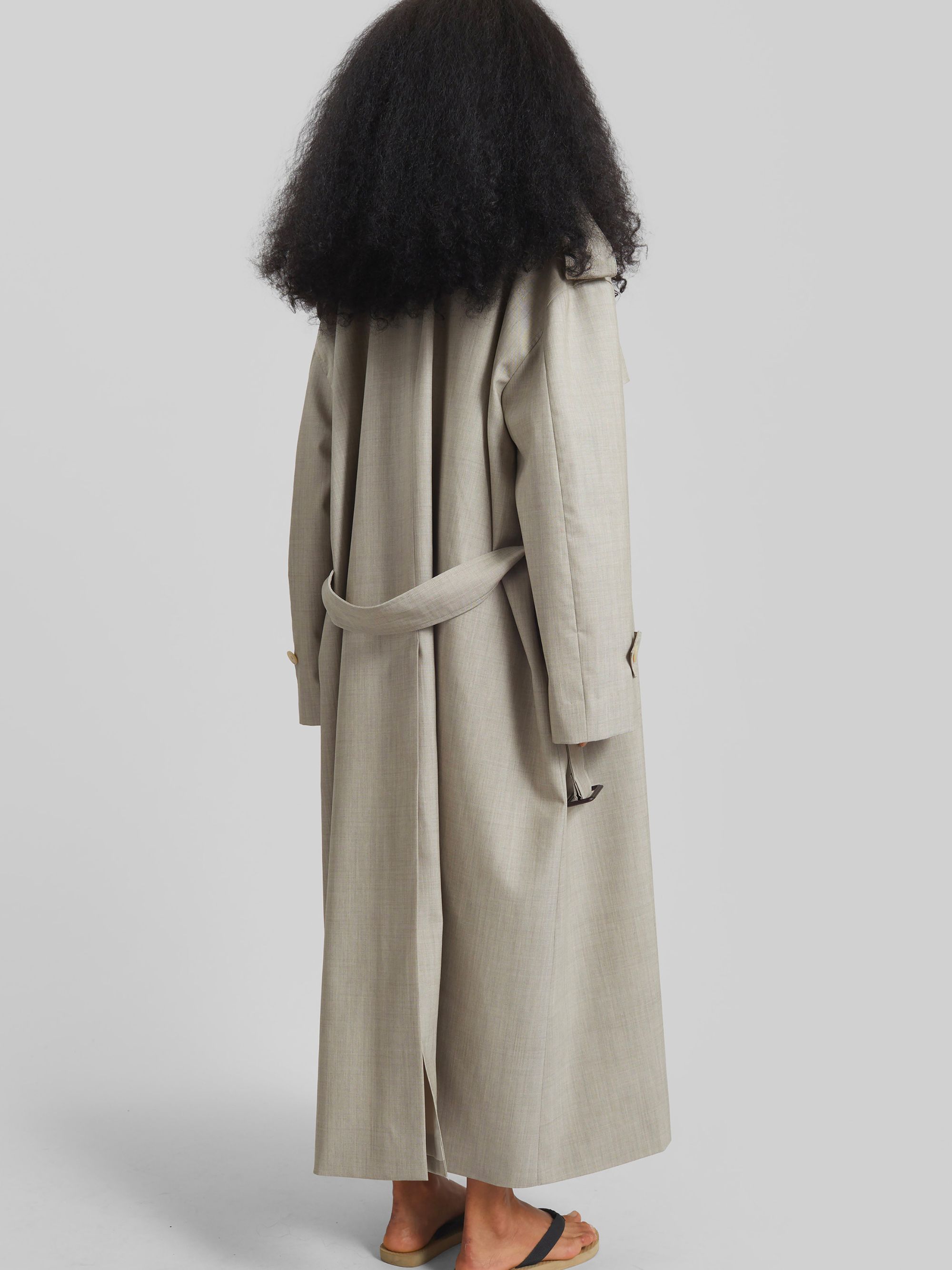 THE FRANKIE SHOP Dursley trench coat in beige melange medium weight wool, windbreaker, lined, epaulettes, removable belt, belted cuffs, loose fit and double-breasted button fastening.
