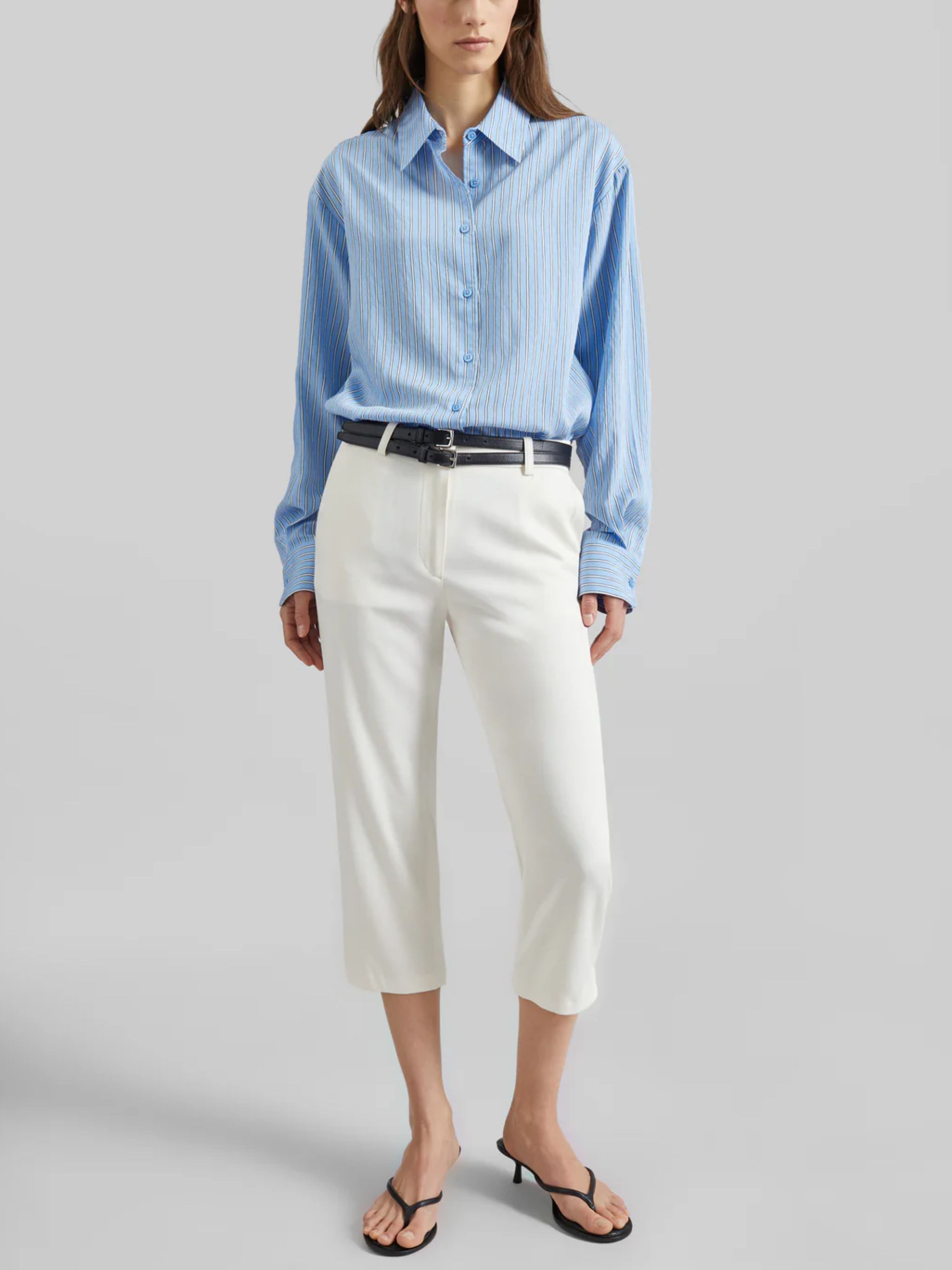 Lior trousers by THE FRANKIE SHOP in ivory viscose, capri style, featuring a slim fit, side and back welt pockets, belt loops and zip, hook and bar fastening.