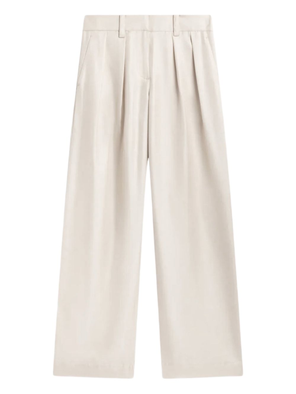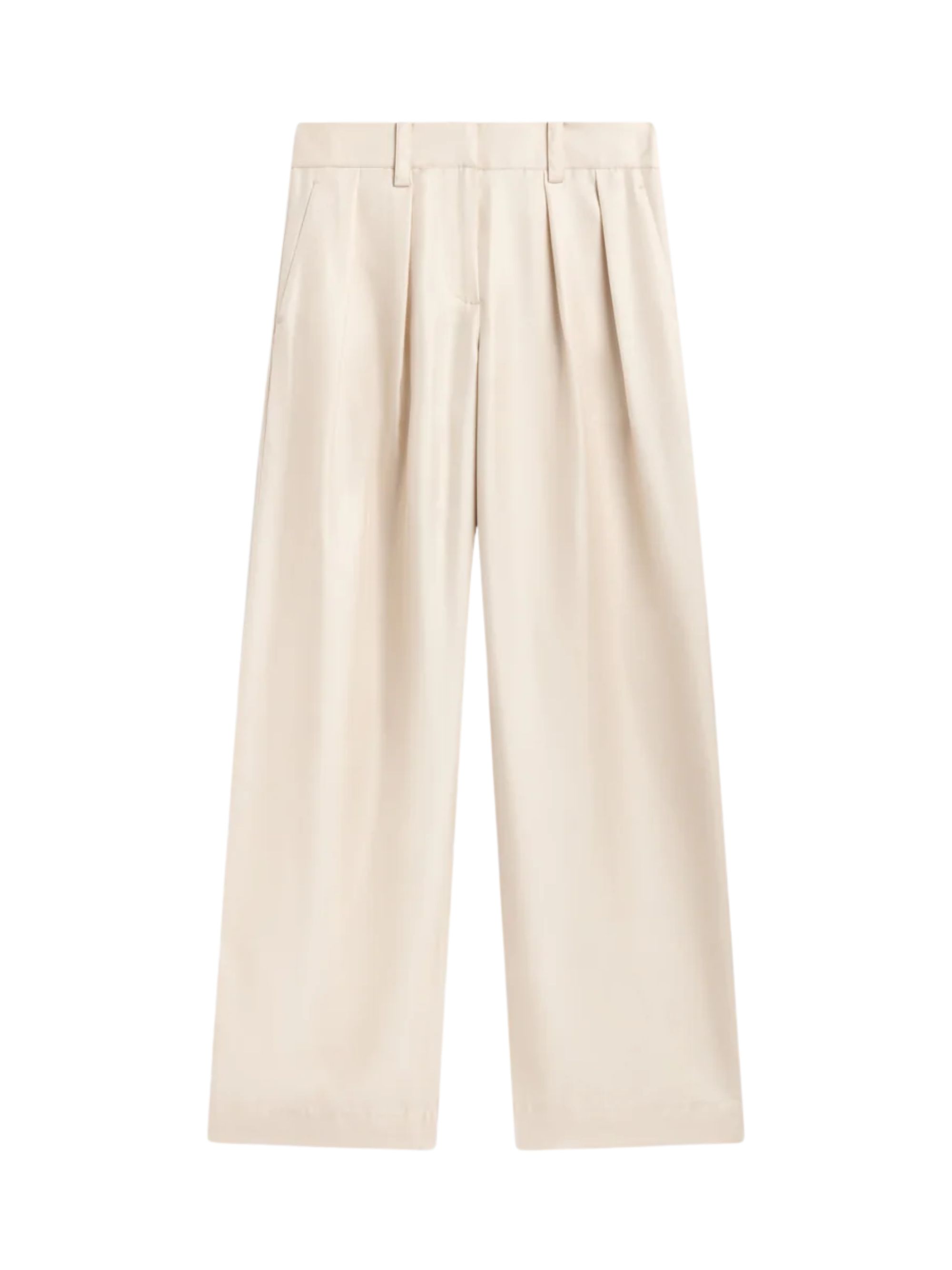 Marfa trousers by THE FRANKIE SHOP in ivory in light and flowing silk, featuring a wide leg, high waist, darts, side and back welt pockets, belt loops and zip and hook fastening.