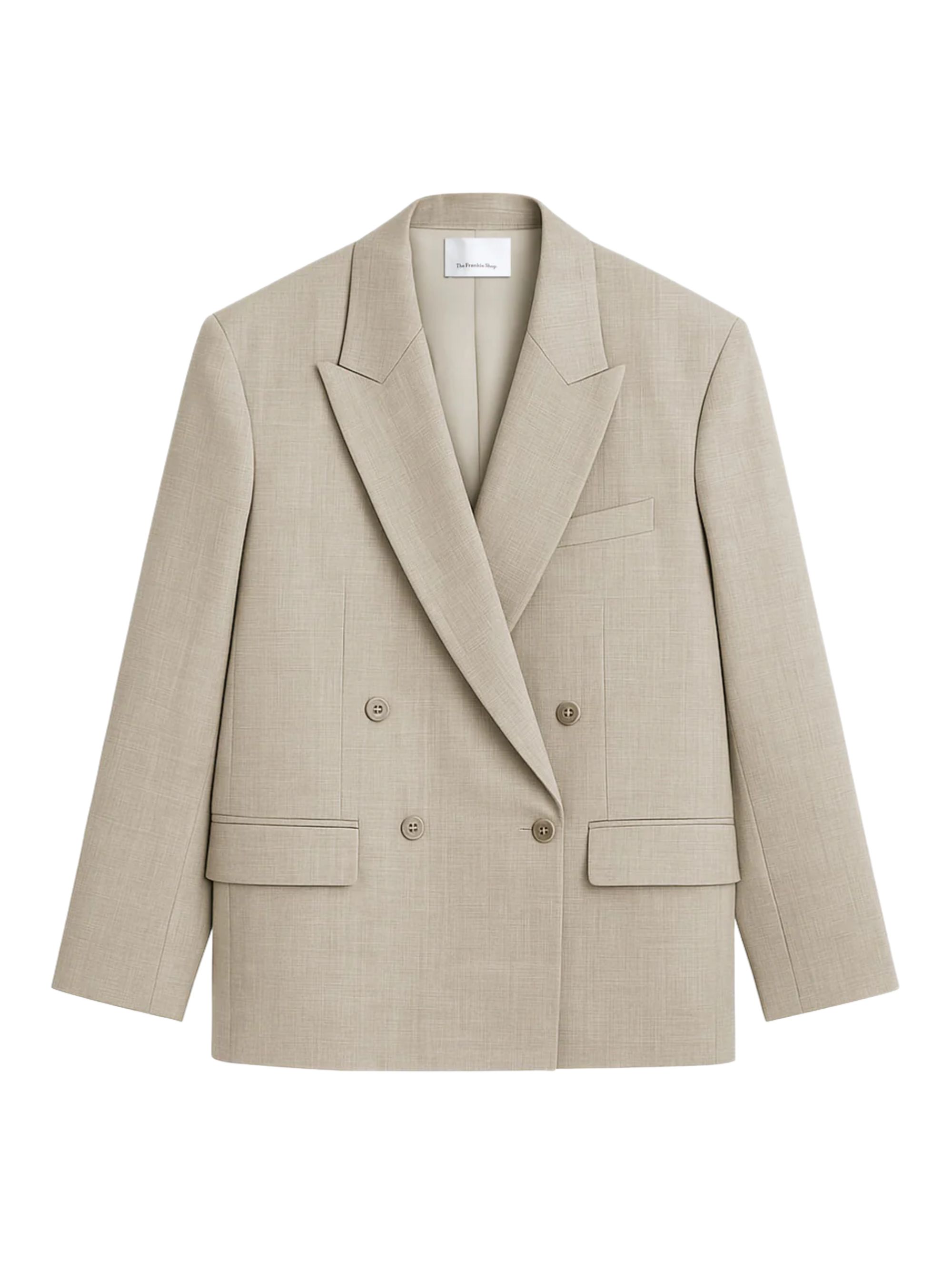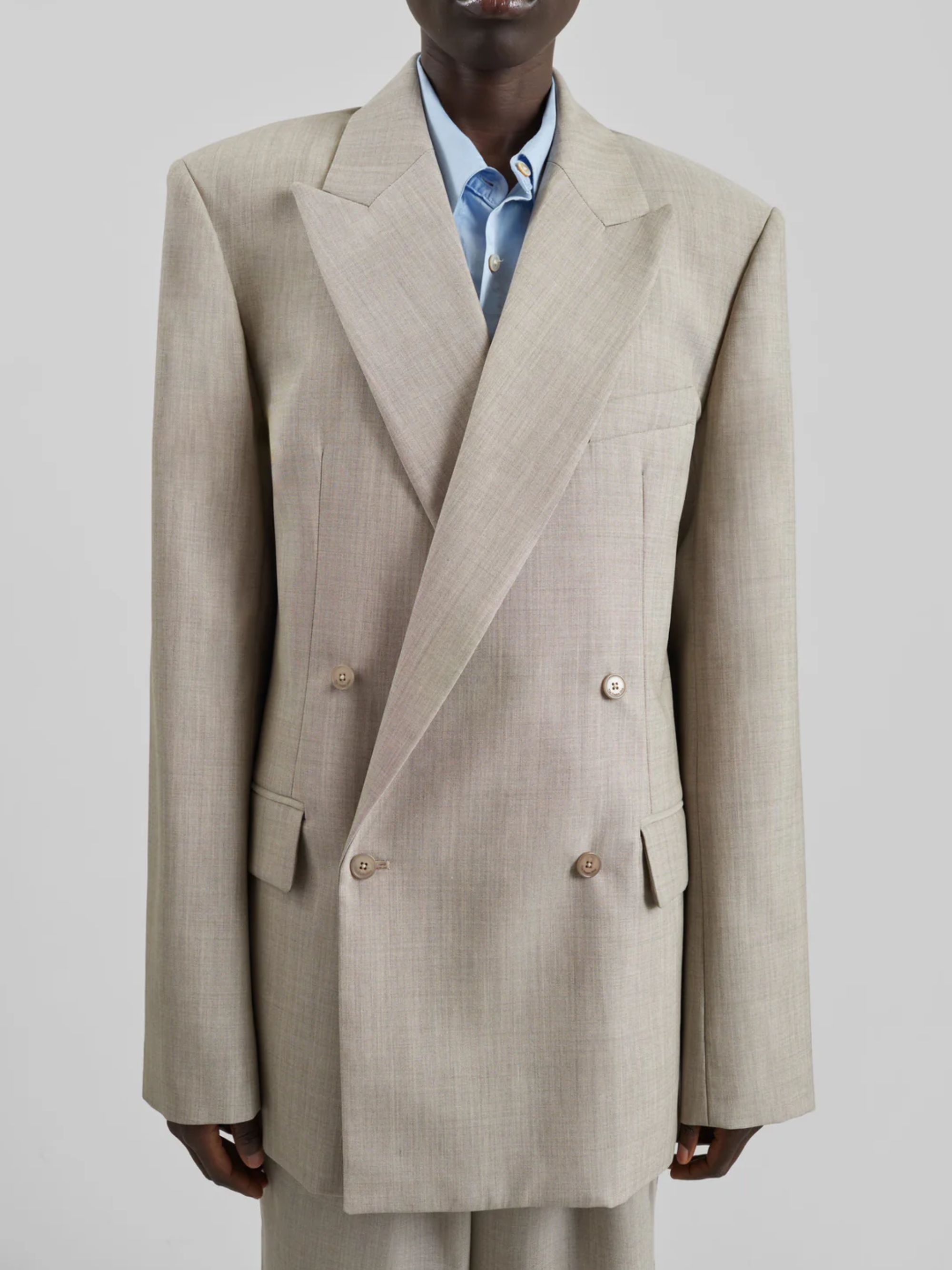 Newark blazer by THE FRANKIE SHOP in beige melange in light virgin wool, featuring padded shoulders, welt chest pocket, front pockets and double-breasted button fastening.