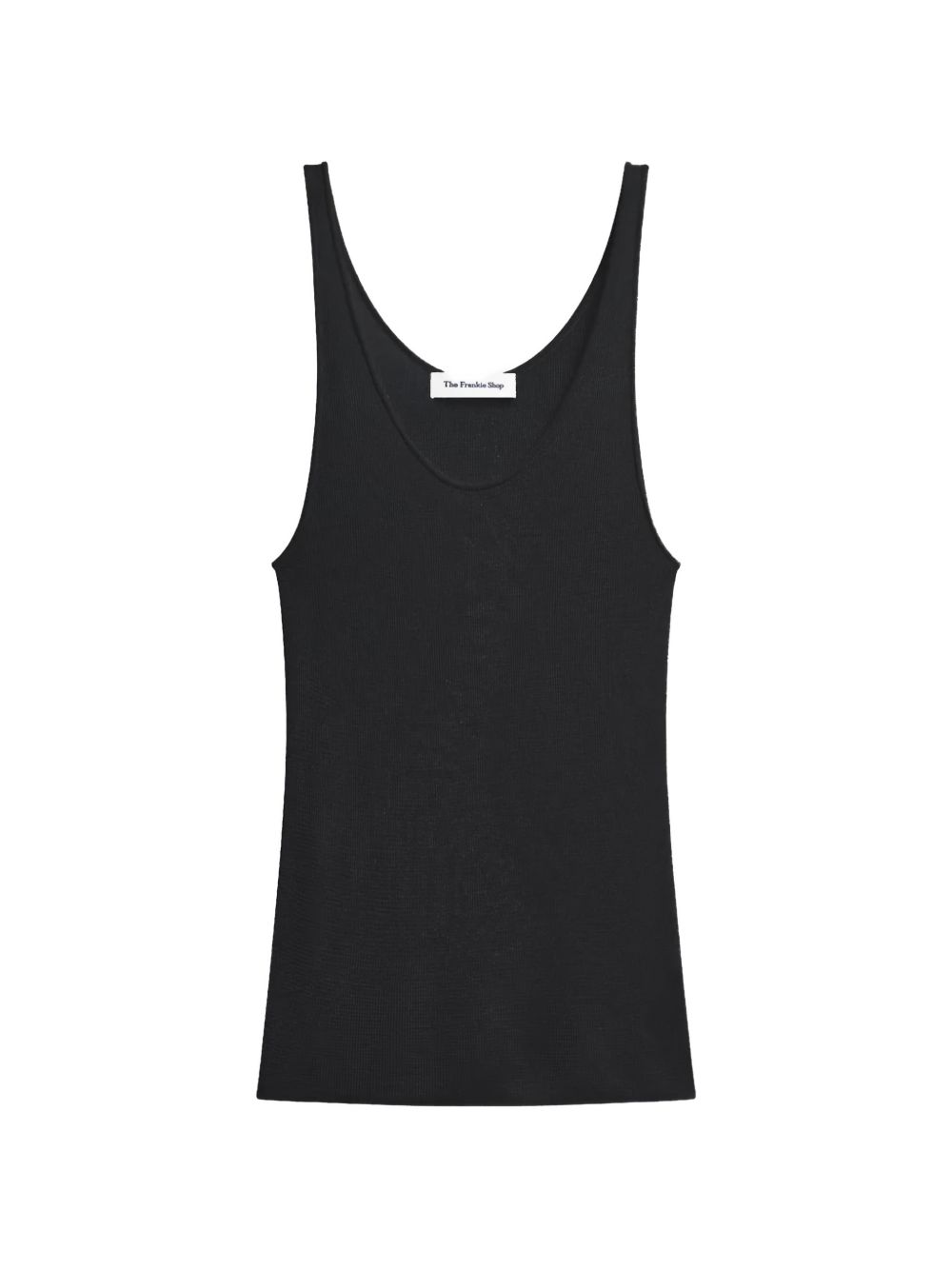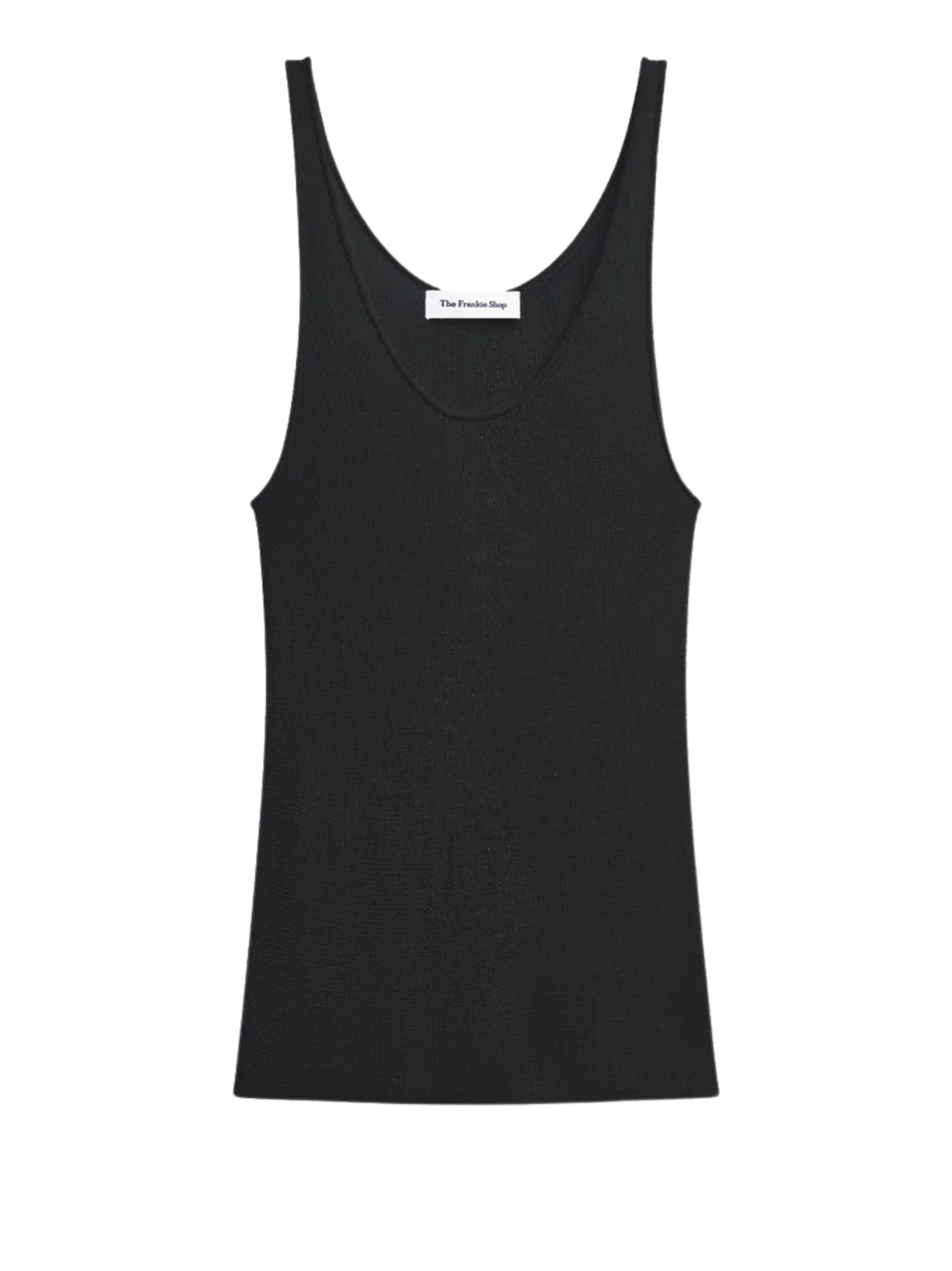 THE FRANKIE SHOP Rivo top in black rayon with light ribbing, a fitted fit, a low, flared collar, and an unlined design.