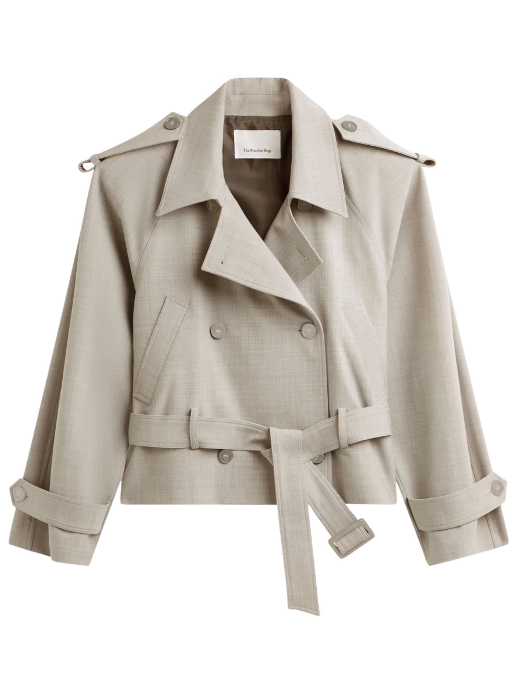 THE FRANKIE SHOP Stan trench coat in beige melange wool features a cropped design, padded shoulders, an internal slip pocket, front welt pockets, belt loops, and a double-breasted closure.