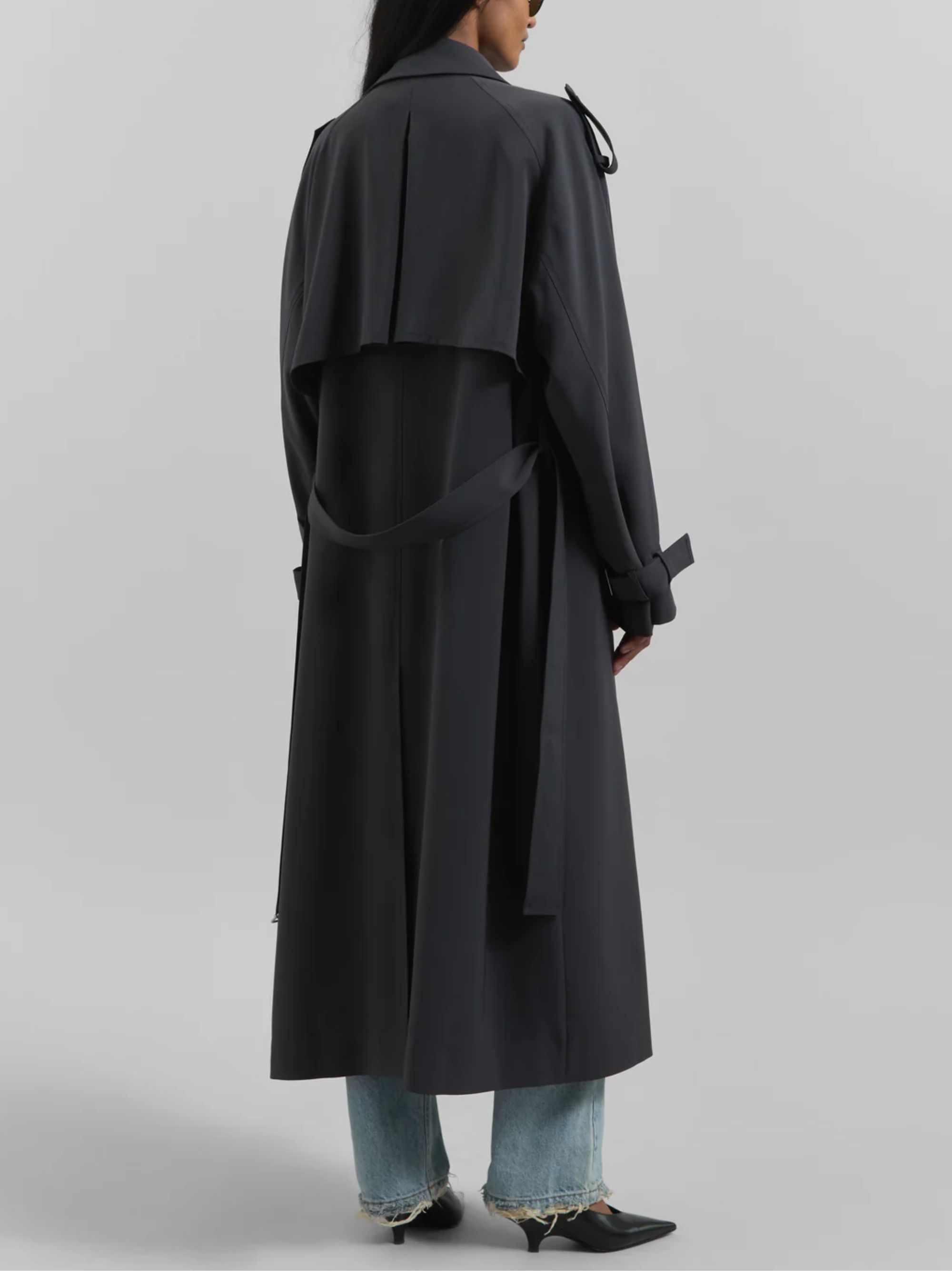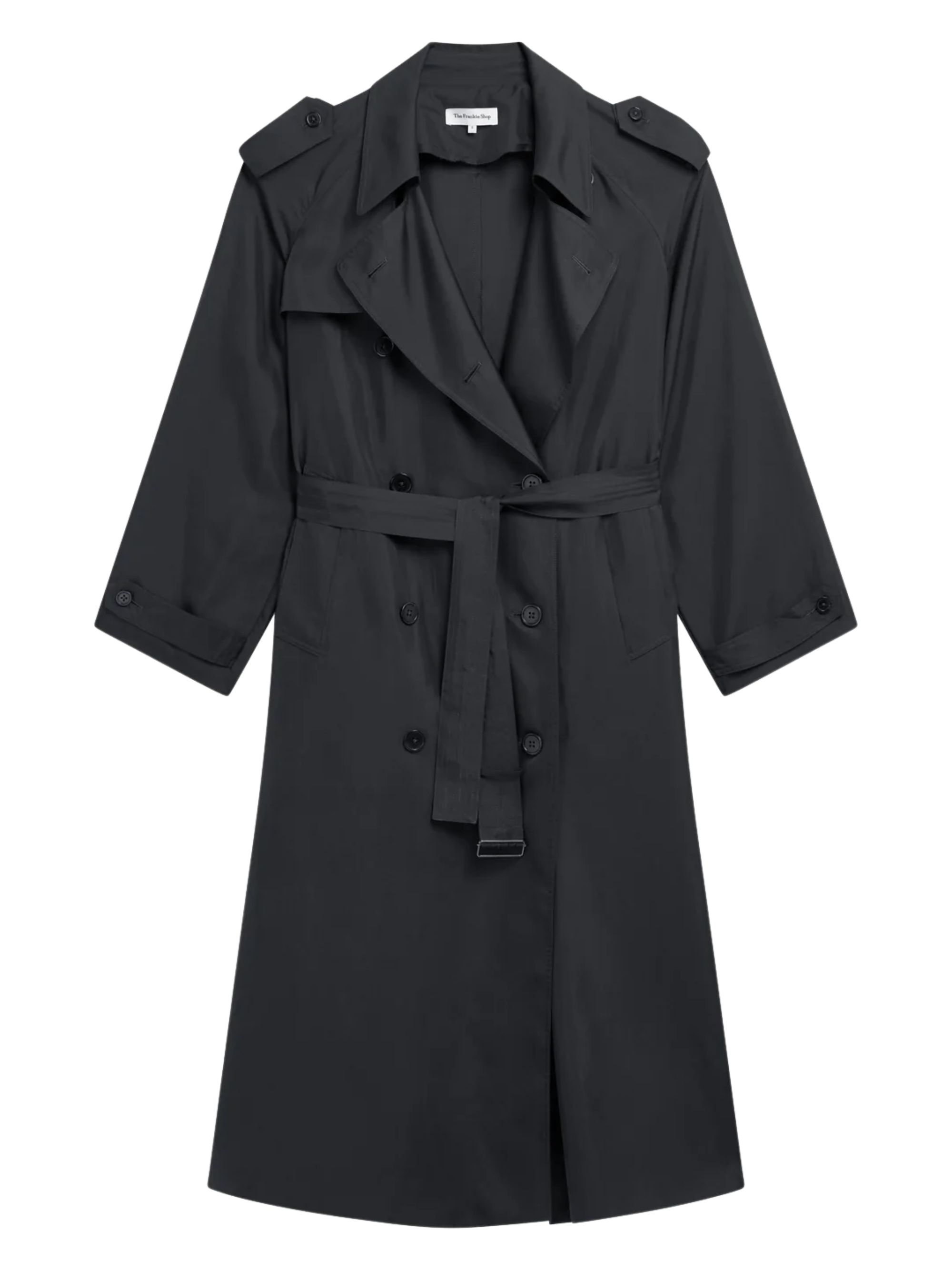 Veyron trench coat by THE FRANKIE SHOP in grey in flowing fabric with a regular fit, shoulder pads, a windbreaker, a removable belt, belted cuffs, a back slit, unlined and a button fastening.
