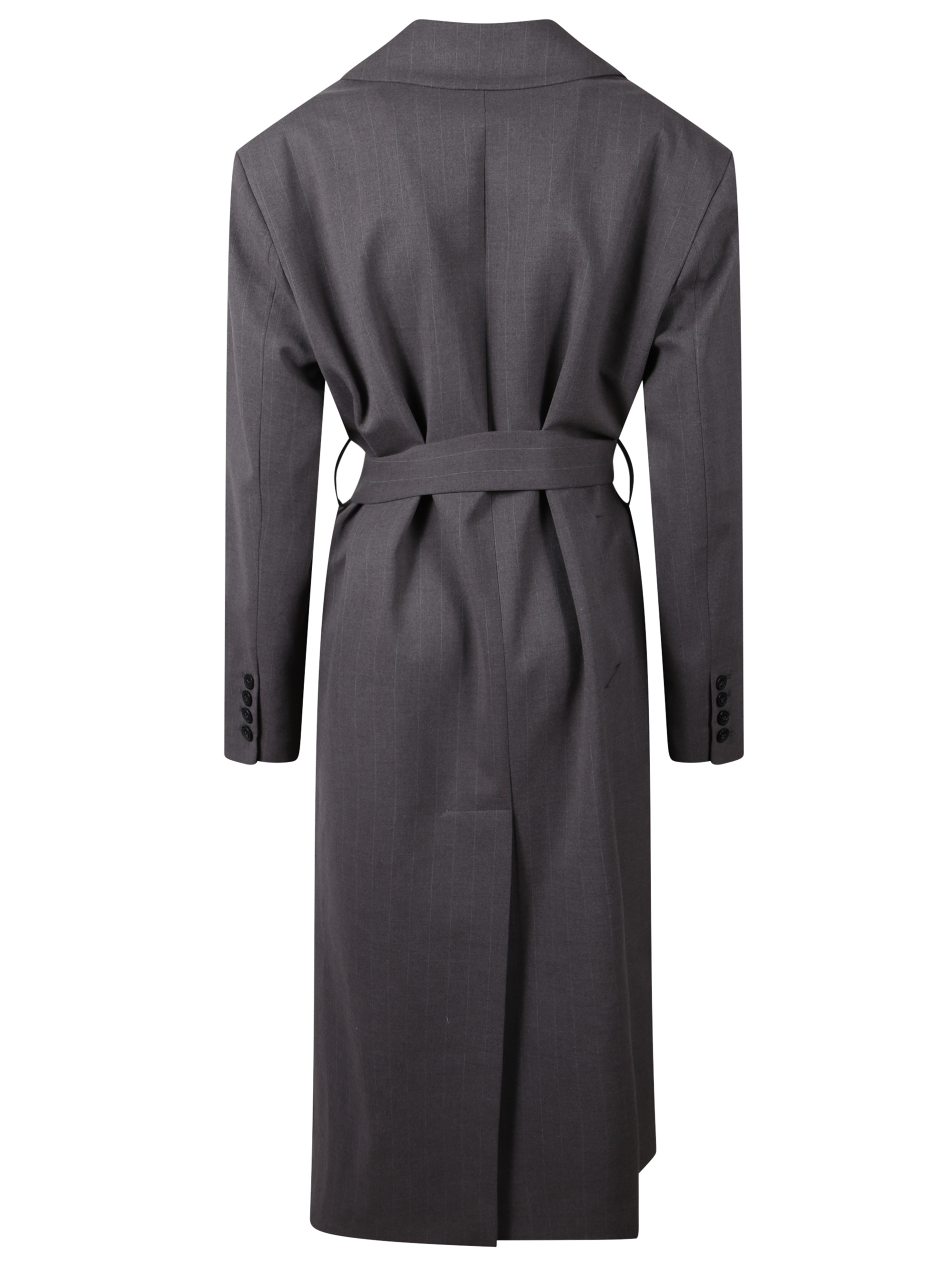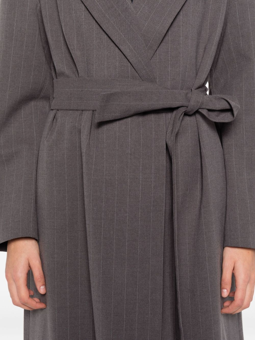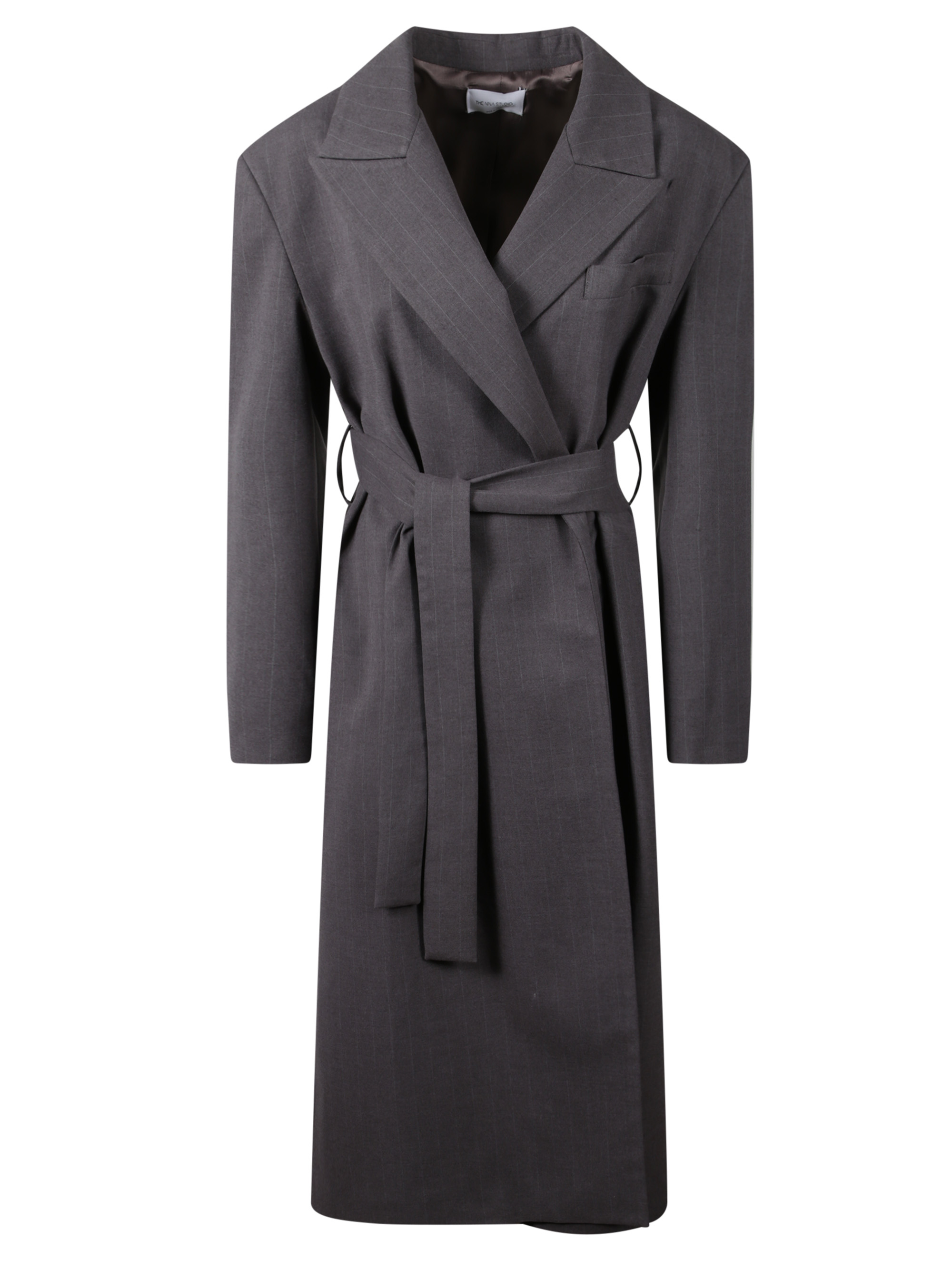 THE NINA STUDIO grey pinstripe belted coat featuring peak lapels, a detachable belt, buttoned cuffs, a back vent and a chest pocket.