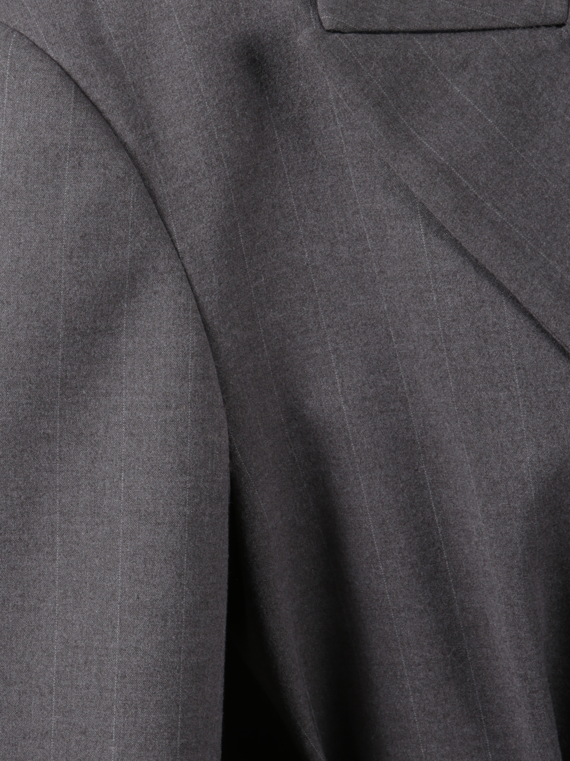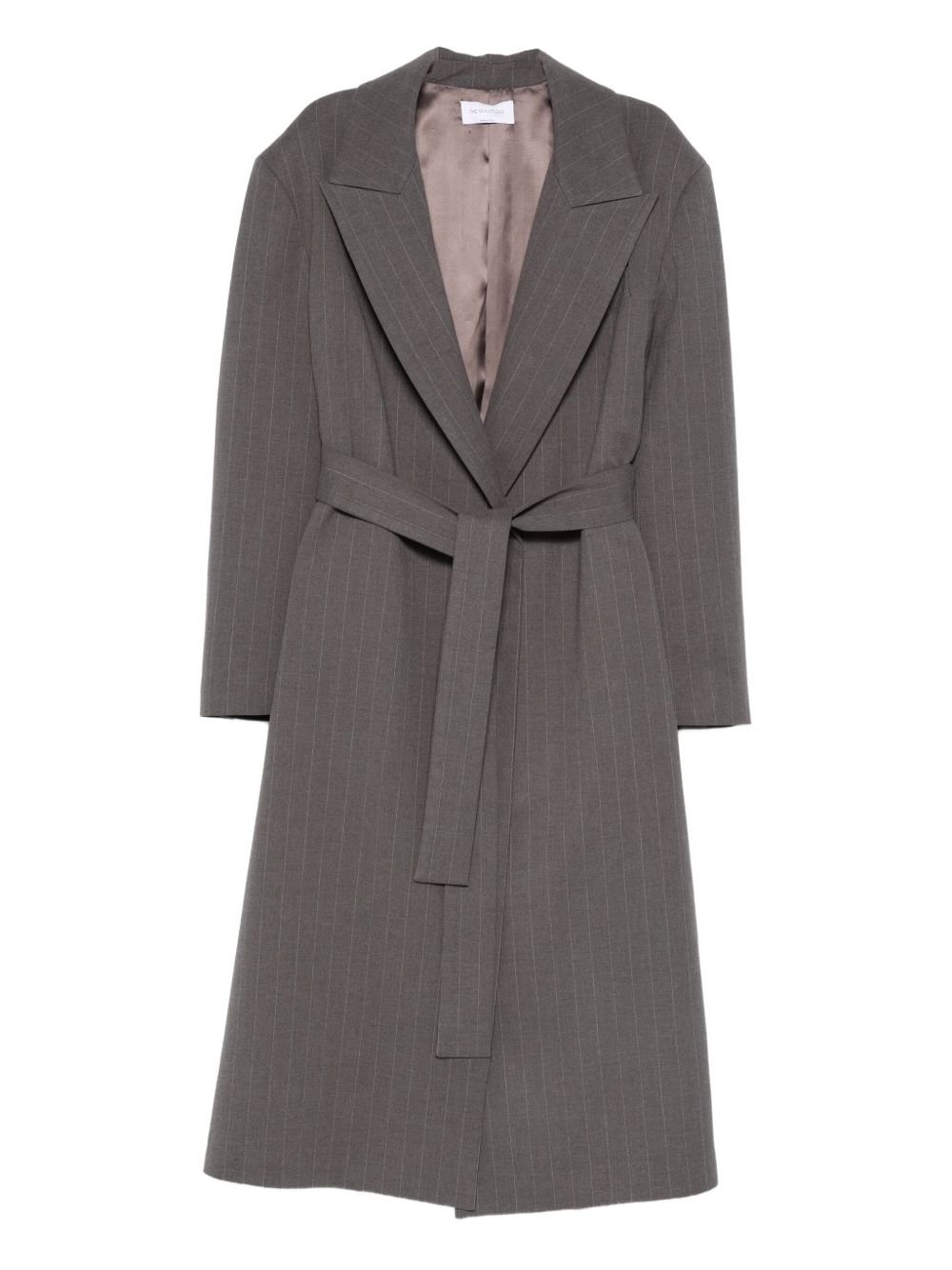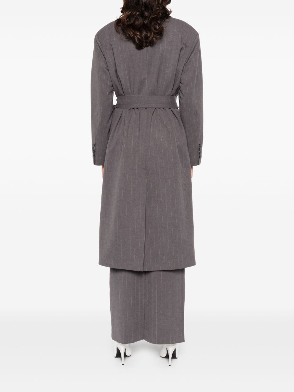 THE NINA STUDIO grey pinstripe belted coat featuring peak lapels, a detachable belt, buttoned cuffs, a back vent and a chest pocket.
