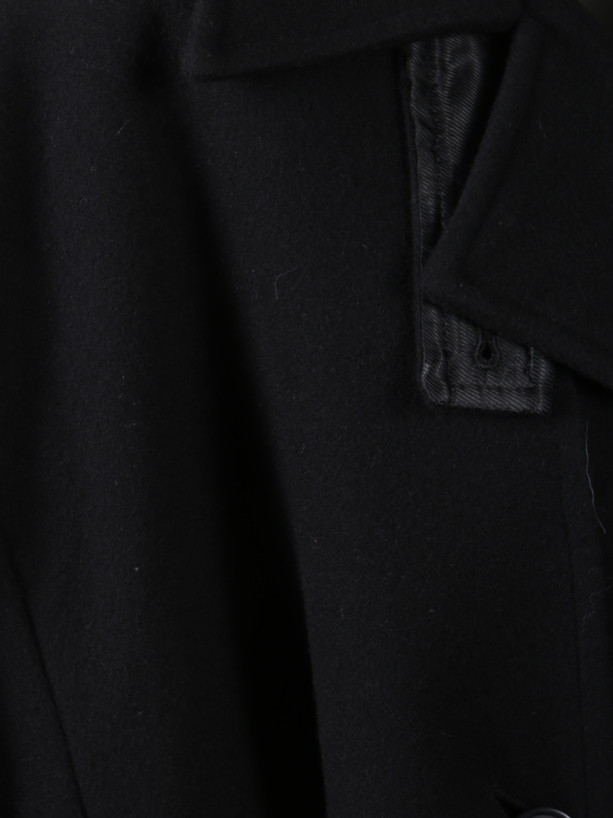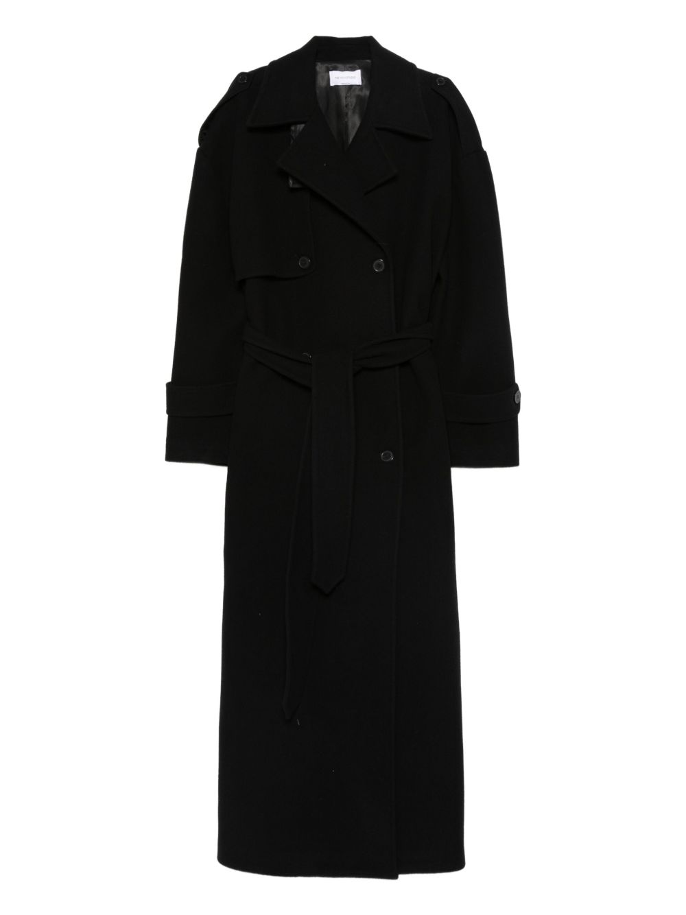 Double-breasted belted coat by THE NINA STUDIO in black fabric, featuring double-breasted button fastening, shoulder pads, detachable belt and peak lapels.
