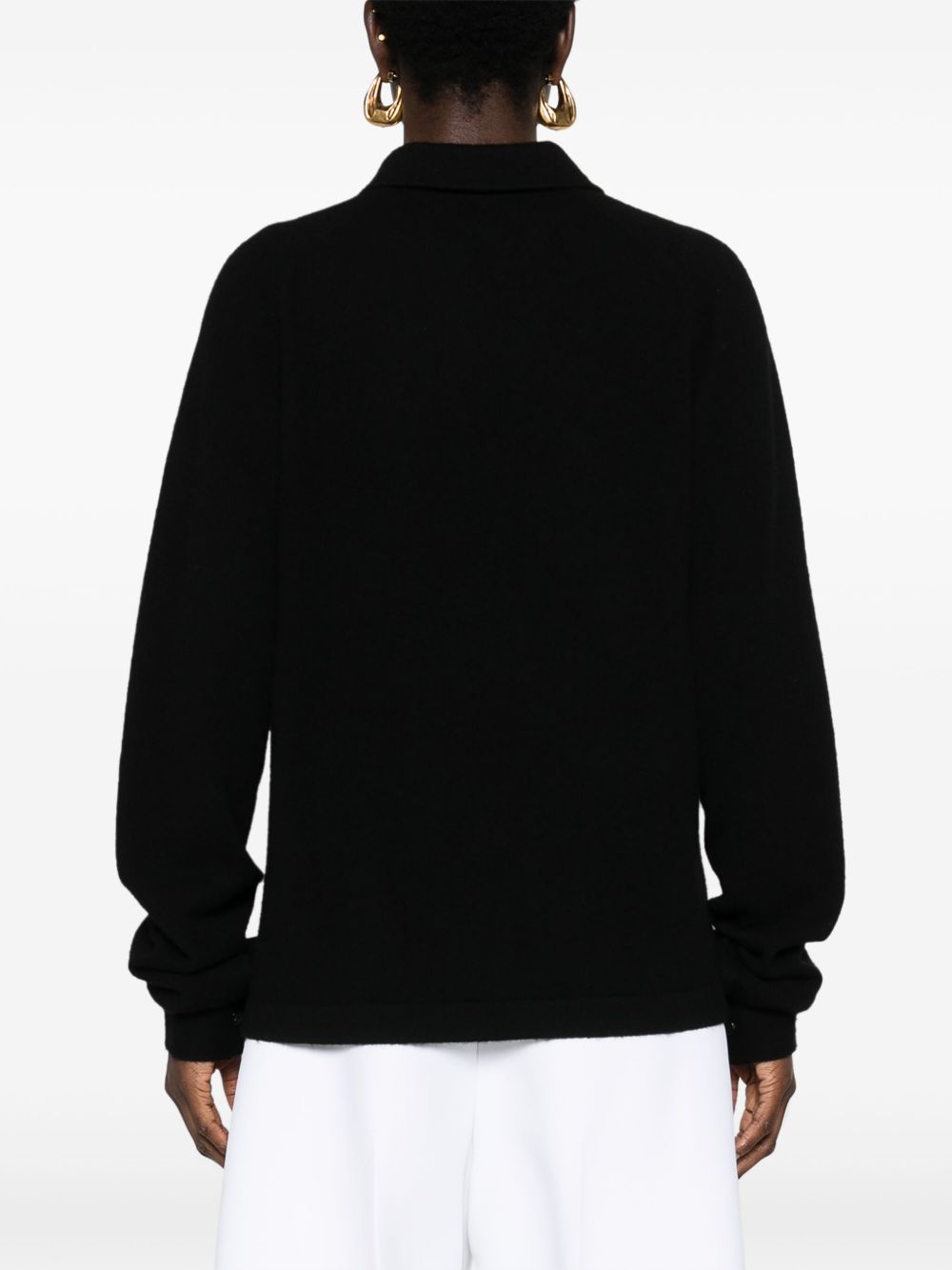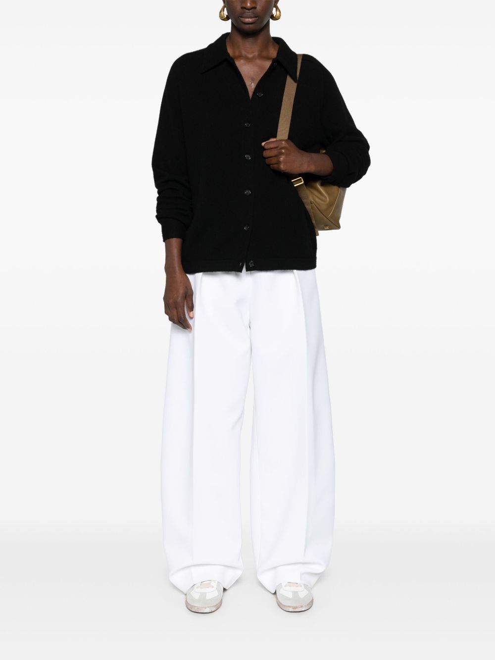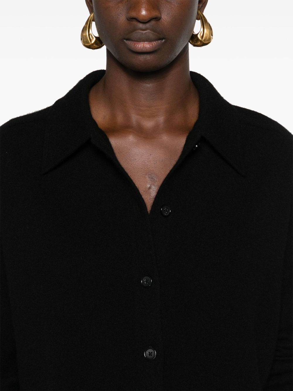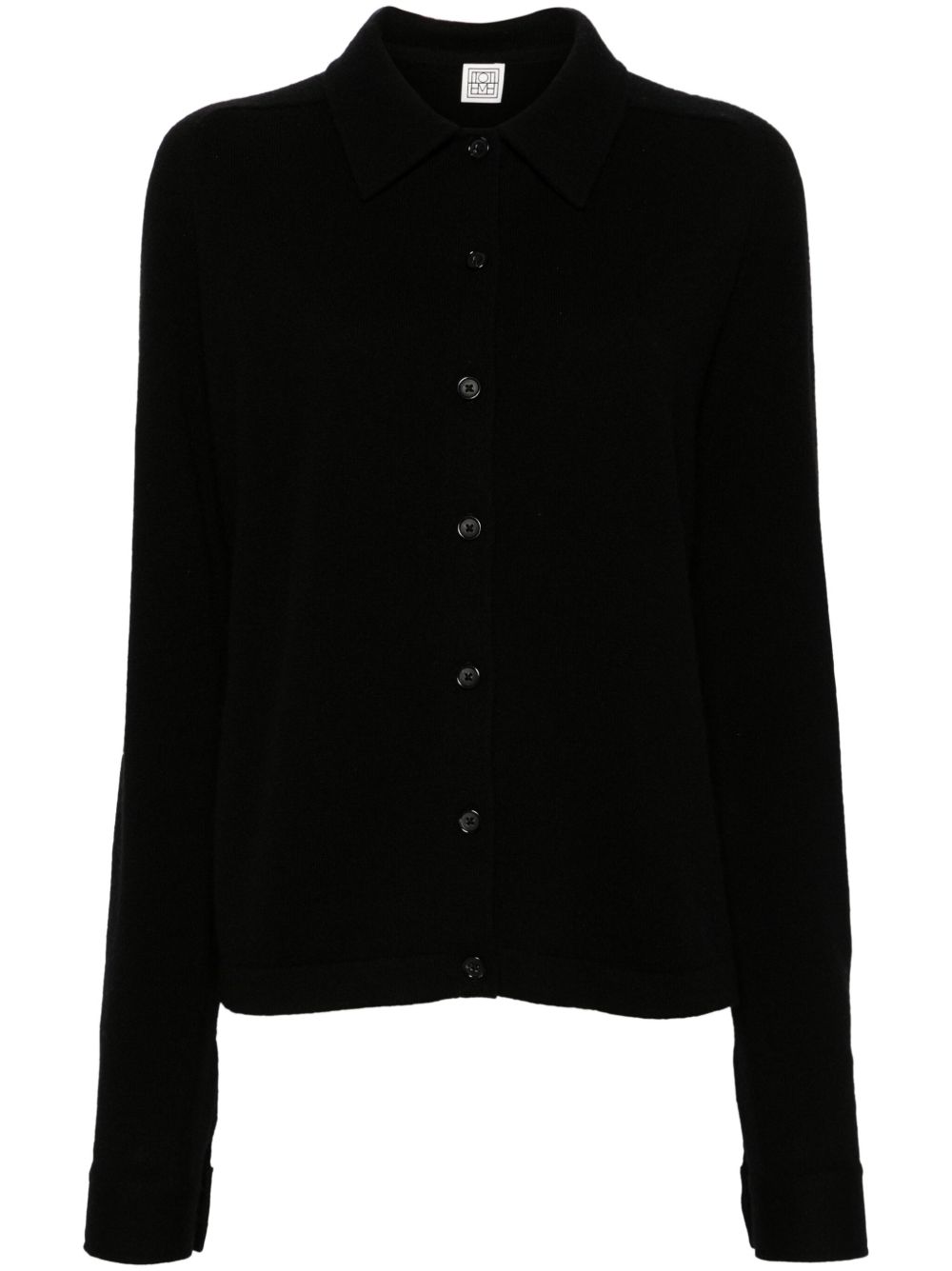 Black cashmere knit cardigan with a TOTEME collar, ribbed hem, and a front button closure.