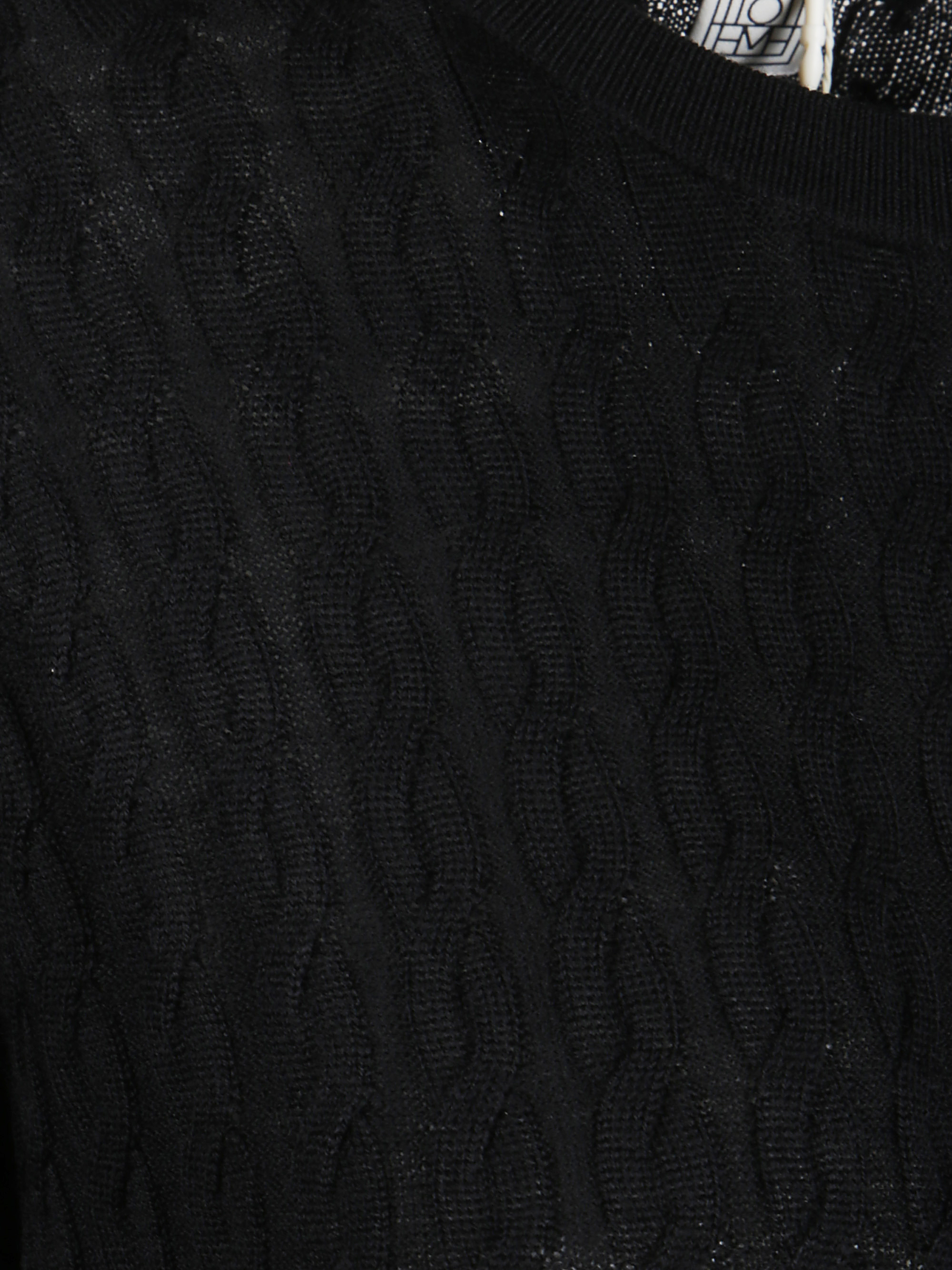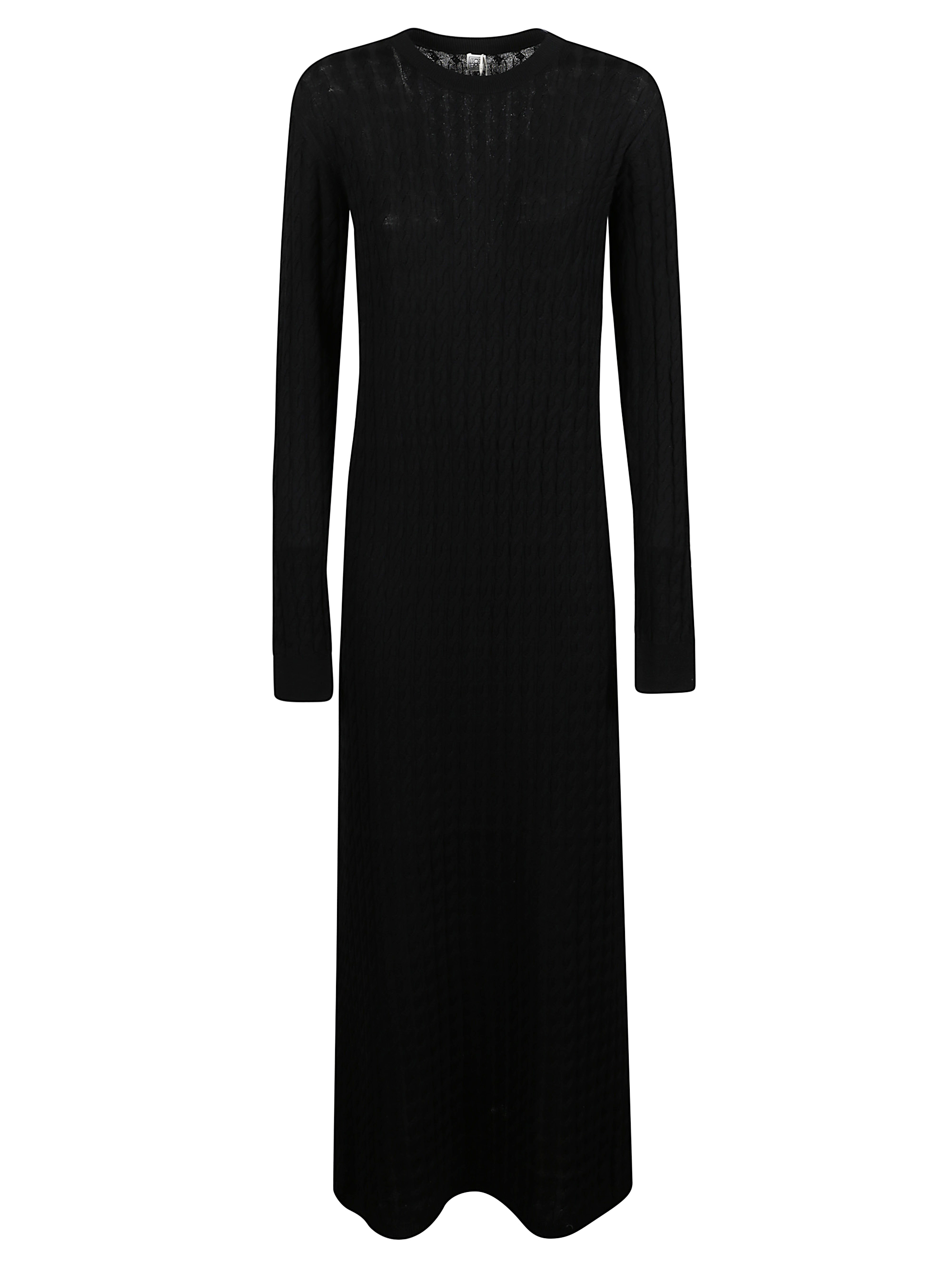 Long cable-knit dress by TOTEME in black wool, ribbed crew neck, long sleeves and ribbed cuffs and hem.