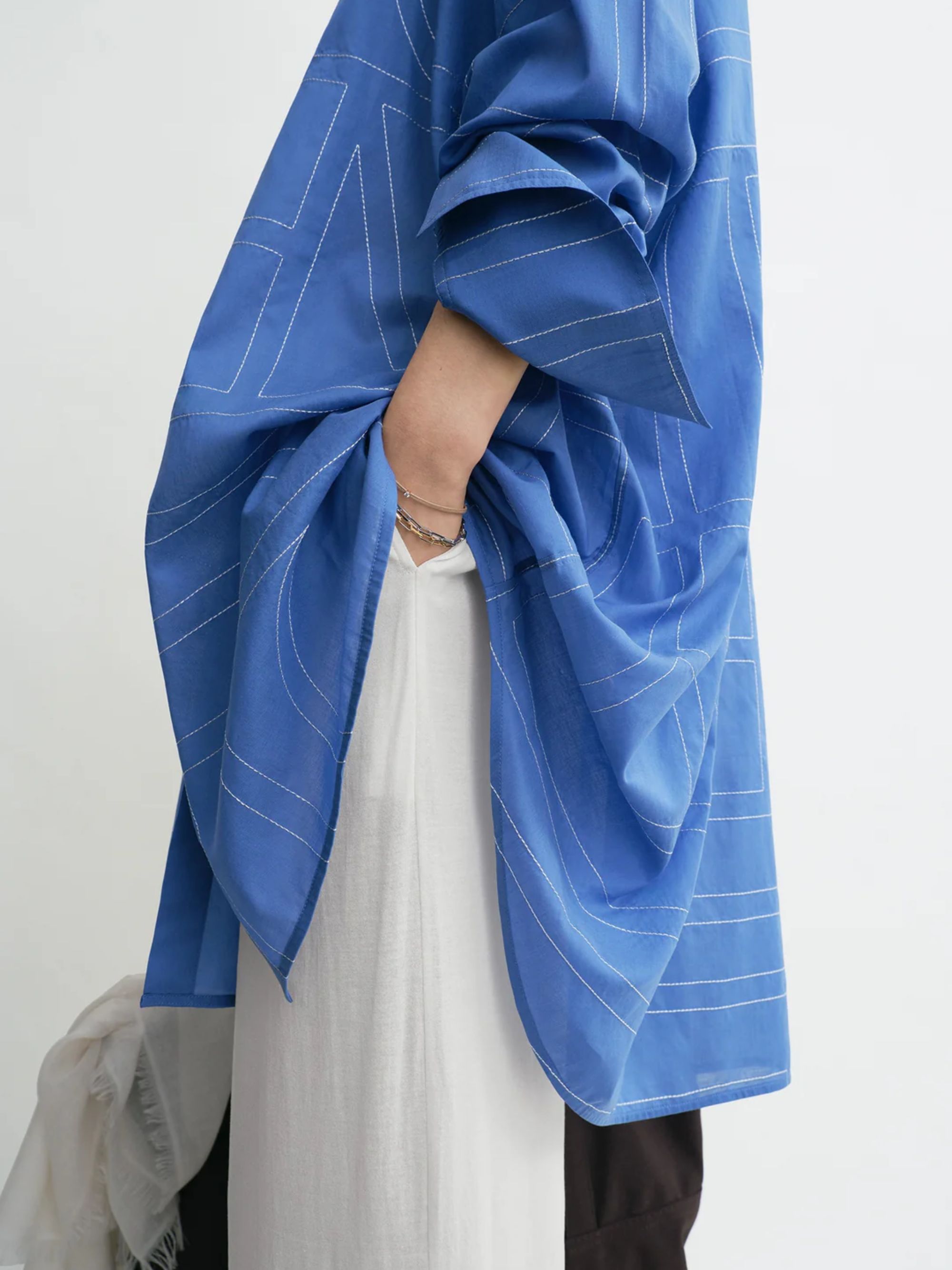TOTEME Long shirt in blue cotton and lyocell, featuring mother-of-pearl button fastening, buttoned cuffs, white monogram embroidery and classic collar.