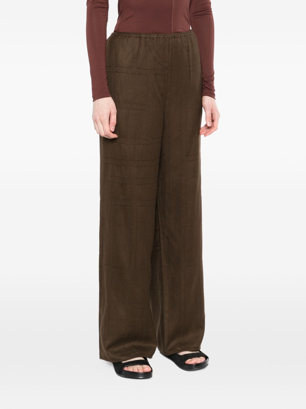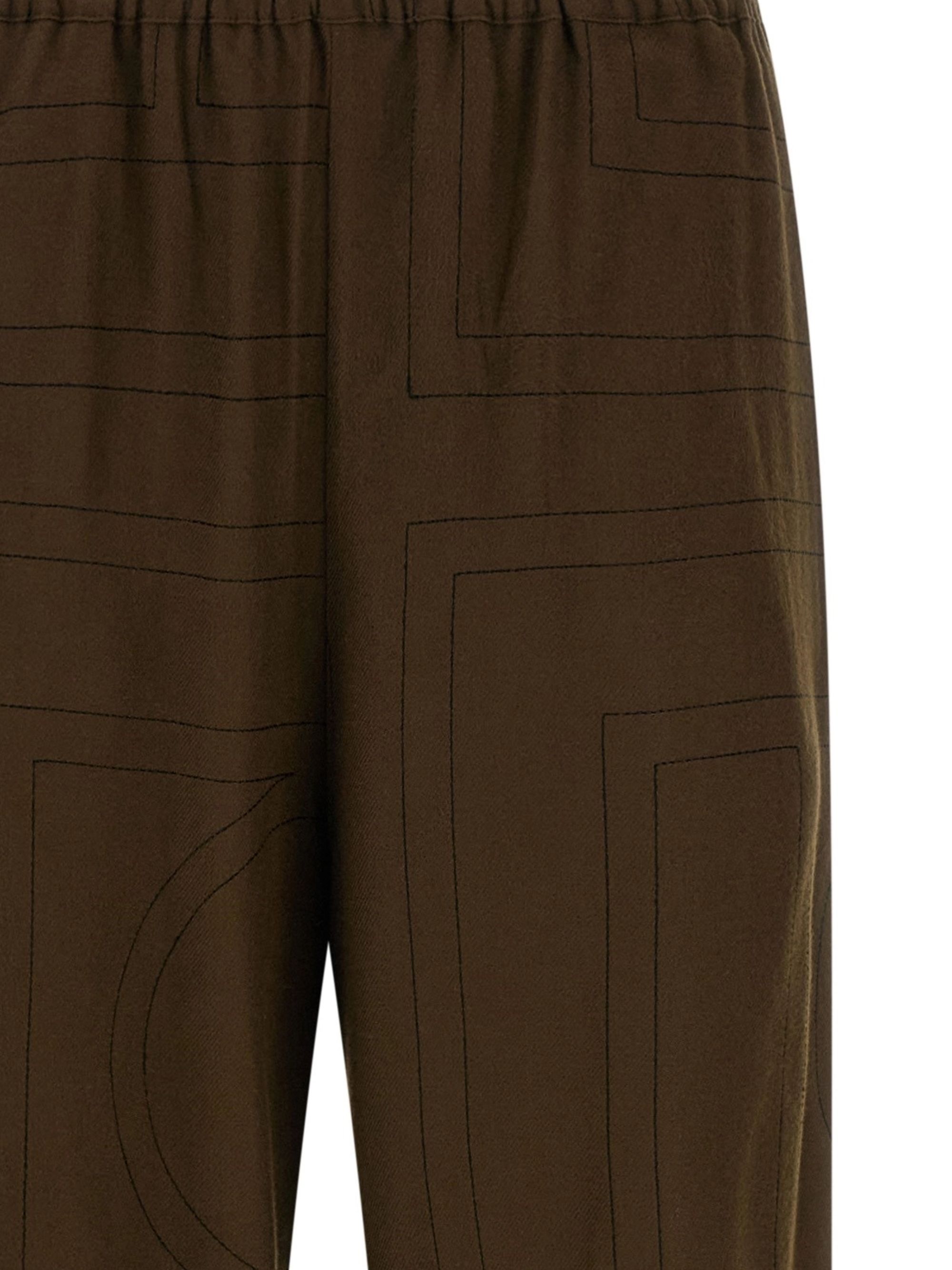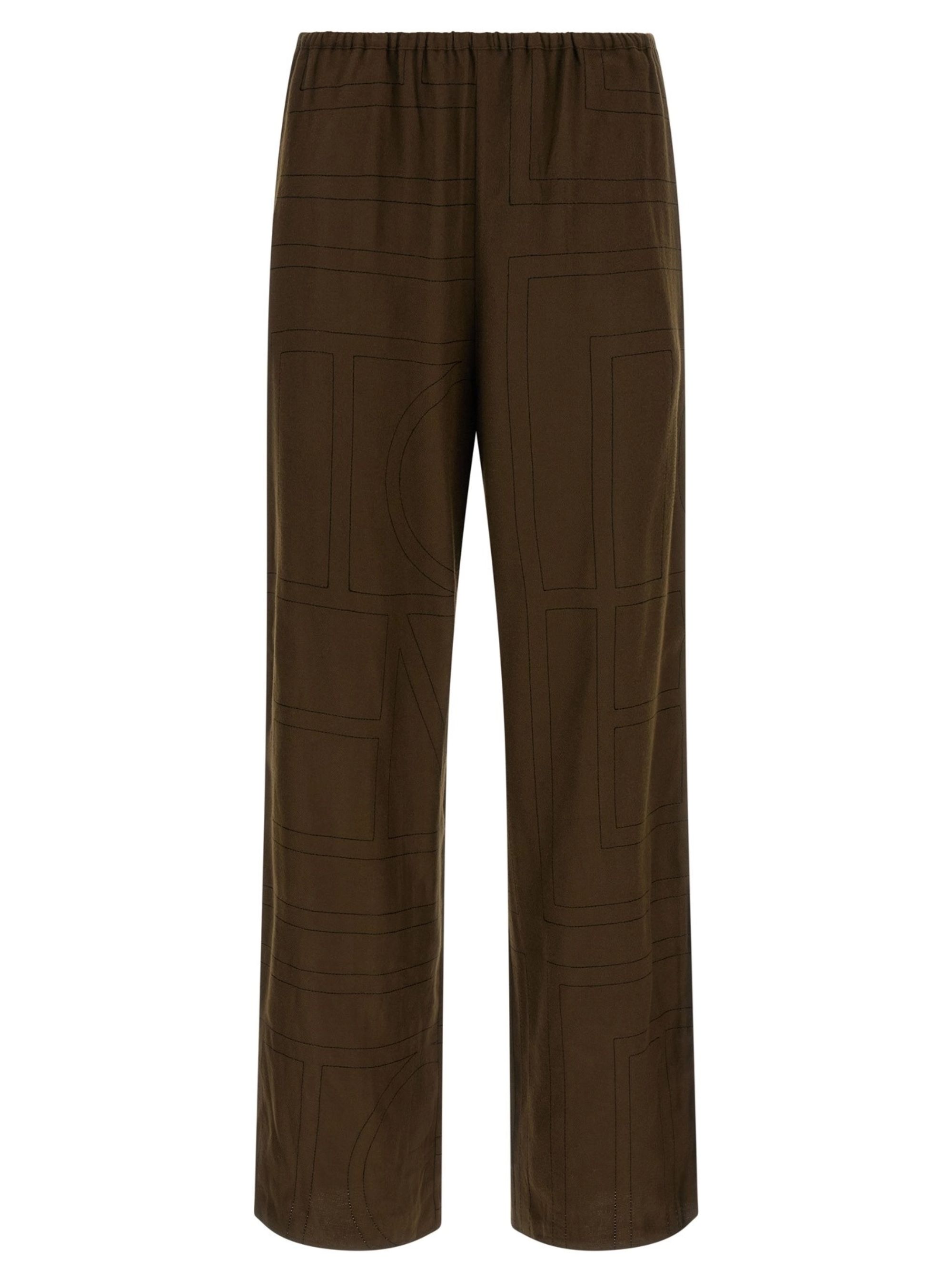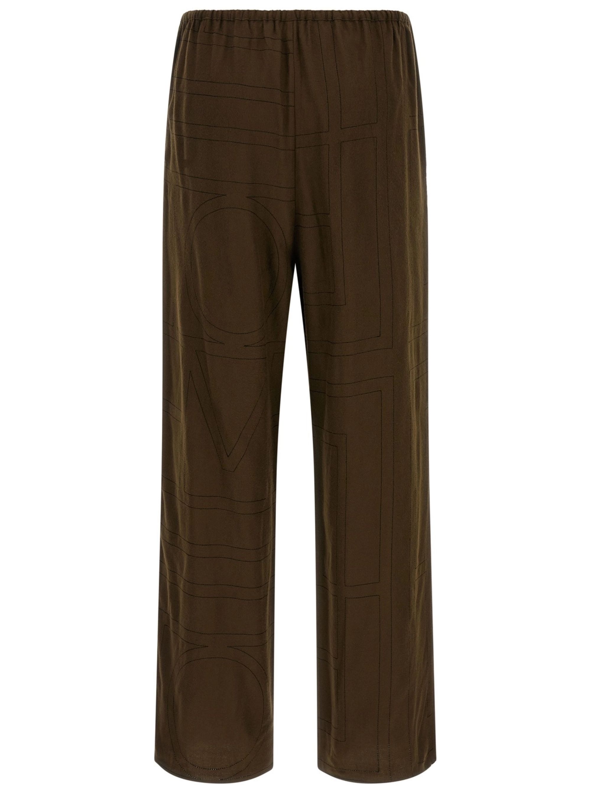 TOTEME brown modal monogram pants, featuring an elasticated high waist, two side pockets, a monogram, and a straight hem.