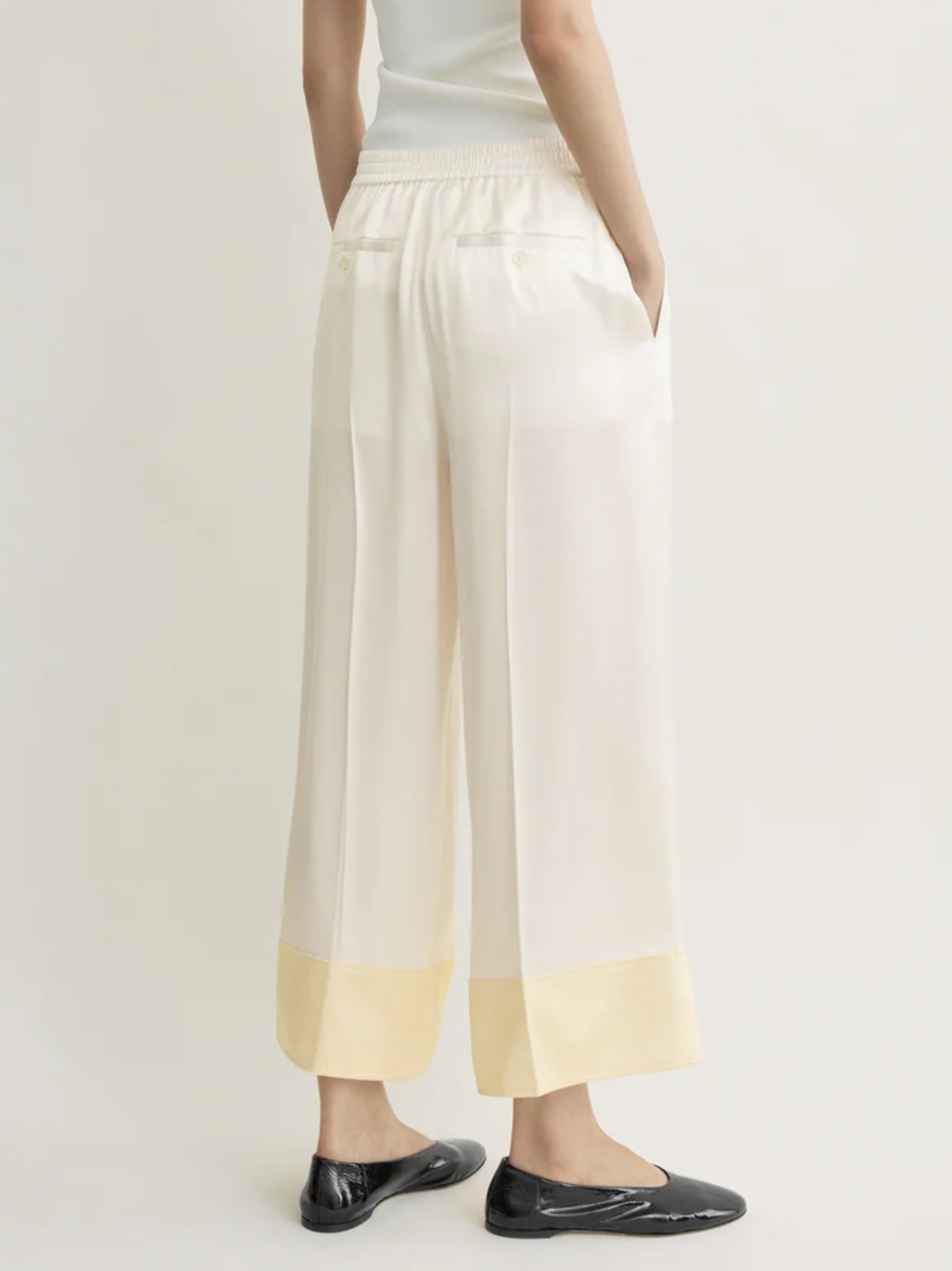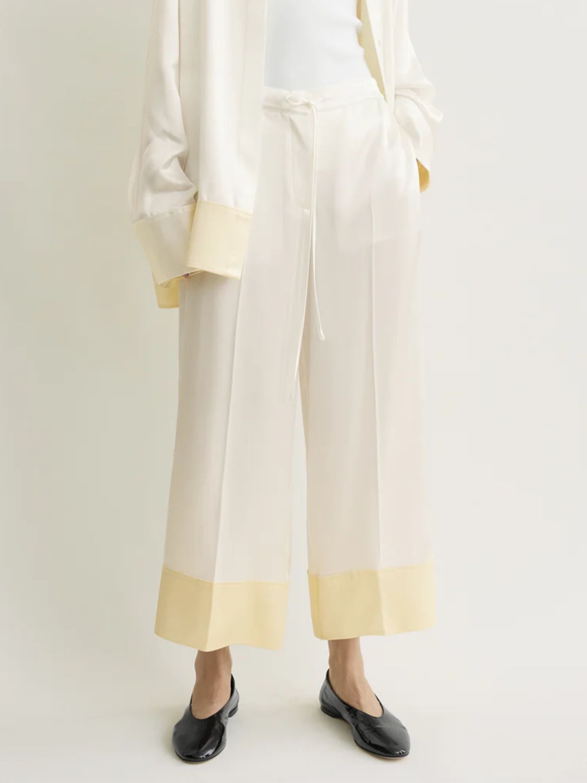 TOTEME white satin trousers in viscose featuring a wide leg, two-tone detail and an elasticated waist with drawstring at the waist.