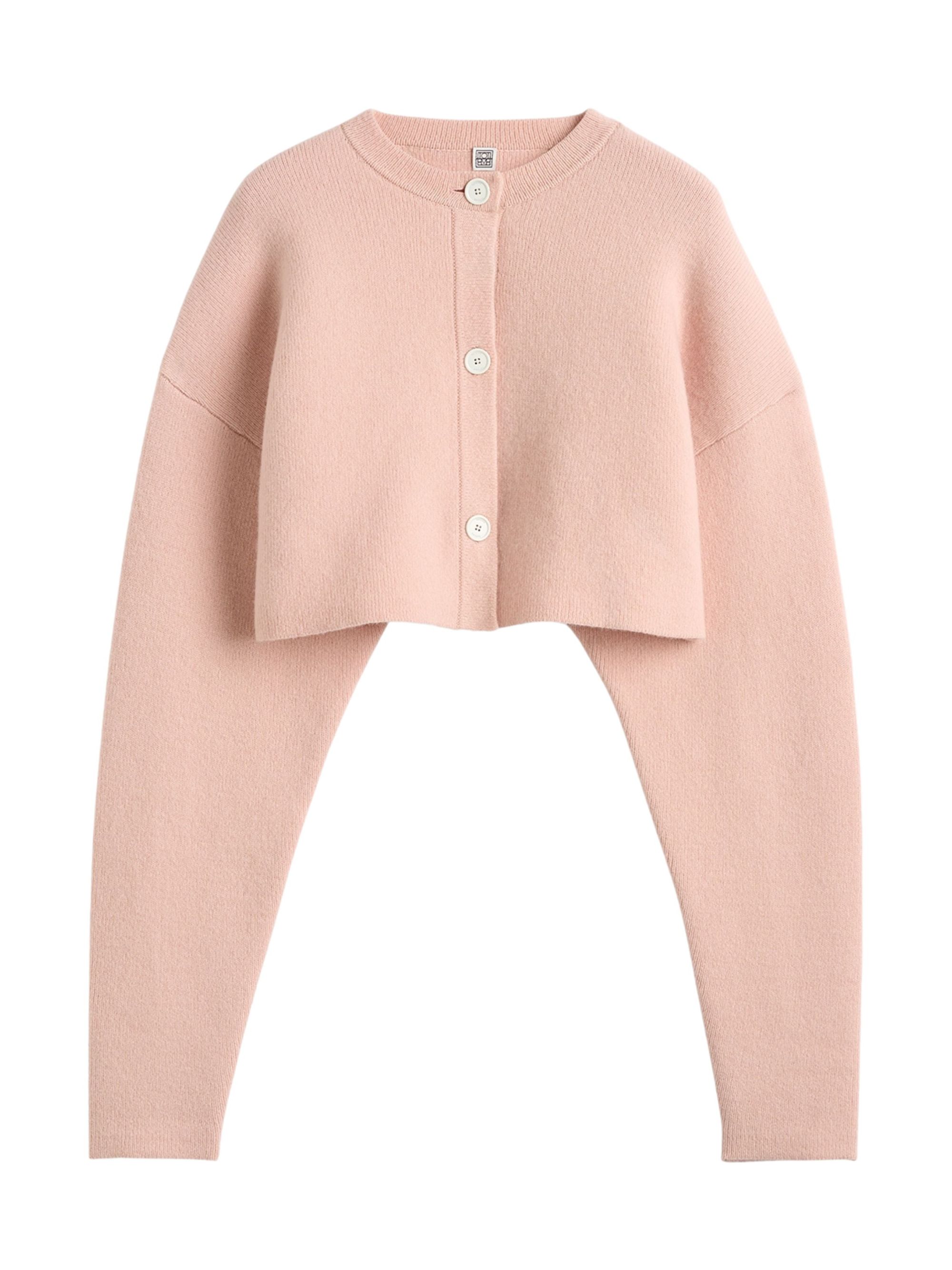 Cropped cardigan by TOTEME in pink wool, featuring a button fastening, dropped shoulders, a crew neck, long sleeves, a cropped design and ribbed edges.