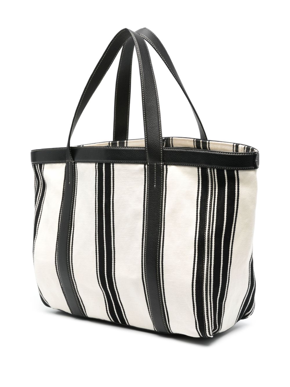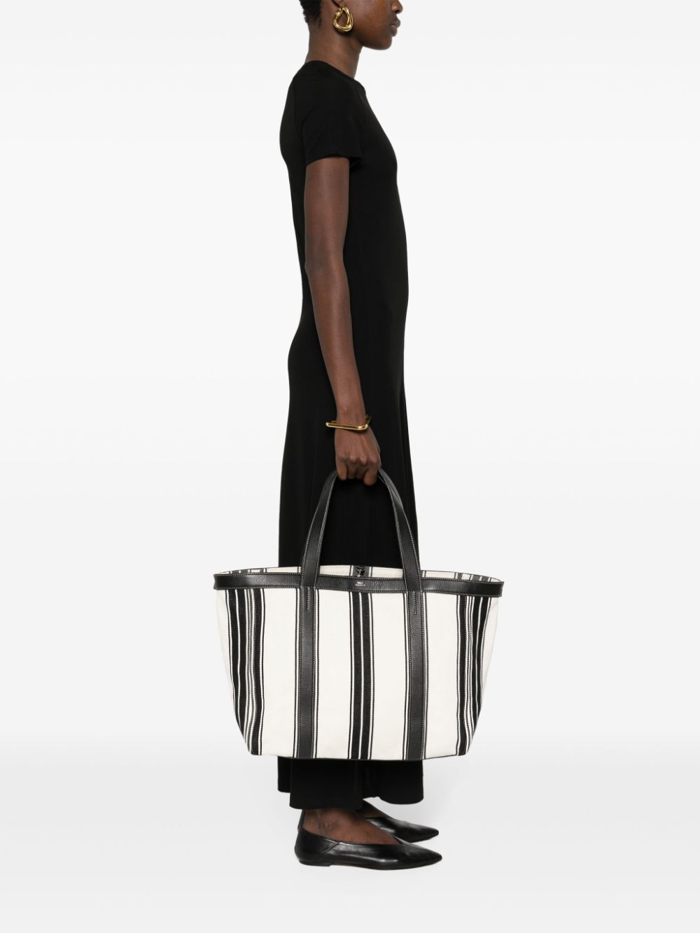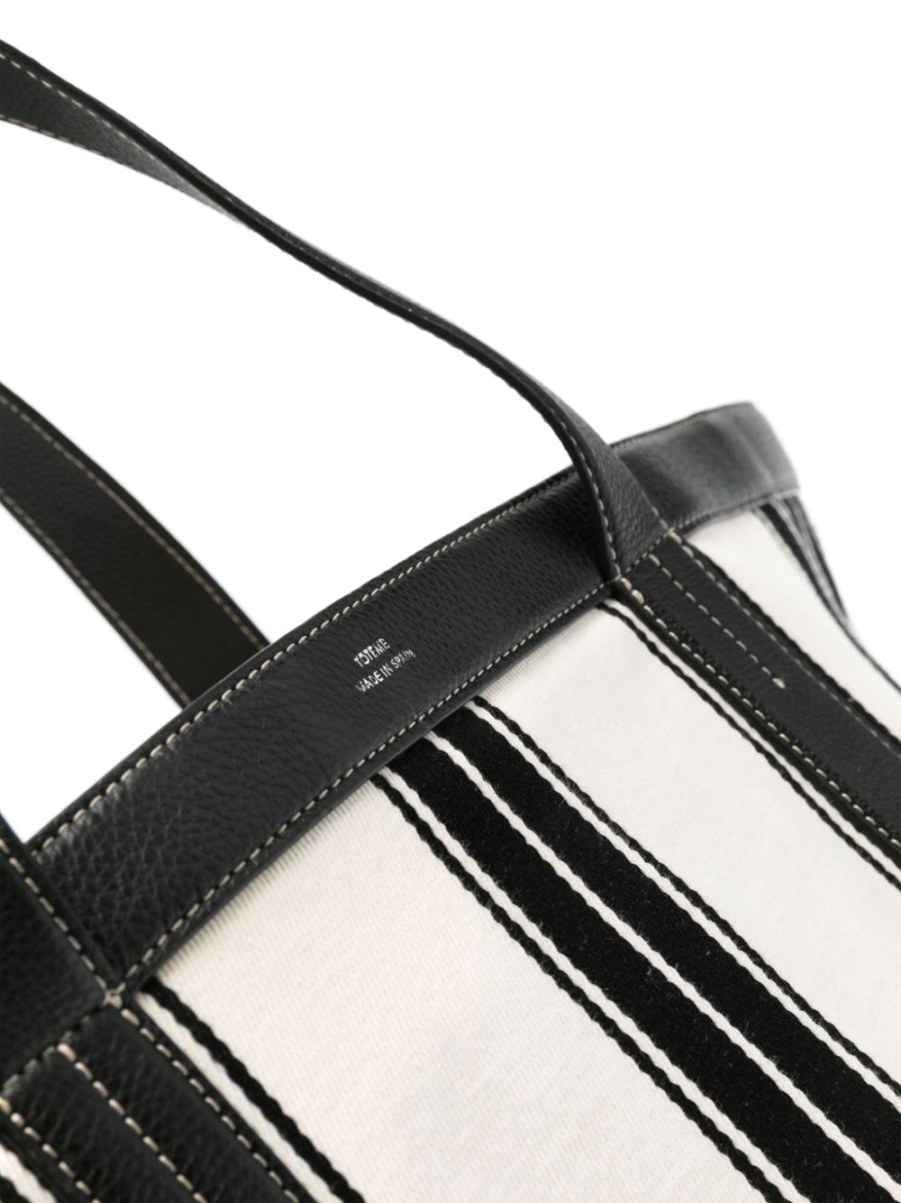 White and black TOTEME striped tote bag in fabric with black leather trim, silver details, lobster clasp closure, flat shoulder straps and internal patch pocket.