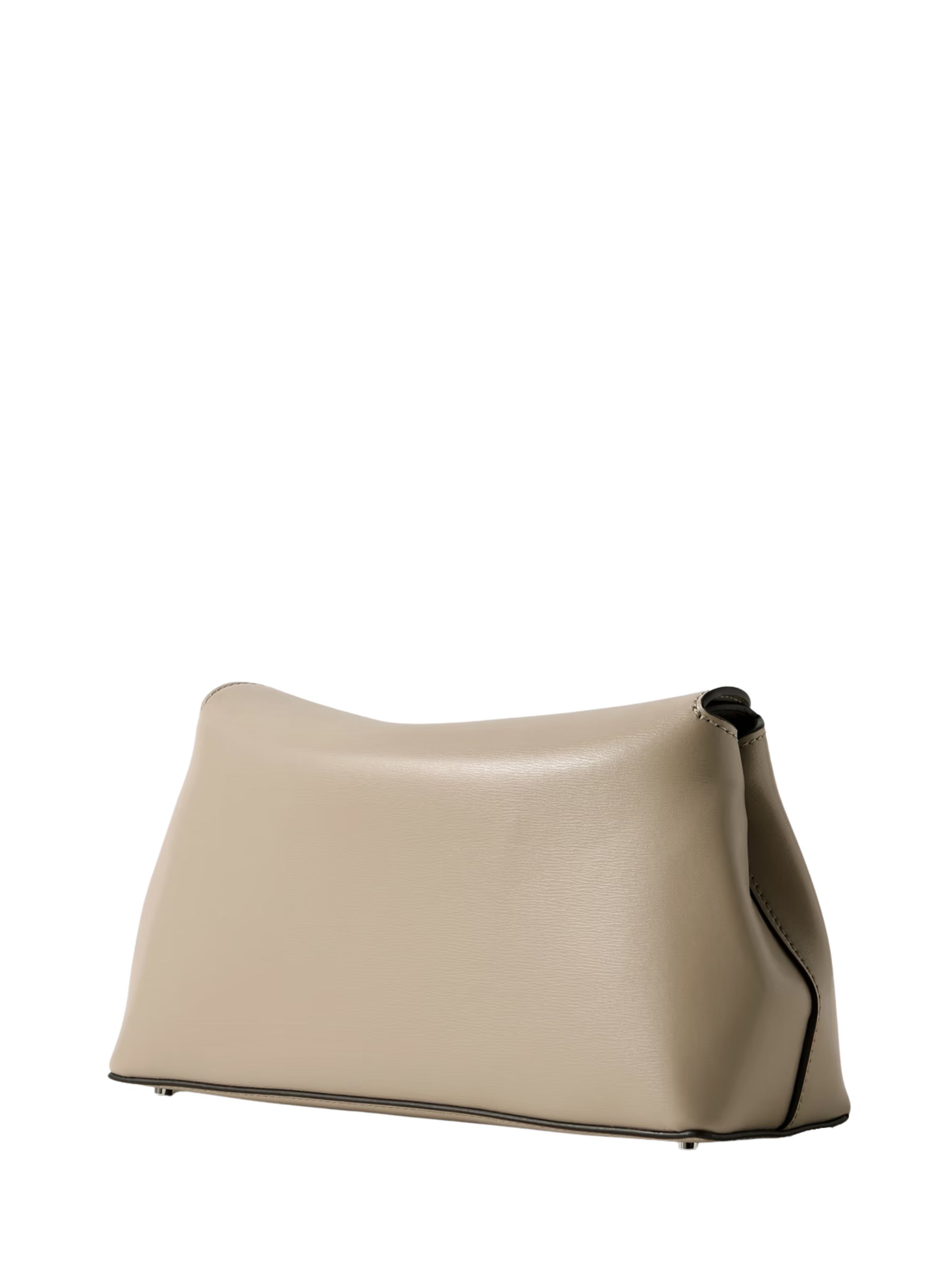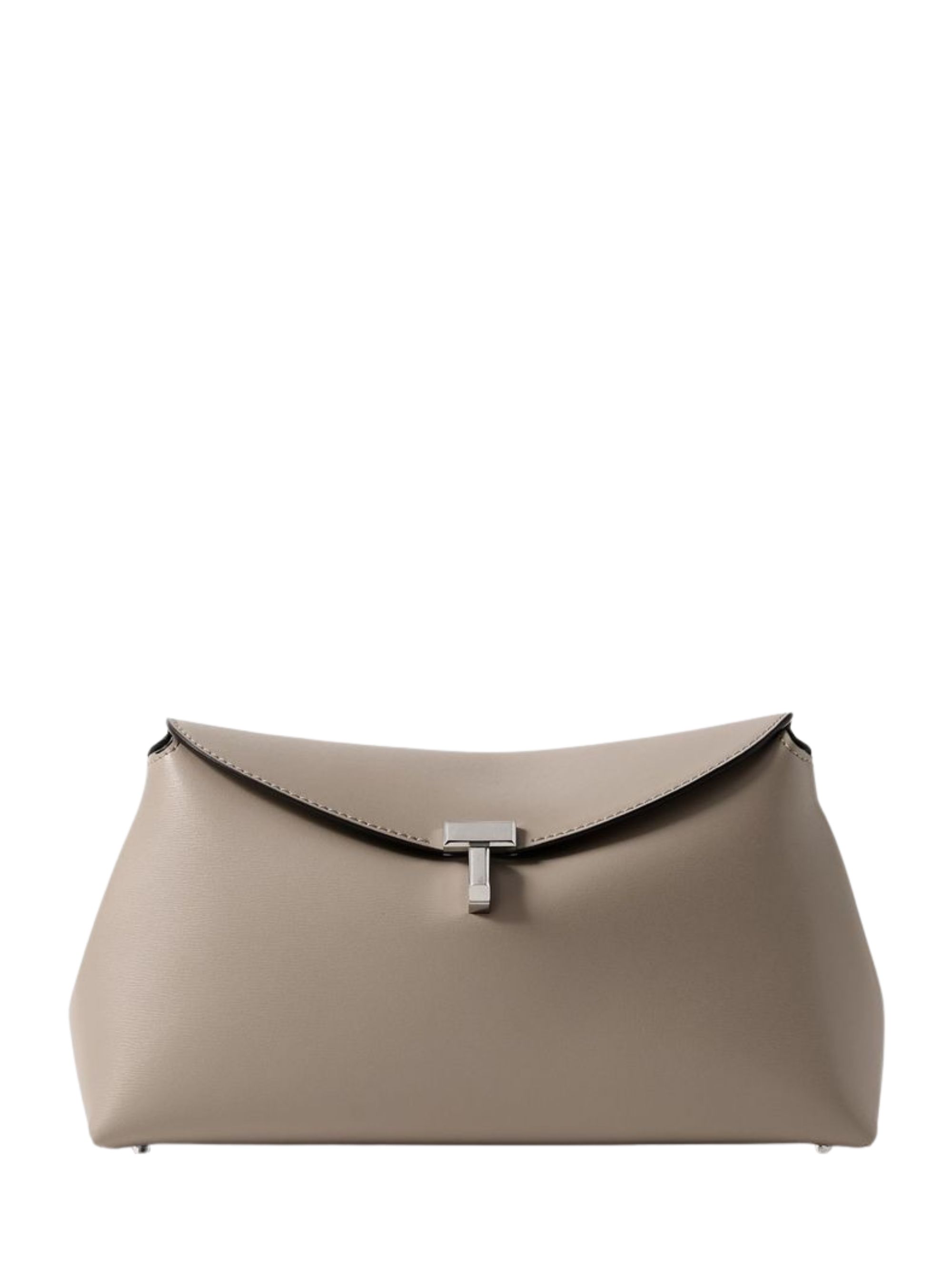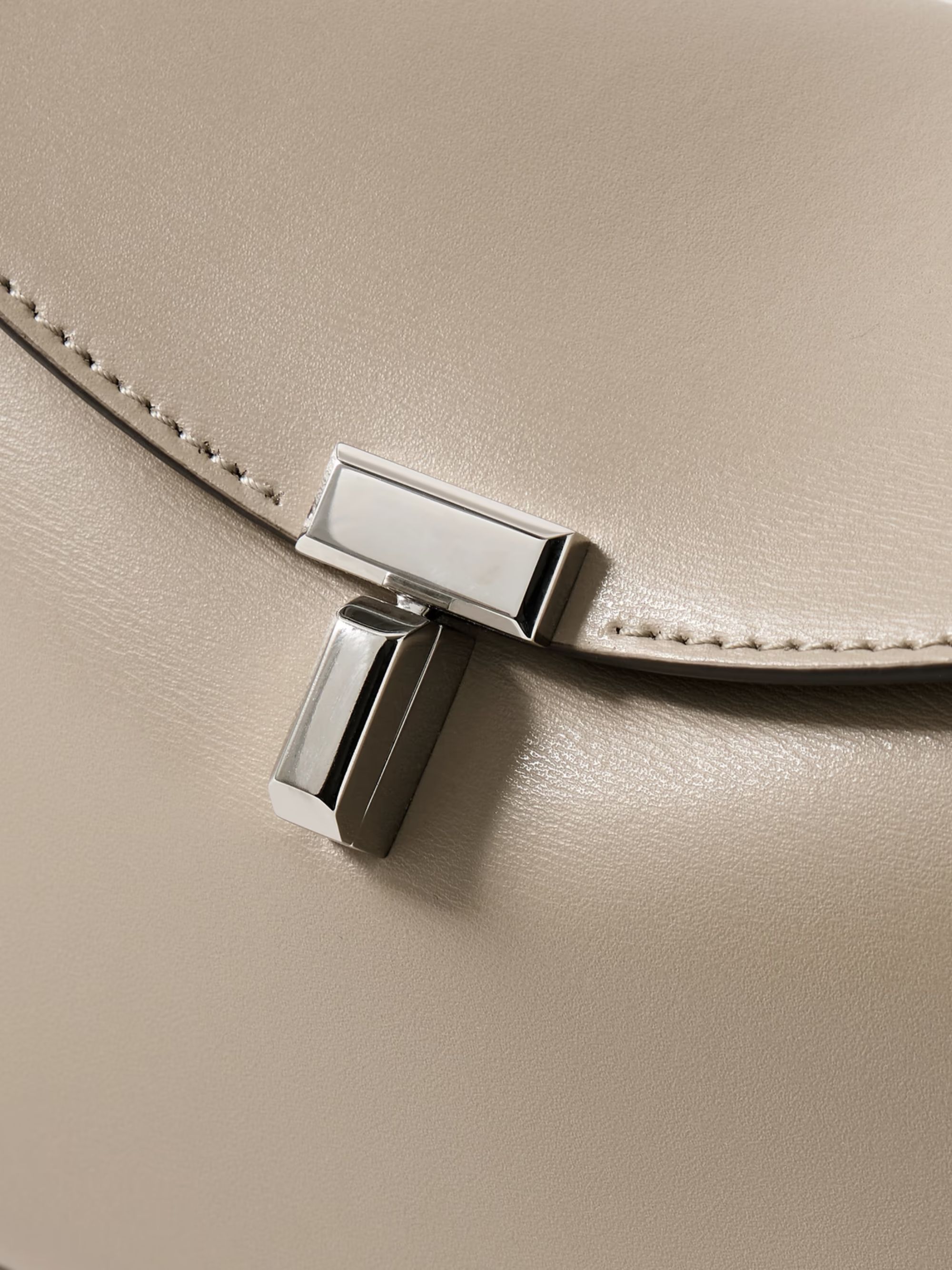 TOTEME beige leather T-Lock bag featuring an adjustable and removable shoulder strap, a top flap, a T-lock flap, a card slot, metal feet, and a single compartment. Dimensions: 26 x 15 x 9 cm.