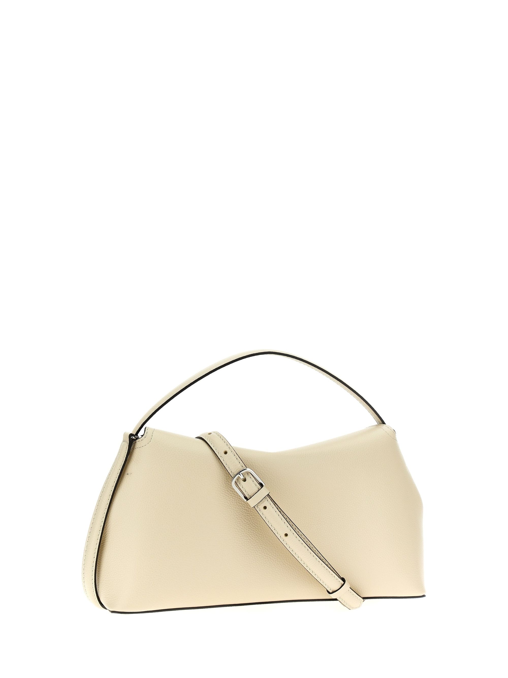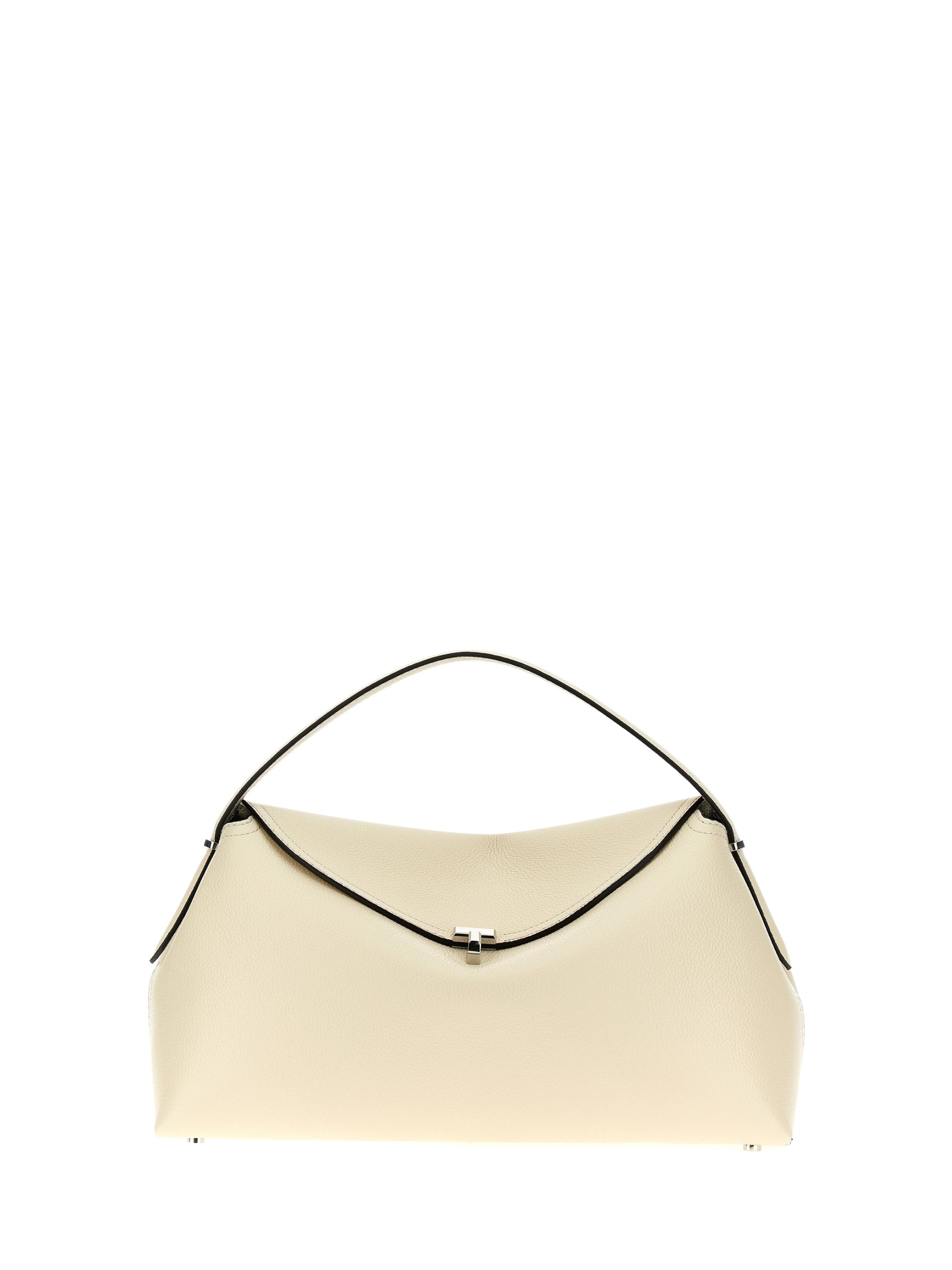 TOTEME white leather T-Lock bag featuring an adjustable and removable shoulder strap, a top flap, a T-lock flap, a card slot, metal feet, and a single compartment. Dimensions: 35 x 18 x 12 cm.