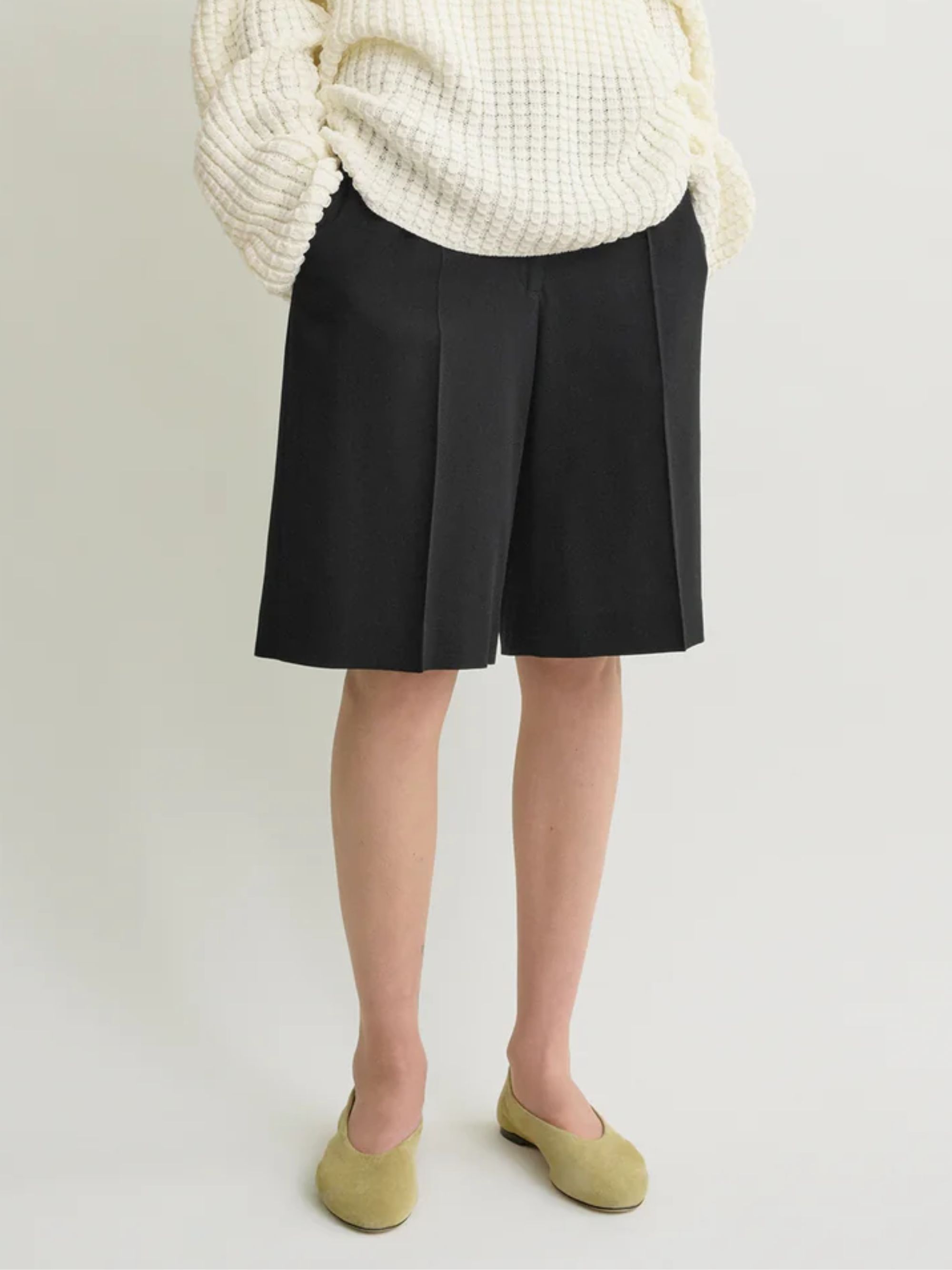 Black viscose and wool shorts by TOTEME, featuring front fastening with hooks, button and zip, belt loops, multiple pockets and central pleat.
