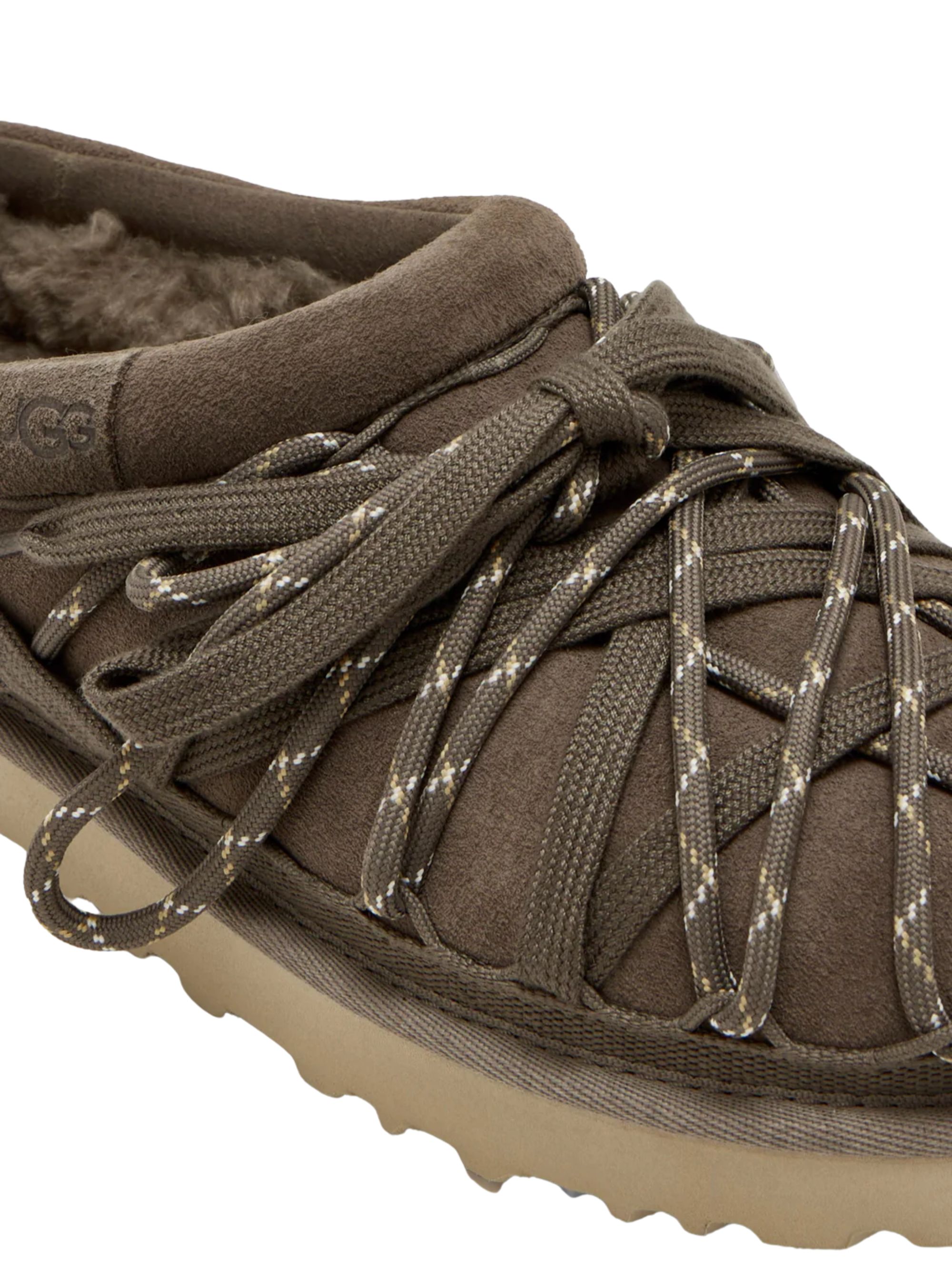 UGG Tasman Lace mules in green suede, featuring a double lacing system, round toe, slip-on design, EVA sole and embossed logo label.