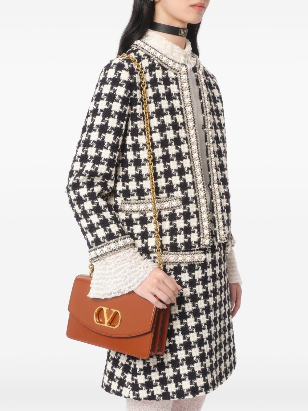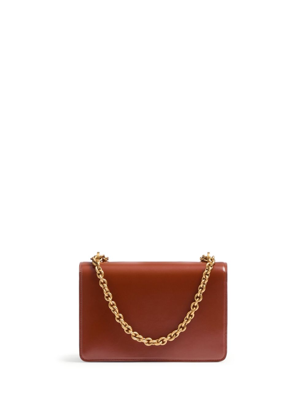 VALENTINO GARAVANI Vain shoulder bag in cognac brown leather with gold hardware, sliding chain shoulder strap, internal zip pocket, signature V logo decoration and foldover top with press stud.