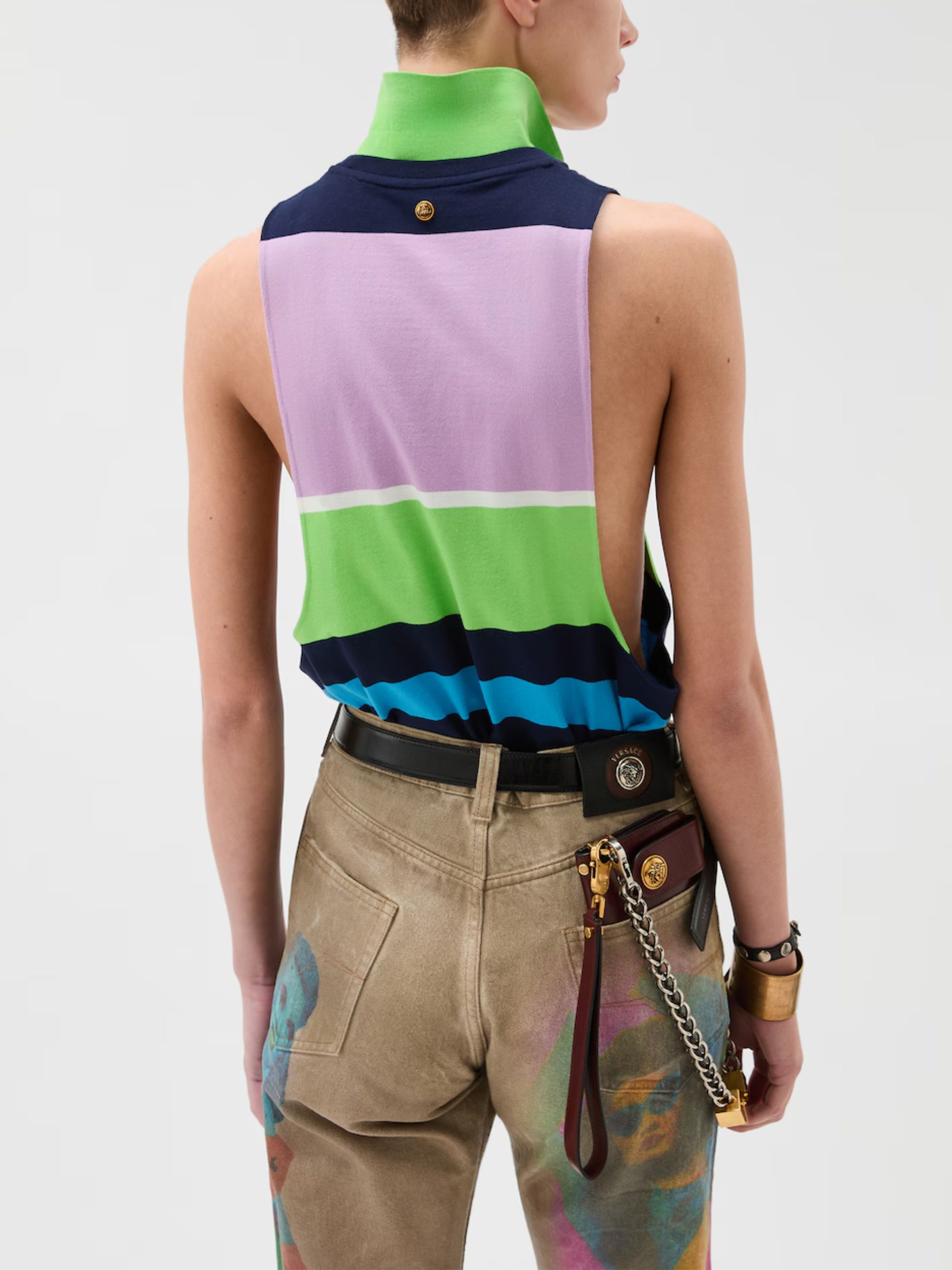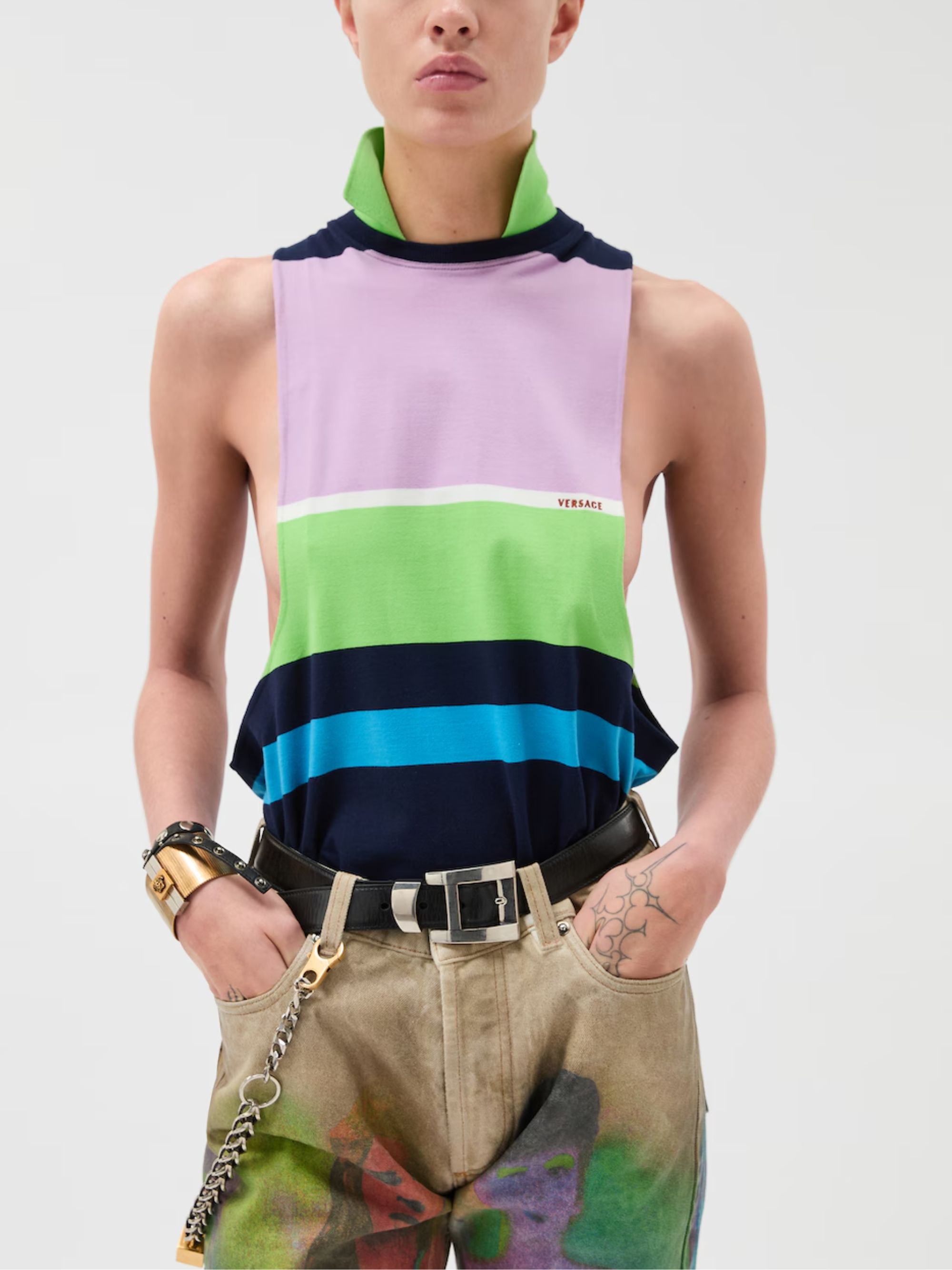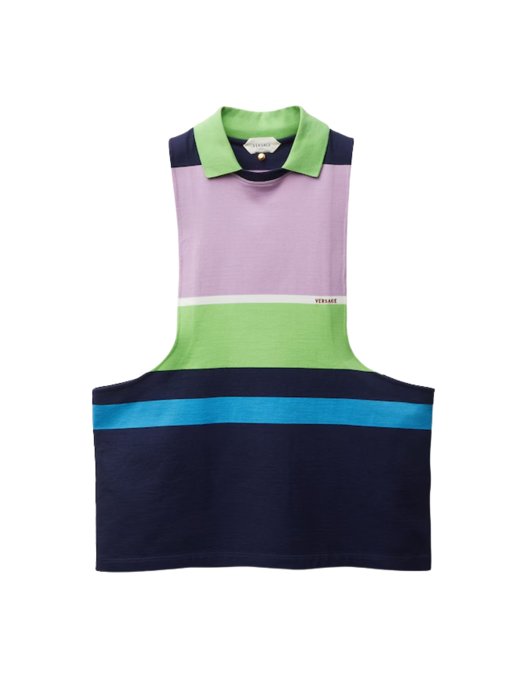 VERSACE multicolor striped top in cotton, featuring Versace logo embroidery, pointed collar, ribbed finishes, deep cutouts and sleeveless.