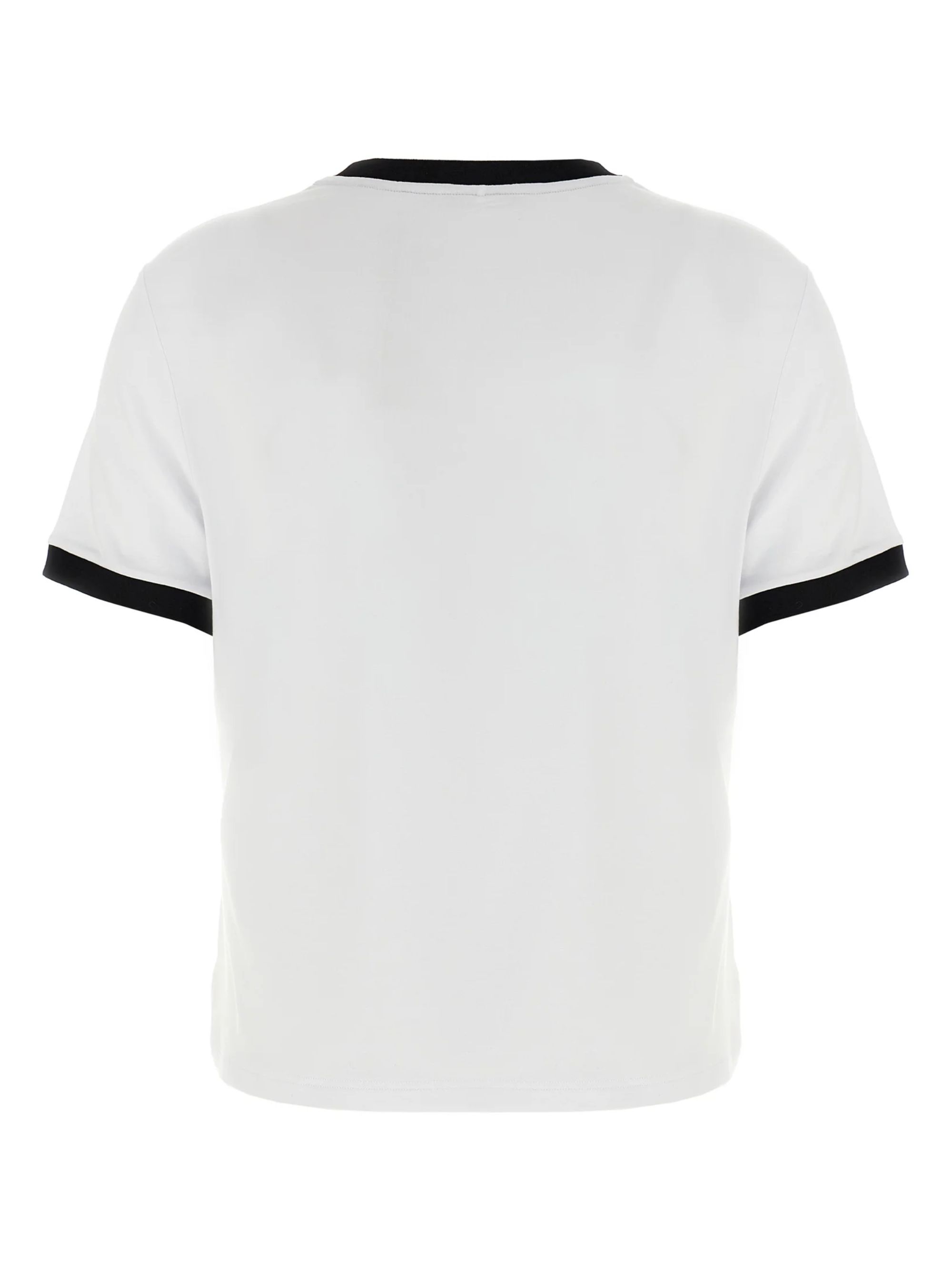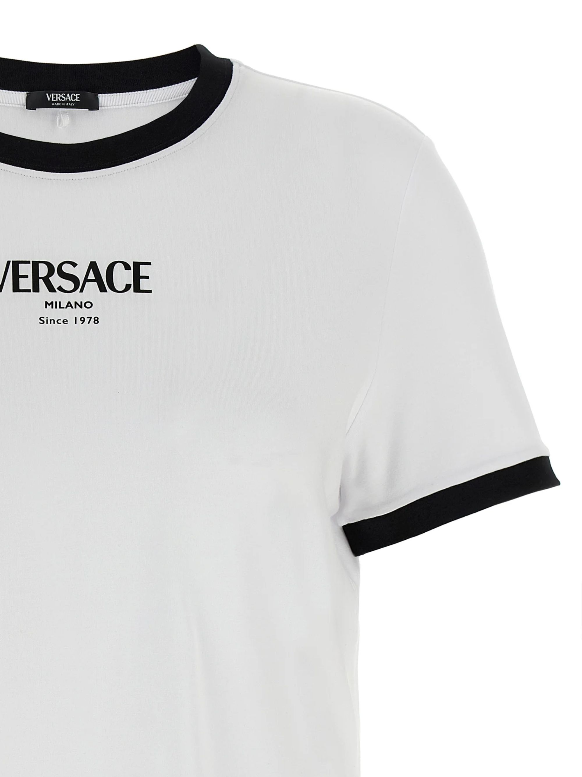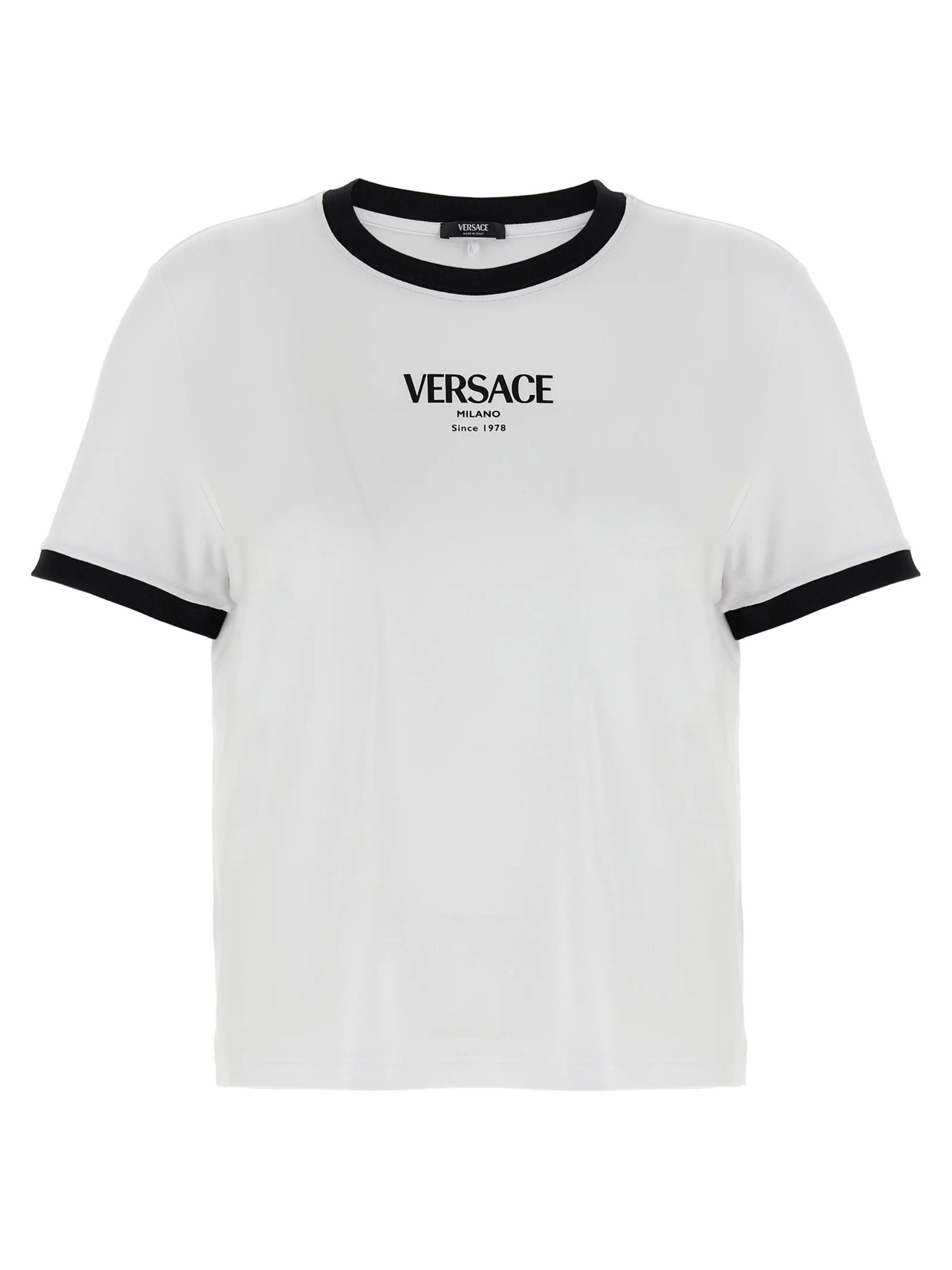 White VERSACE logo T-shirt in viscose, featuring a crew neck, short sleeves, contrasting edges, logo detail on the front and straight hem.