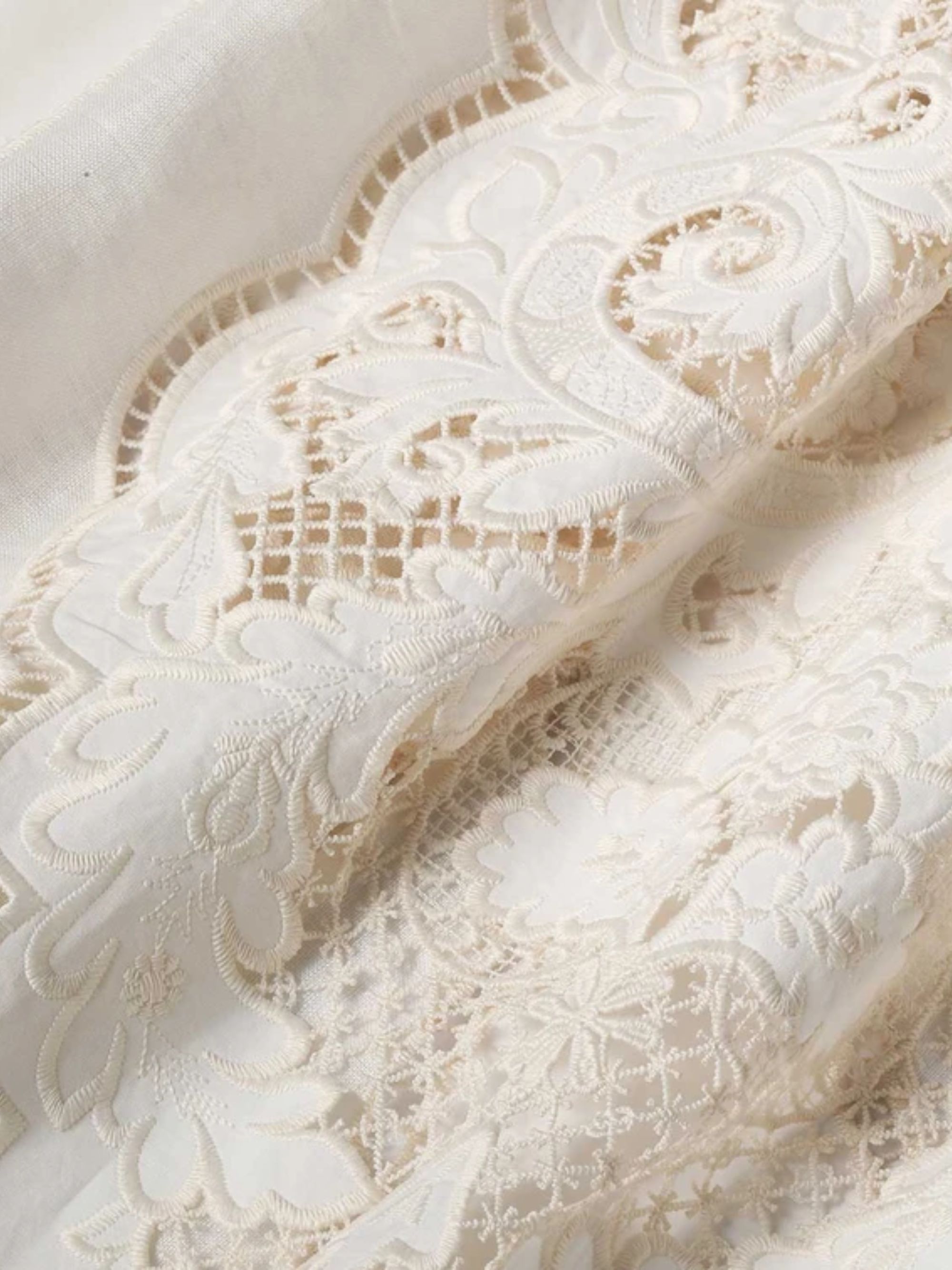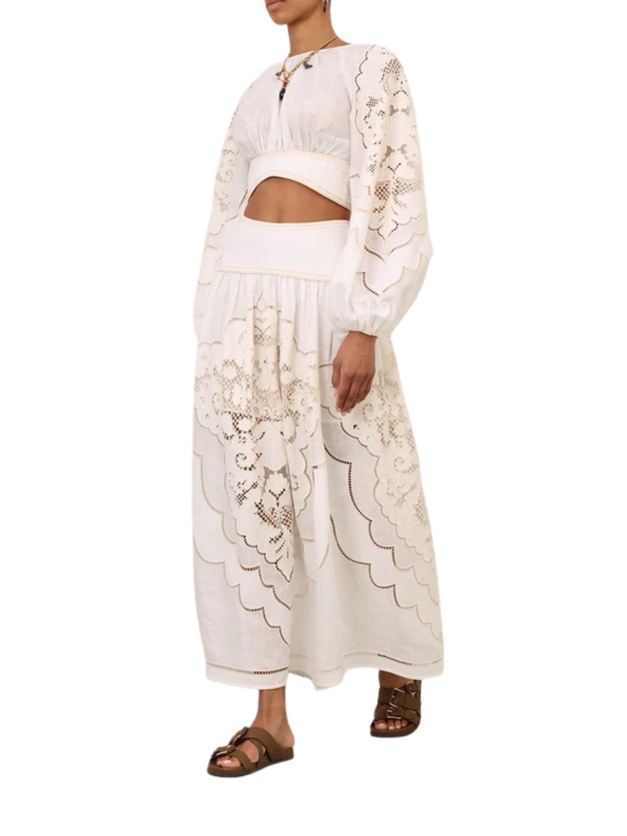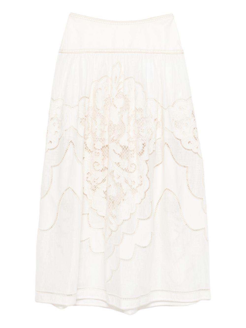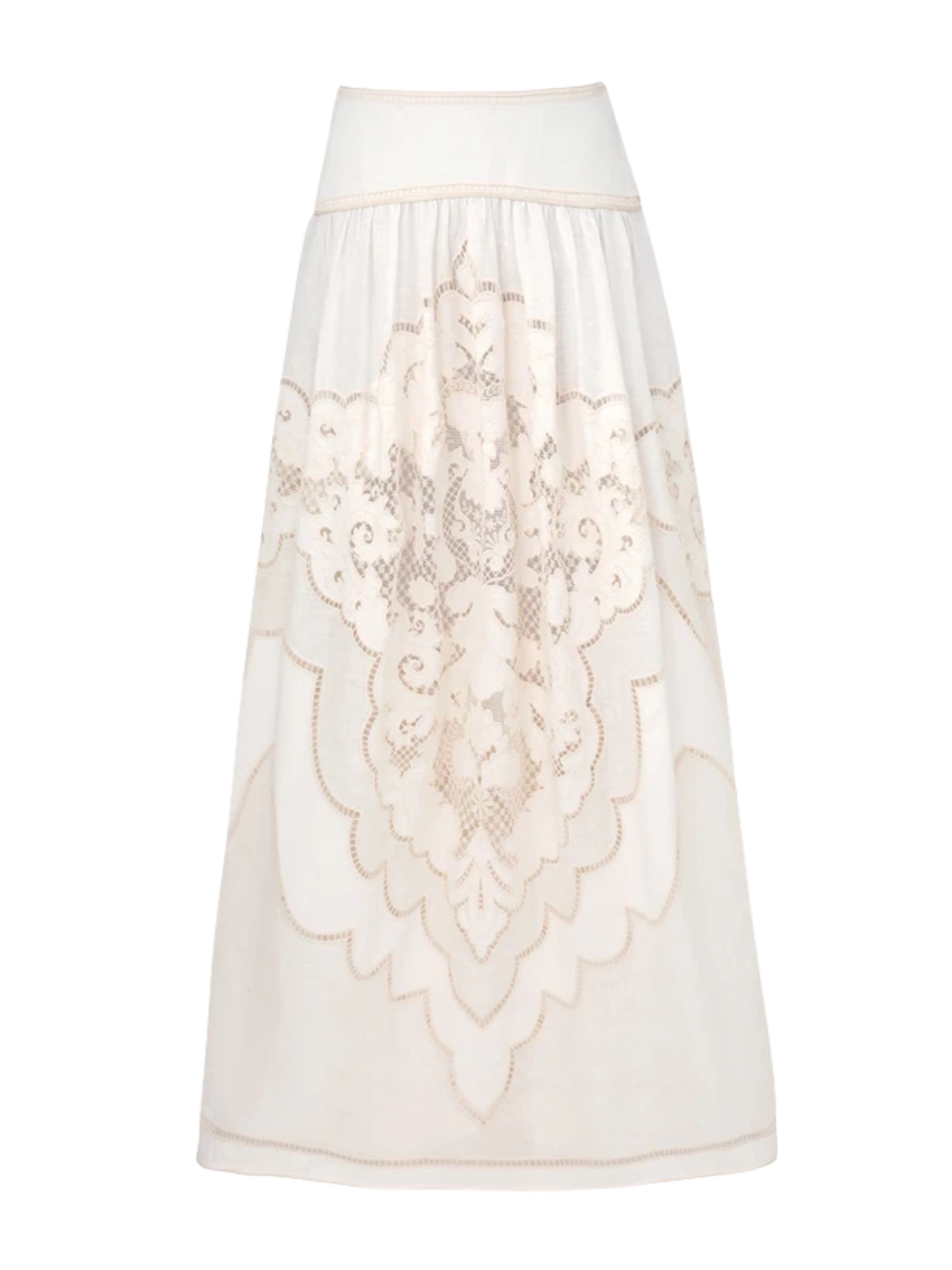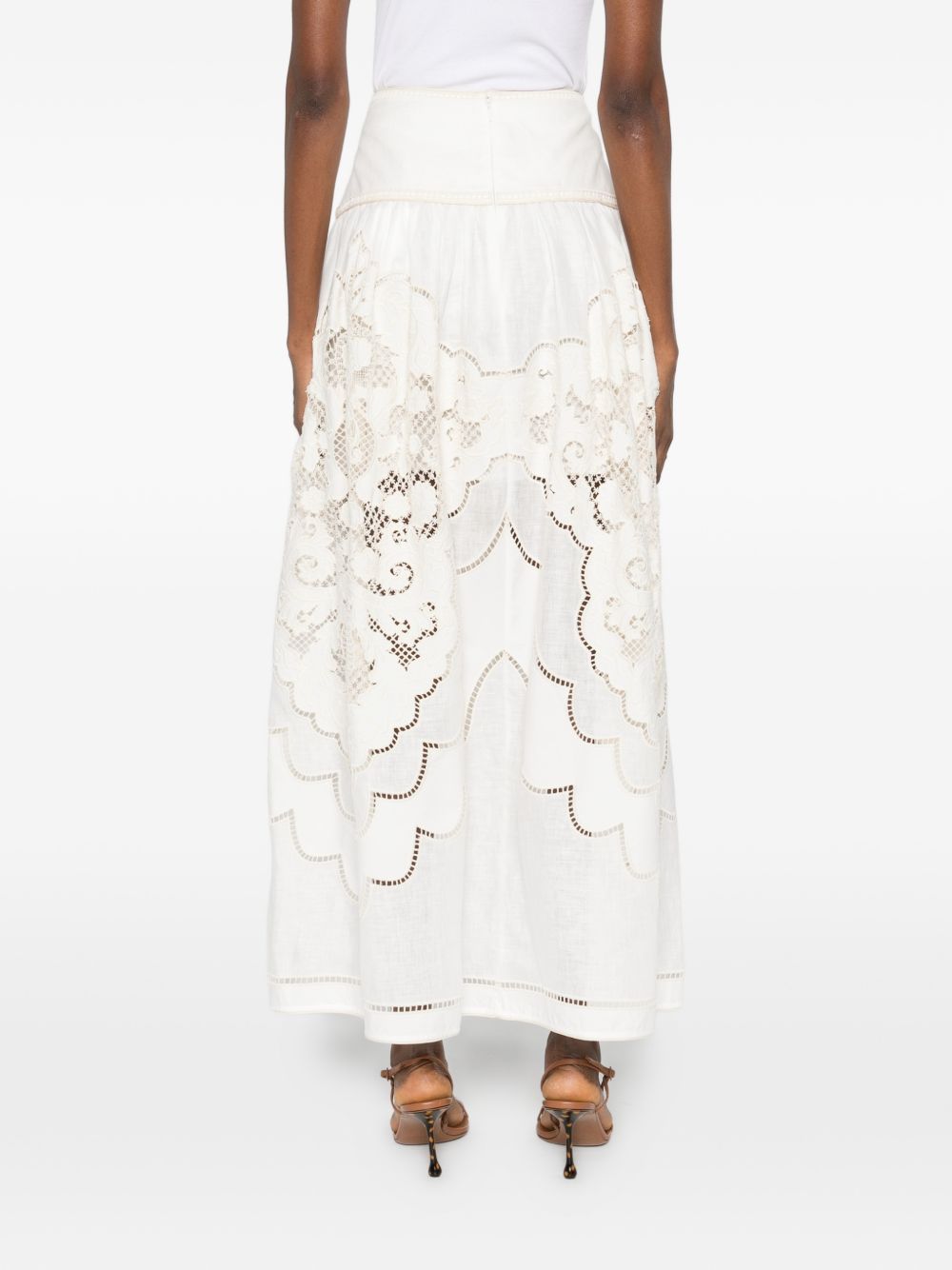 Daylight maxi skirt by ZIMMERMANN in cream linen, featuring a high waist, embroidery, a fixed belt, a gathered silhouette, a short lining and an invisible zip at the back.
