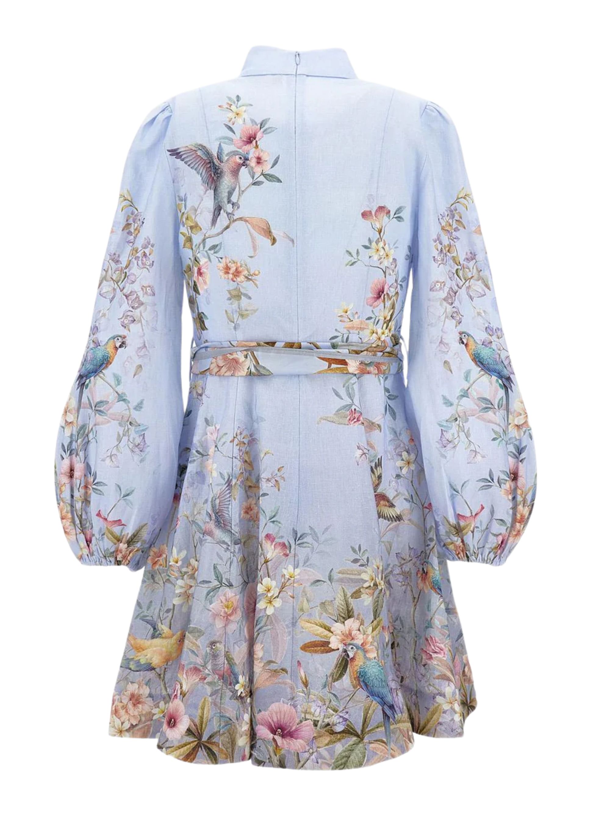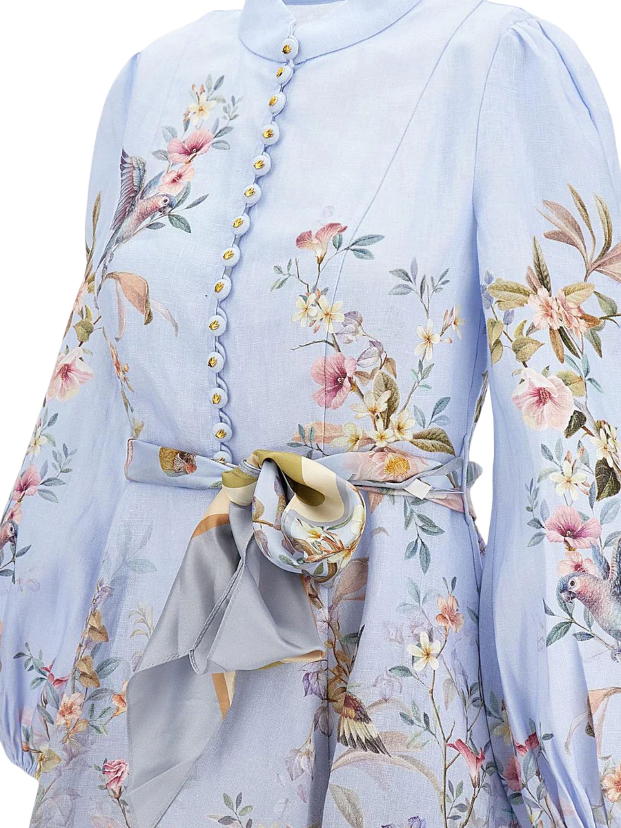 ZIMMERMANN light blue linen Rebellion dress with a high neck, a floral print, a removable scarf belt, a flared skirt, Rouleau buttons on the front bodice, and an invisible zip closure.