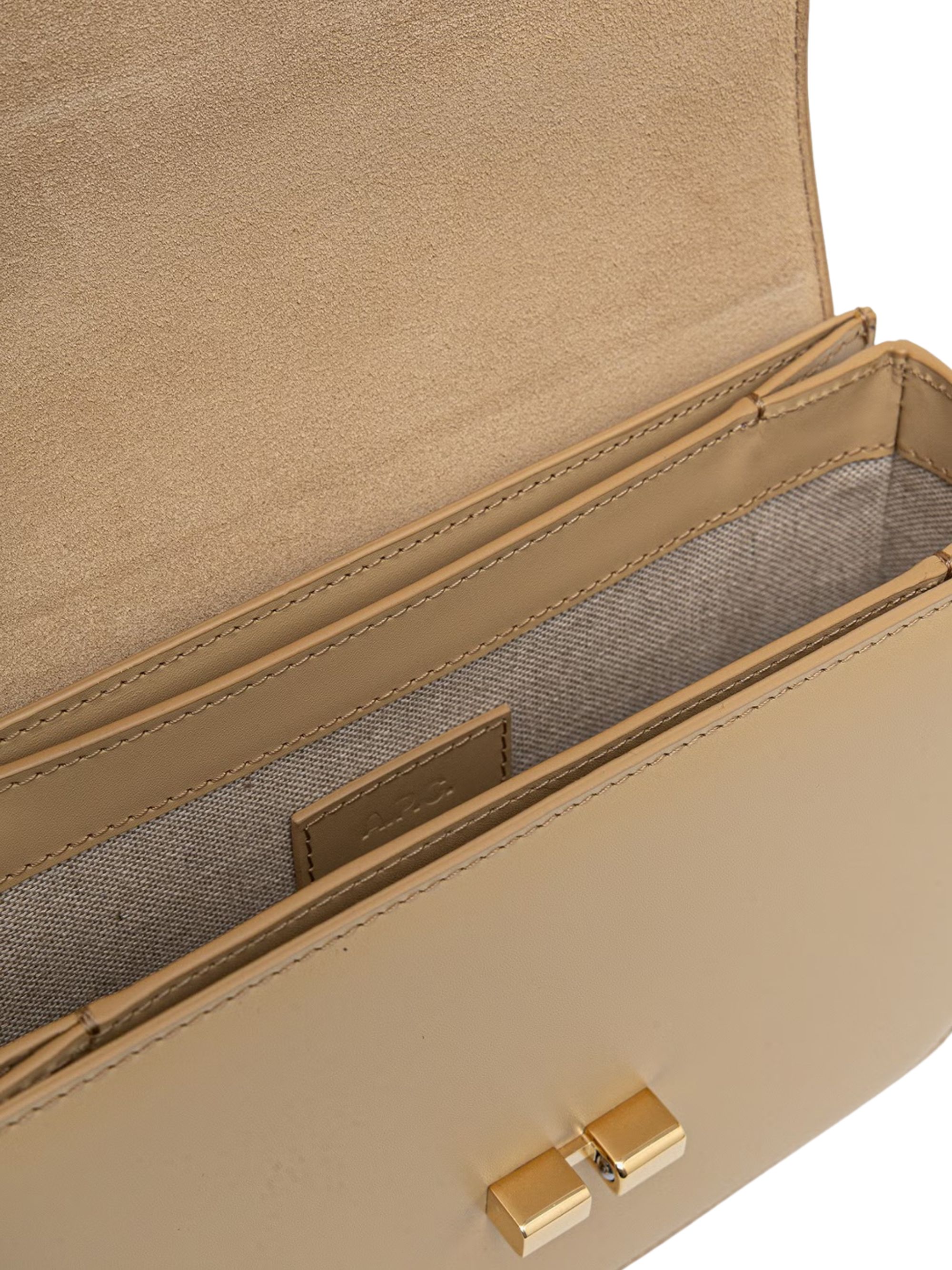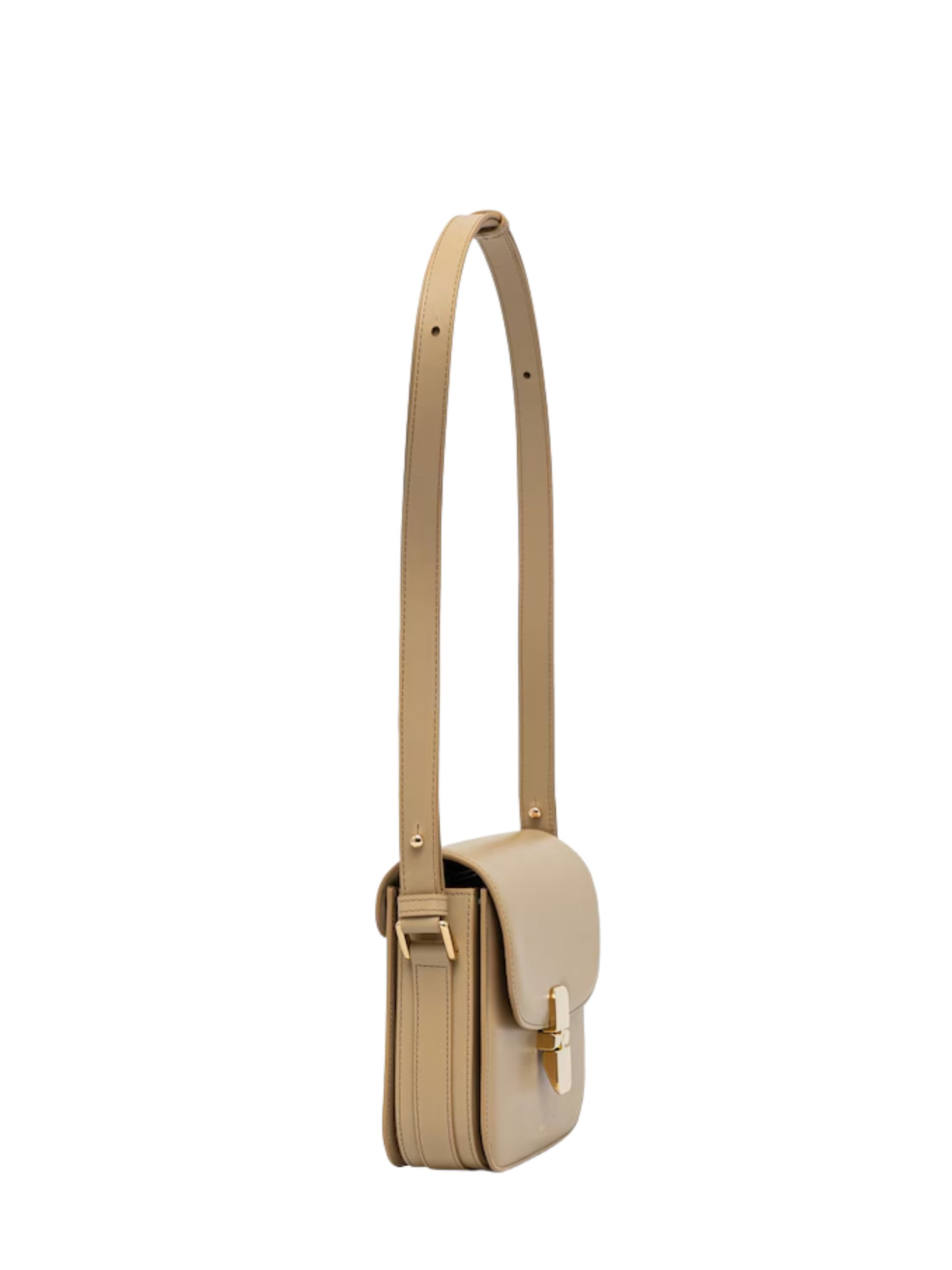 Borsa Grace piccola di A.P.C. marrone in pelle, caratterizzata da tracolla regolabile, chiusura in metallo dorato, patta foderata in pelle scamosciata, logo dorato e hardware oro. Dimensioni: 21 x 17 x 5 CM.