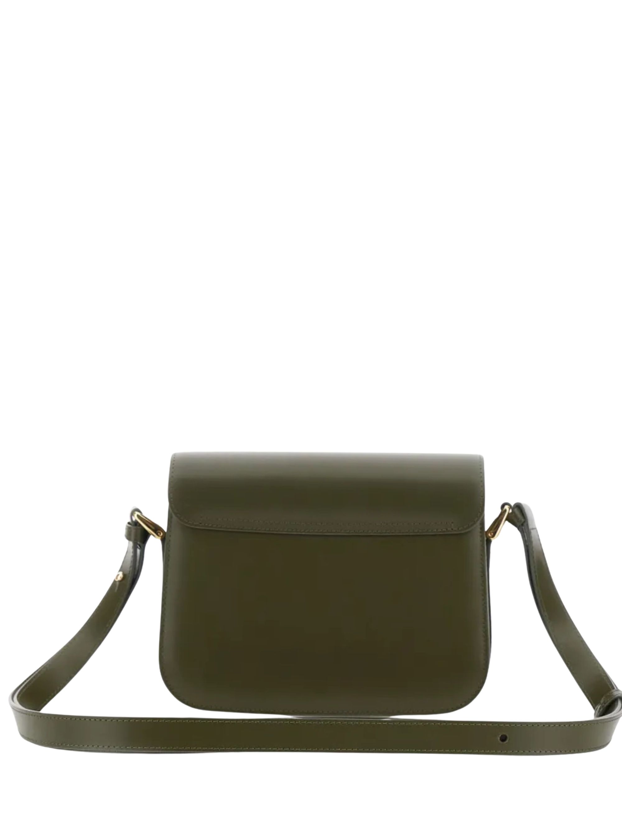 Borsa Grace piccola di A.P.C. kaki in pelle, caratterizzata da tracolla regolabile, chiusura in metallo dorato, patta foderata in pelle scamosciata, logo dorato e hardware oro. Dimensioni: 21 x 17 x 5 CM.