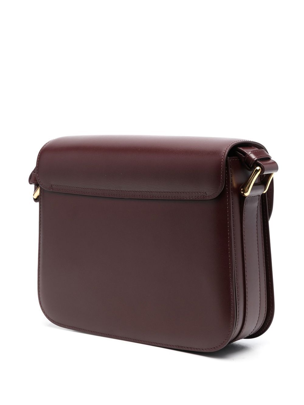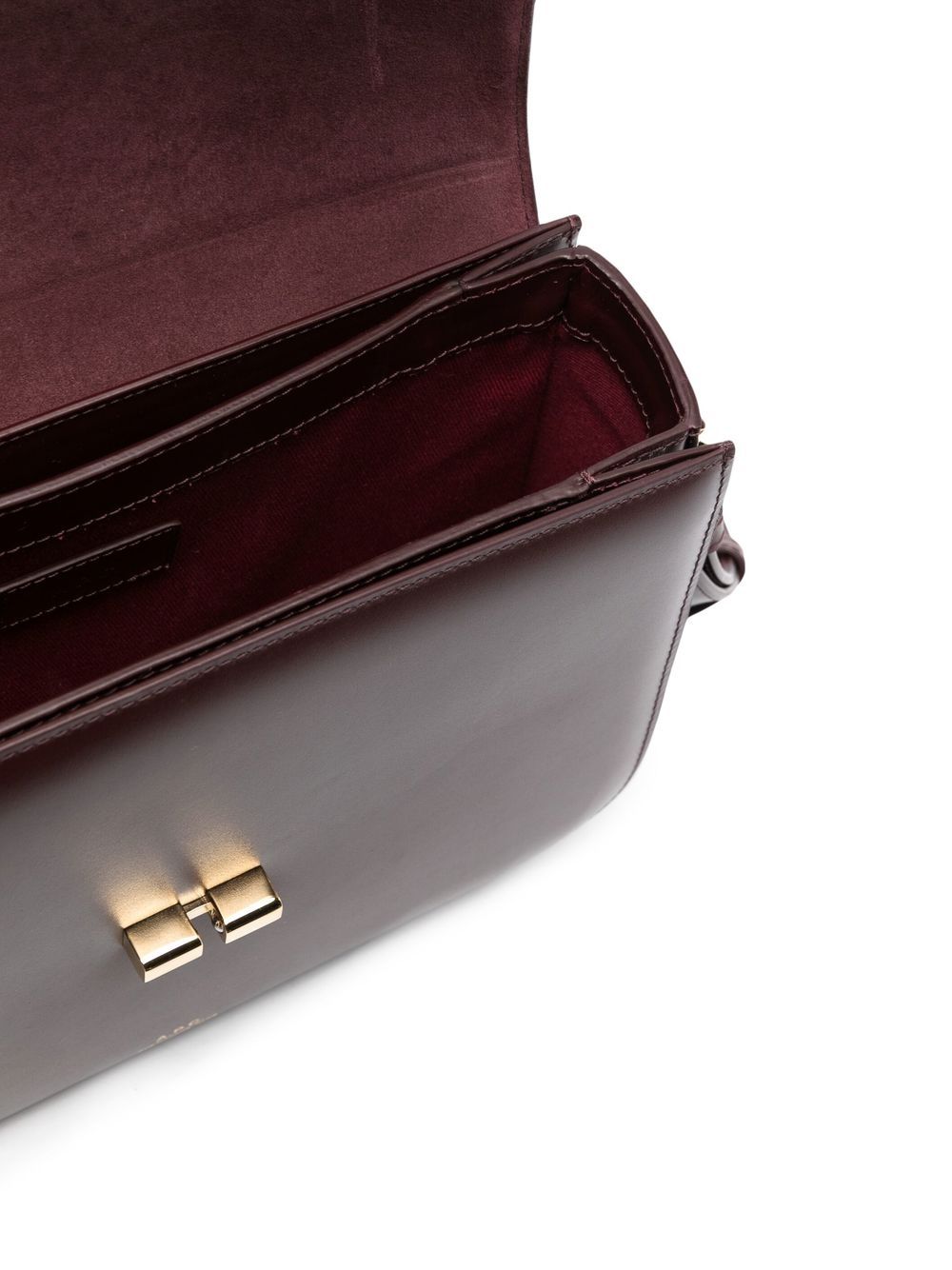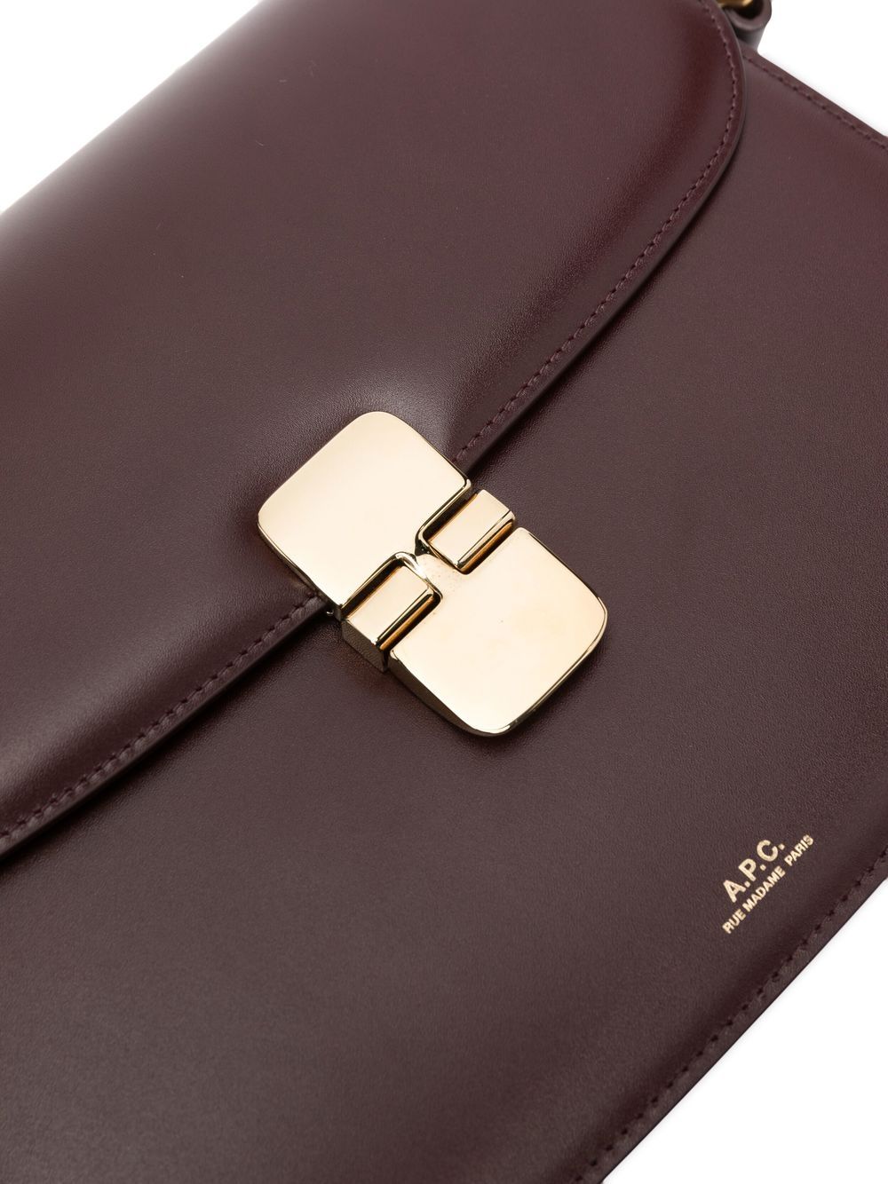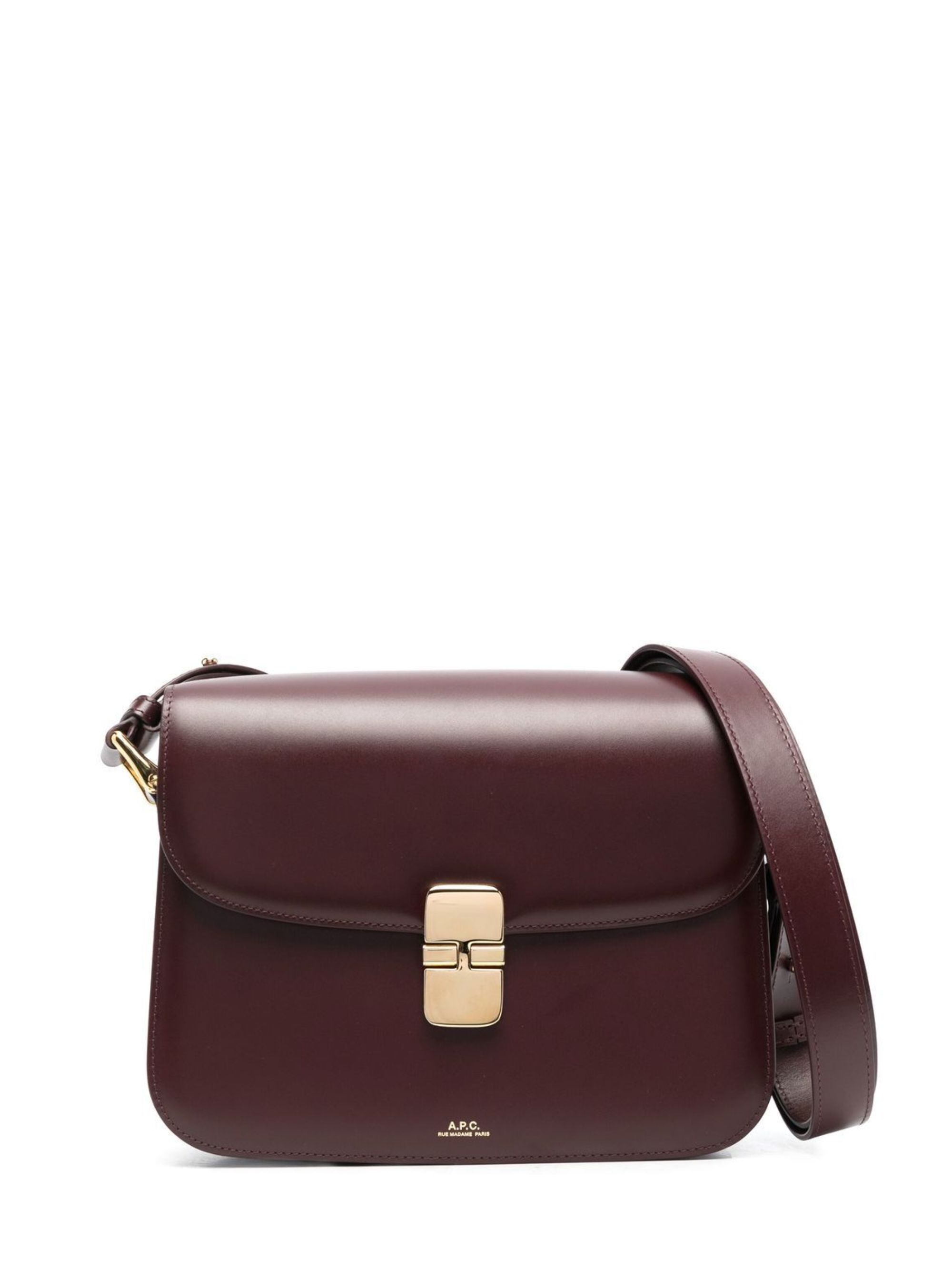 Borsa Grace di A.P.C. bordeaux in pelle, caratterizzata da tracolla regolabile, chiusura color oro, due grandi tashce, logo in rilievo color oro e un grande scomparto. Dimensioni: 24,5 x 20 x 6 CM.